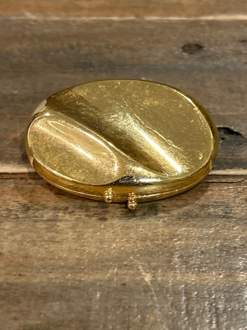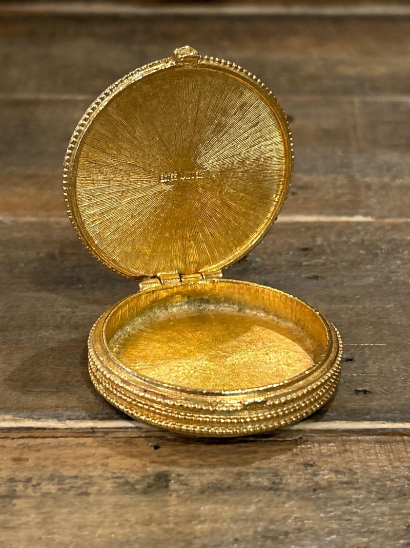 Design: Gilt metal compact with radiating sunburst pattern and beaded edge.
