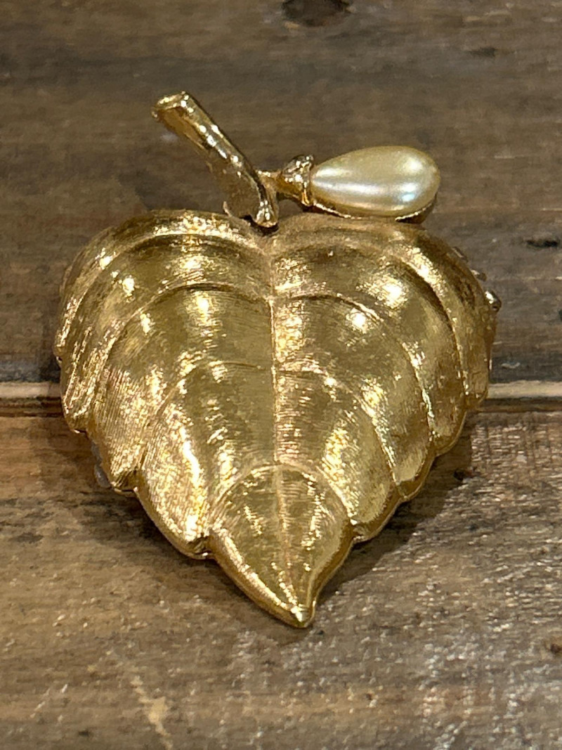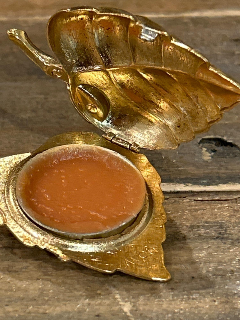 Design: Textured gold-tone leaf with teardrop faux pearl at stem; hinged compartment for solid perfume.