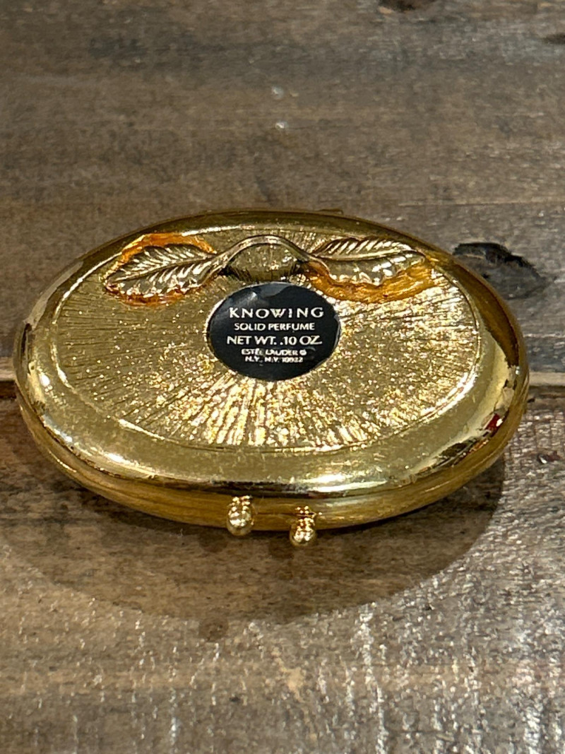 Period: 1970s–1980s. Collecting Note: Classic Estee Lauder vanity compact showcasing the house’s elegant 1970s styling. Estee Lauder “Knowing” Solid Perfume Compact – Leaf Form
