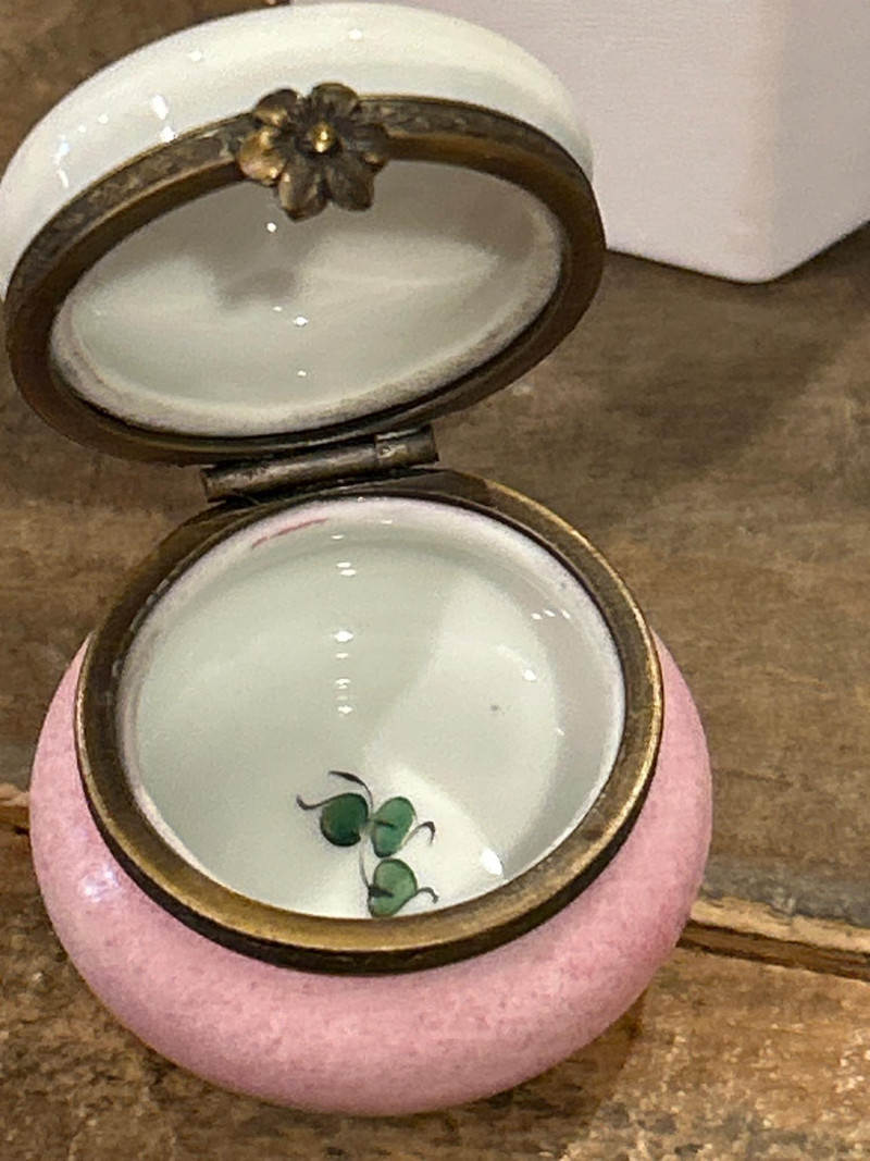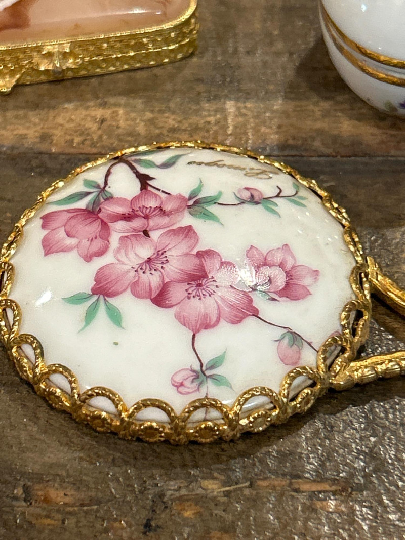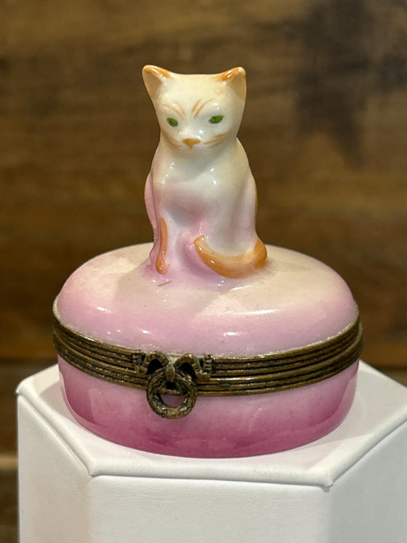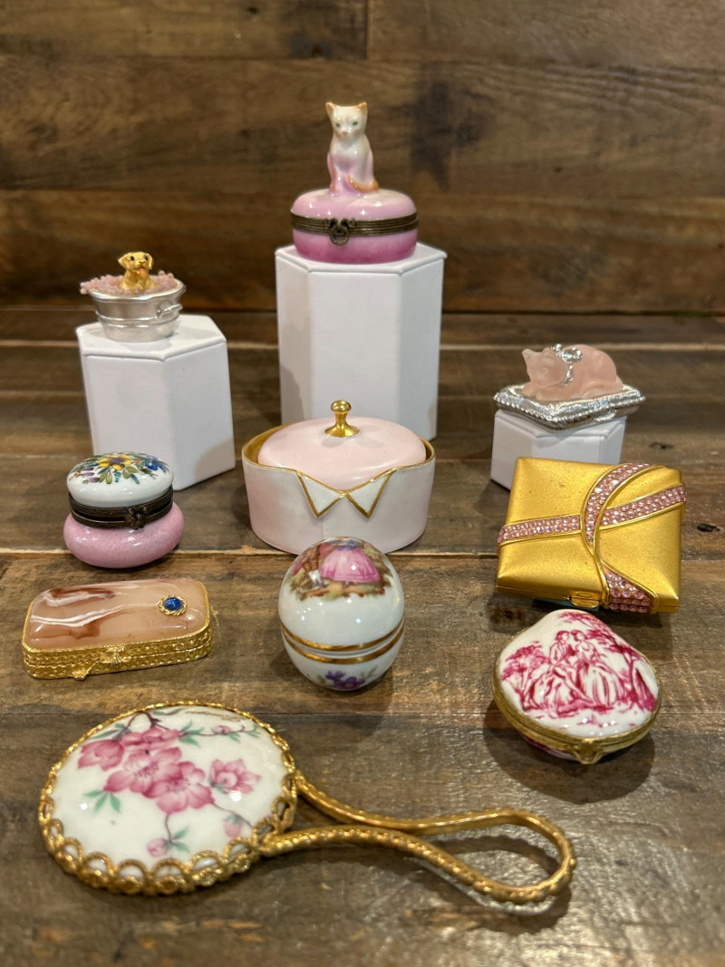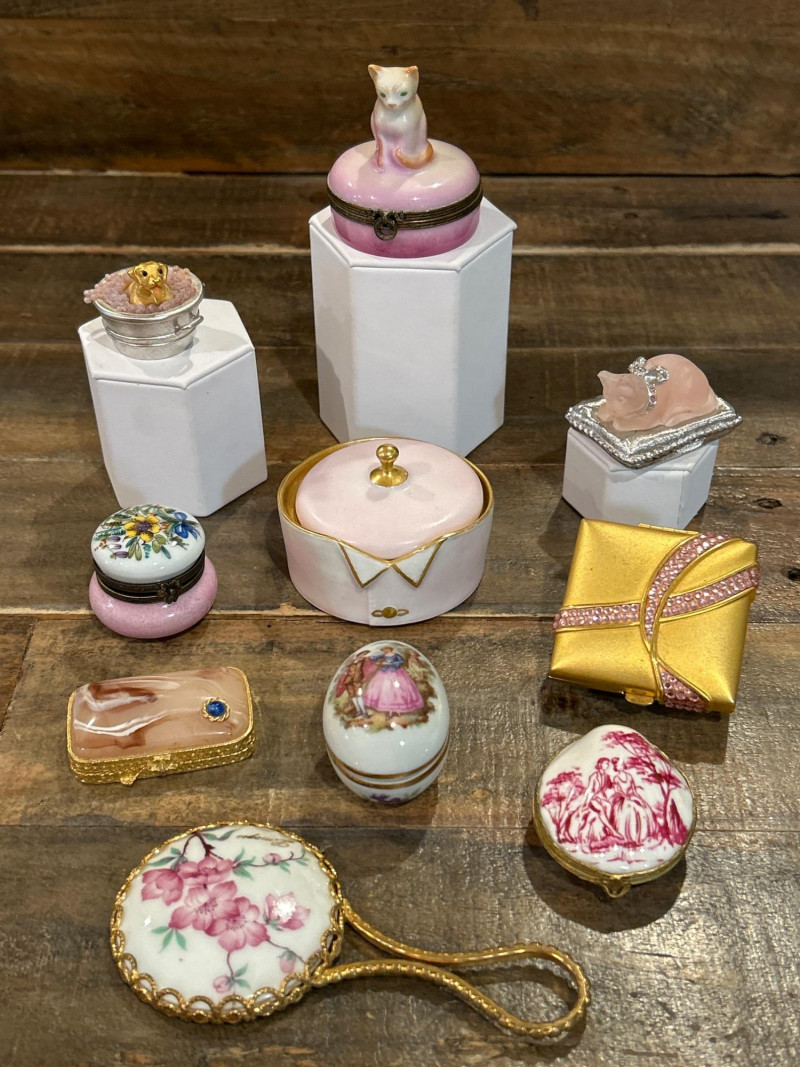 Dimensions: 2.75" tall Material: Hand-painted porcelain with brass mount and clasp Origin: Marked Castel Limoges France, Peint Main Design: Orange-and-white tabby cat atop an ombré pink base with gilt rim detailing Style Notes: A delightful miniature from Limoges—playful feline charm meets refined craftsmanship in a collectible palette. Dimensions: 1.75" tall Material: Silver-tone metal with gold puppy and faux-pearl bubbles Mark: Estée Lauder 2002 Design: Bathtub-shaped compact with hinged lid and traces of original solid perfume Style Notes: From Estée Lauder’s whimsical series—well-detailed, joyful, and highly sought-after by collectors. Dimensions: 2" tall Material: Frosted pink glass with silver-tone pillow base Mark: Estée Lauder 1995 Design: Reclining cat with rhinestone bow collar atop a textured cushion base Style Notes: A fan favorite—elegant frosted finish and jeweled accents make this compact a standout. Dimensions: 1.5" tall Material: Hand-painted enamel over metal with gilt mount Origin: Unmarked; French-style manufacture Design: Round form with colorful floral bouquet under clear glossy enamel Style Notes: Petite and polished—ideal for vanity styling or Limoges-inspired collections. Dimensions: 2.75" wide Material: Porcelain with gilt trim and finial lid Origin: Unmarked; French or Limoges-style Design: Oval pink-and-white form styled as a folded tuxedo collar with raised gold edging Condition: Small chips under lid Style Notes: A witty and elegant vanity accent—rare form with subtle age patina. Dimensions: 1.75" wide Material: Matte gold-tone metal with pink rhinestones Mark: Estée Lauder Design: Square compact with intersecting rhinestone ribbons and interior mirror Style Notes: Created for Estée Lauder’s awareness campaign—radiant, symbolic, and empowering. Dimensions: 2.25" tall Material: Hand-painted porcelain with gilt accents Origin: Marked Limoges France Design: Egg-shaped box with Rococo courting couple and floral borders Style Notes: Classic Limoges romance—fine brushwork and period elegance. Dimensions: 2.25" wide Material: Porcelain with gilt metal mount Origin: Unmarked; likely French or Continental Design: Raspberry-red transfer of a romantic couple in a pastoral landscape Style Notes: Evokes 18th-century engravings—graceful and decorative, ideal for display. Dimensions: 2.25" wide Material: Gold-tone metal with swirled faux-agate enamel and blue cabochon clasp Mark: Estée Lauder 1974 Design: Rectangular compact for Youth Dew perfume; retains faint perfume traces Style Notes: One of Estée Lauder’s earliest designs—vintage opulence with timeless appeal. Dimensions: 4" long Material: Porcelain with gilt metal frame and handle Origin: Unmarked; French-style, mid-20th century Design: Hand-painted cherry blossom motif framed in ormolu gilt metal Style Notes: A delicate vanity piece—pairs beautifully with Limoges and enamel boxes.1 – Castel Limoges “Kitty Cat” Trinket Box