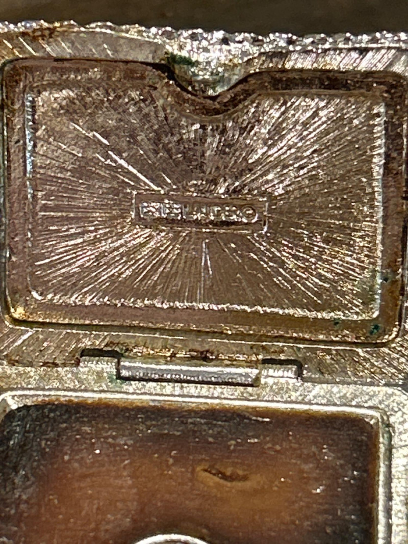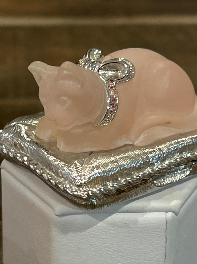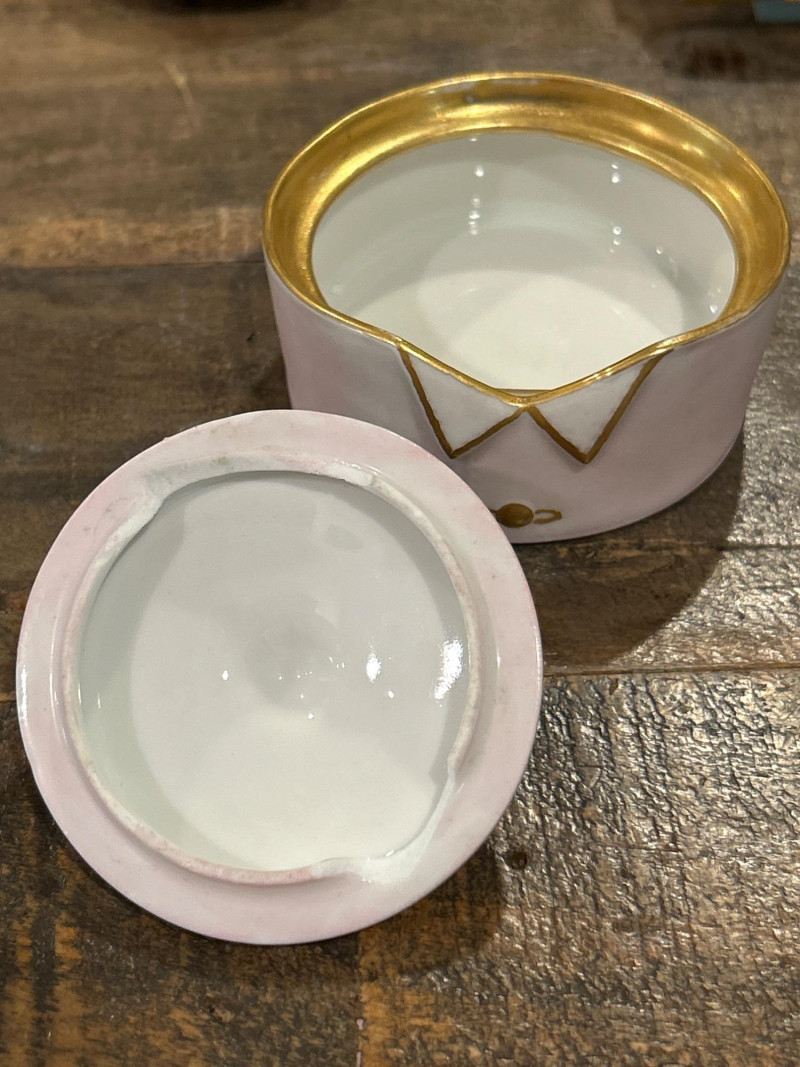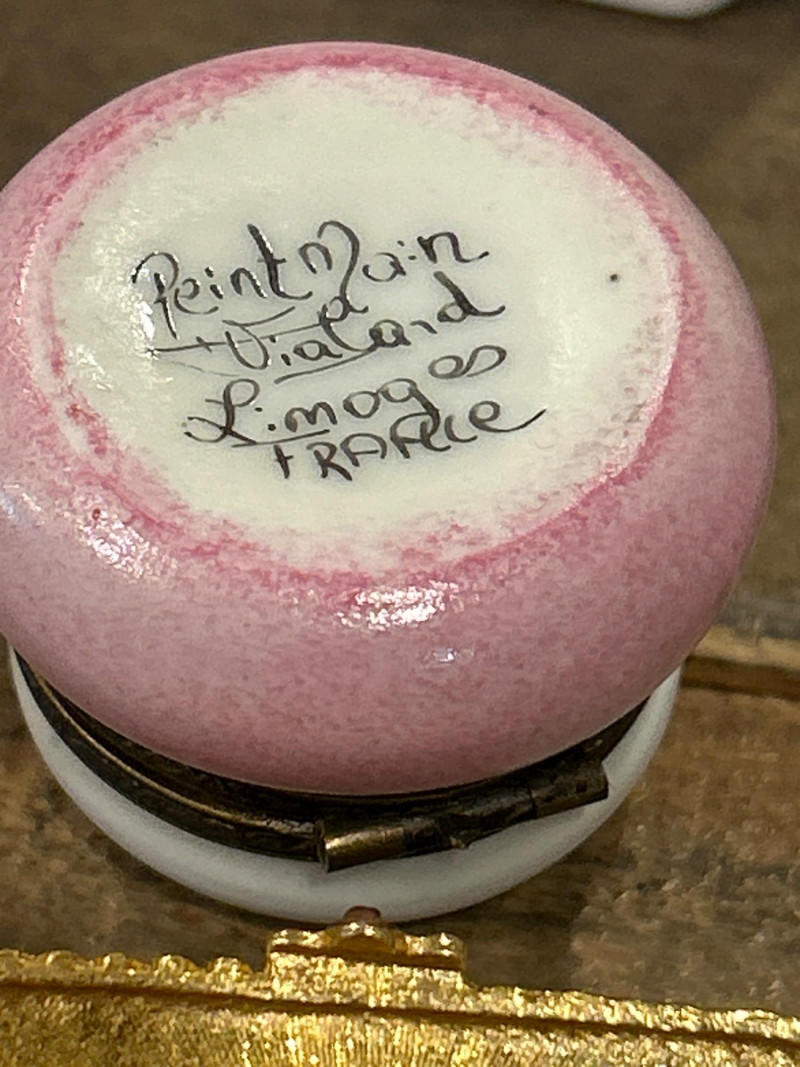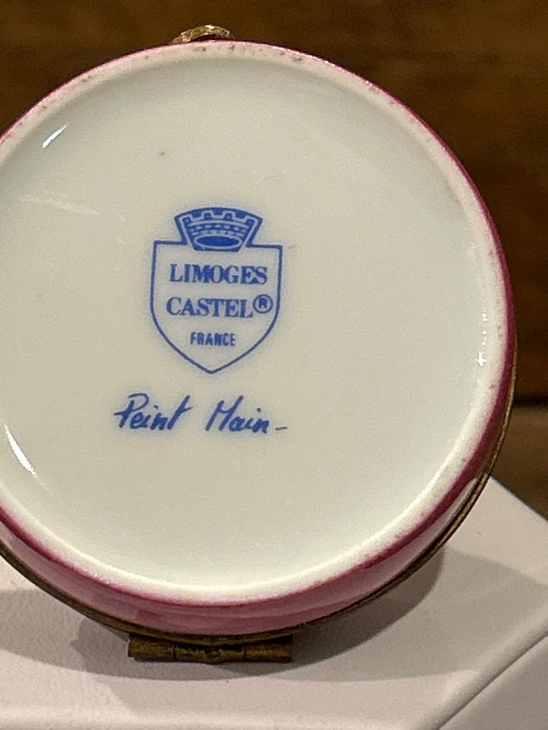 Dimensions: 2.75" tall Material: Hand-painted porcelain with brass mount and clasp Origin: Marked Castel Limoges France, Peint Main Design: Orange-and-white tabby cat atop an ombré pink base with gilt rim detailing Style Notes: A delightful miniature from Limoges—playful feline charm meets refined craftsmanship in a collectible palette. Dimensions: 1.75" tall Material: Silver-tone metal with gold puppy and faux-pearl bubbles Mark: Estée Lauder 2002 Design: Bathtub-shaped compact with hinged lid and traces of original solid perfume Style Notes: From Estée Lauder’s whimsical series—well-detailed, joyful, and highly sought-after by collectors. Dimensions: 2" tall Material: Frosted pink glass with silver-tone pillow base Mark: Estée Lauder 1995 Design: Reclining cat with rhinestone bow collar atop a textured cushion base Style Notes: A fan favorite—elegant frosted finish and jeweled accents make this compact a standout. Dimensions: 1.5" tall Material: Hand-painted enamel over metal with gilt mount Origin: Unmarked; French-style manufacture Design: Round form with colorful floral bouquet under clear glossy enamel Style Notes: Petite and polished—ideal for vanity styling or Limoges-inspired collections. Dimensions: 2.75" wide Material: Porcelain with gilt trim and finial lid Origin: Unmarked; French or Limoges-style Design: Oval pink-and-white form styled as a folded tuxedo collar with raised gold edging Condition: Small chips under lid Style Notes: A witty and elegant vanity accent—rare form with subtle age patina. Dimensions: 1.75" wide Material: Matte gold-tone metal with pink rhinestones Mark: Estée Lauder Design: Square compact with intersecting rhinestone ribbons and interior mirror Style Notes: Created for Estée Lauder’s awareness campaign—radiant, symbolic, and empowering. Dimensions: 2.25" tall Material: Hand-painted porcelain with gilt accents Origin: Marked Limoges France Design: Egg-shaped box with Rococo courting couple and floral borders Style Notes: Classic Limoges romance—fine brushwork and period elegance. Dimensions: 2.25" wide Material: Porcelain with gilt metal mount Origin: Unmarked; likely French or Continental Design: Raspberry-red transfer of a romantic couple in a pastoral landscape Style Notes: Evokes 18th-century engravings—graceful and decorative, ideal for display. Dimensions: 2.25" wide Material: Gold-tone metal with swirled faux-agate enamel and blue cabochon clasp Mark: Estée Lauder 1974 Design: Rectangular compact for Youth Dew perfume; retains faint perfume traces Style Notes: One of Estée Lauder’s earliest designs—vintage opulence with timeless appeal. Dimensions: 4" long Material: Porcelain with gilt metal frame and handle Origin: Unmarked; French-style, mid-20th century Design: Hand-painted cherry blossom motif framed in ormolu gilt metal Style Notes: A delicate vanity piece—pairs beautifully with Limoges and enamel boxes.1 – Castel Limoges “Kitty Cat” Trinket Box