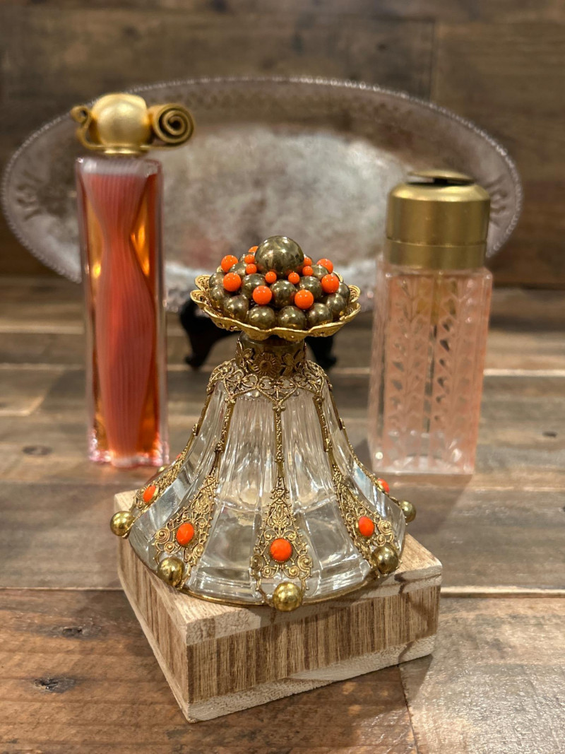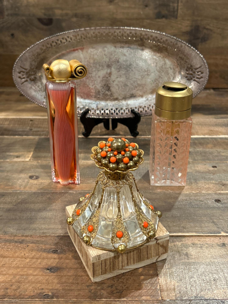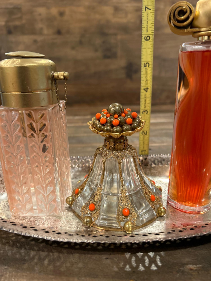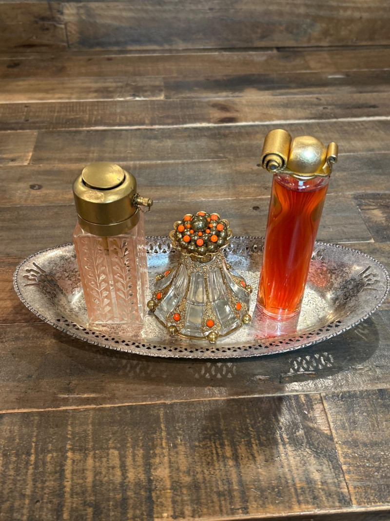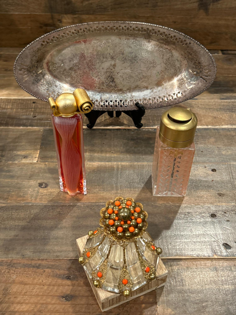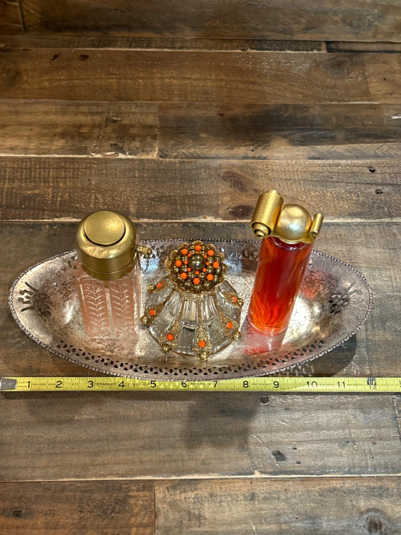 Maker: Irving W. Rice & Co., New York Origin: Made in Czechoslovakia Material: Cut glass with gilt filigree and orange cabochon accents Mark: Paper label “An Irice Import – Made in Czechoslovakia – Irving W. Rice & Co. Inc. N.Y.” Dimensions: Approx. 5.5” tall Details: Bell-shaped crystal body with ornate brass filigree panels inset with orange glass cabochons. Crown-style stopper and bead finials evoke early Art Deco elegance. Collecting Note: Imported in the 1930s–40s, often crafted in collaboration with Bohemian glassworks. Prized for its intricate metalwork and Deco styling. Maker/Designer: Givenchy, France Material: Clear and frosted glass with sculptural swirl design Mark: “Organza Givenchy” and embossed “Made in France” with GS mark Dimensions: Approx. 7.25” tall Details: Slender bottle with sensuous curves and a spiral gold-tone cap. Contains original red-gold hue perfume. Collecting Note: Released in 1996, this bottle is celebrated for its fusion of classic French luxury and modern sculpture. Maker: Unknown (European, possibly Czech) Material: Pink molded glass with etched leaf motif and brass hinged cap Dimensions: Approx. 5.25” tall Details: Square-section bottle with vertical leaf etching and a hinged metal top with chain. May have been converted from atomizer or powder dispenser. Collecting Note: Reflects early-to-mid 20th century vanity design with geometric Art Deco influence. Maker: Viking Plate, Canada (under Oneida) Material: Silver-plated copper (E.P. Copper) Mark: “Viking Plate – Made in Canada – E.P. Copper” Dimensions: Approx. 10” L × 6.25” W Details: Oval pierced gallery tray with scroll engraving, beaded rim, and a gently aged patina. Collecting Note: Known for high-quality electroplated wares, Viking Plate pieces are sought after for their craftsmanship and decorative appeal.Irice Czechoslovakia Perfume Bottle