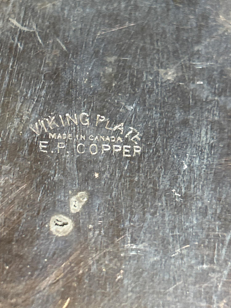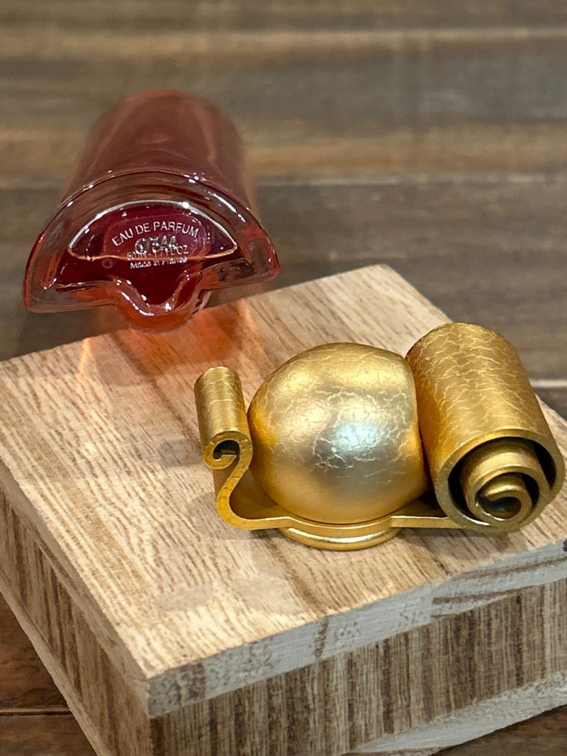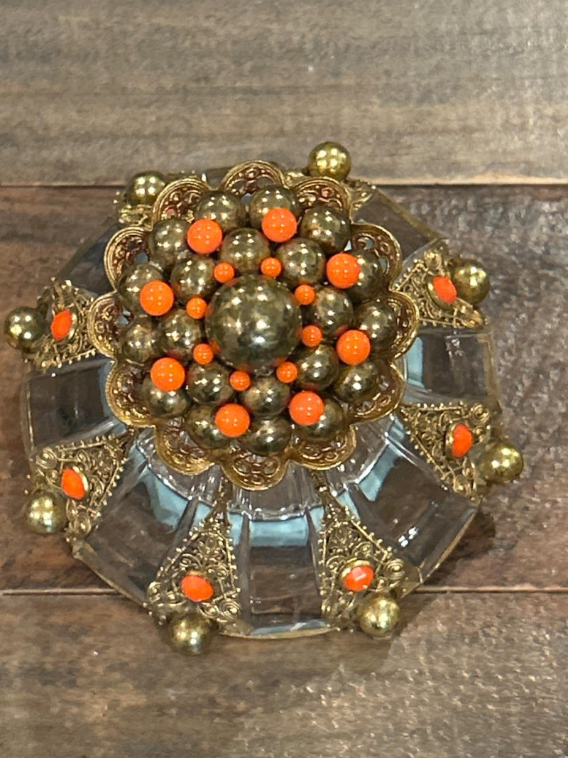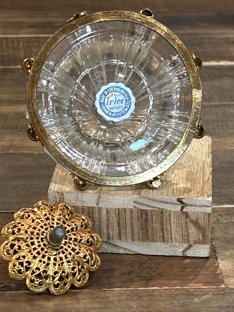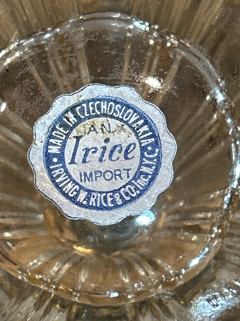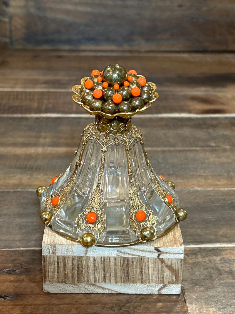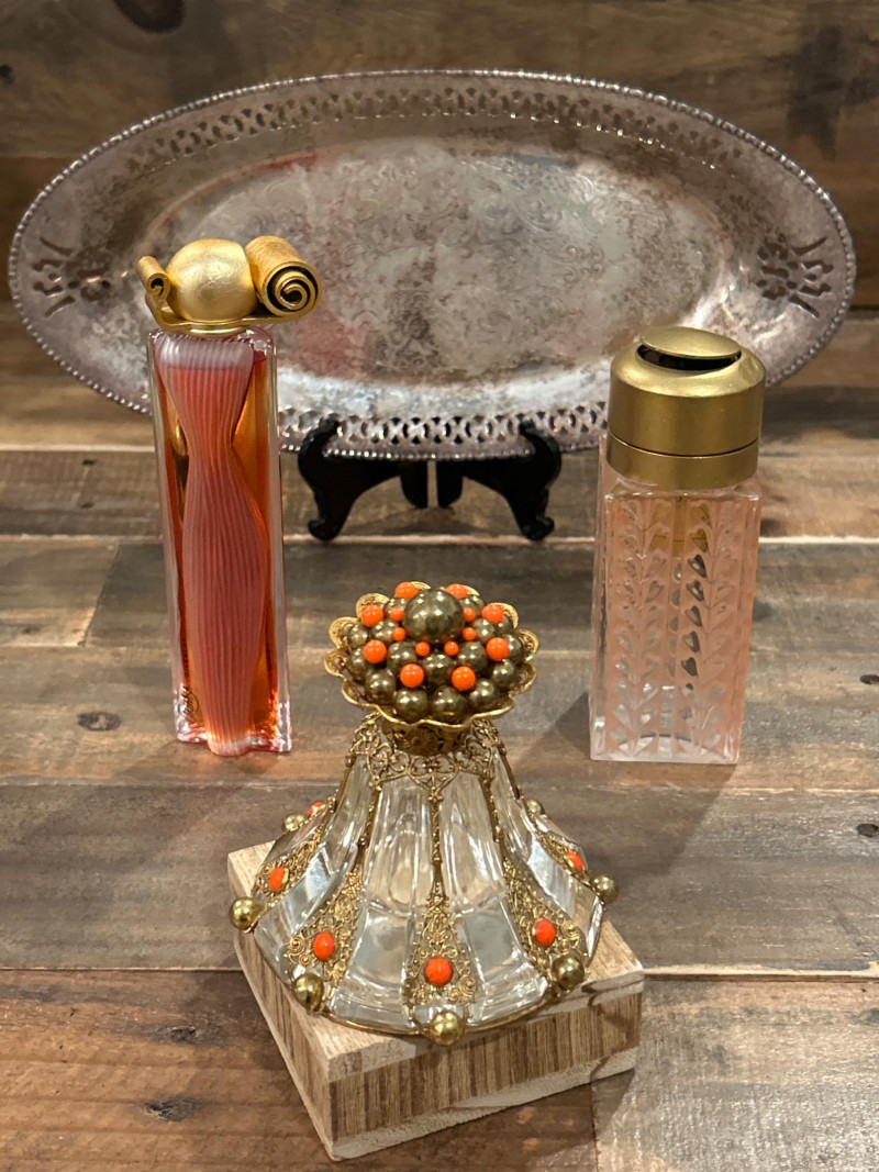 Maker: Irving W. Rice & Co., New York Origin: Made in Czechoslovakia Material: Cut glass with gilt filigree and orange cabochon accents Mark: Paper label “An Irice Import – Made in Czechoslovakia – Irving W. Rice & Co. Inc. N.Y.” Dimensions: Approx. 5.5” tall Details: Bell-shaped crystal body with ornate brass filigree panels inset with orange glass cabochons. Crown-style stopper and bead finials evoke early Art Deco elegance. Collecting Note: Imported in the 1930s–40s, often crafted in collaboration with Bohemian glassworks. Prized for its intricate metalwork and Deco styling. Maker/Designer: Givenchy, France Material: Clear and frosted glass with sculptural swirl design Mark: “Organza Givenchy” and embossed “Made in France” with GS mark Dimensions: Approx. 7.25” tall Details: Slender bottle with sensuous curves and a spiral gold-tone cap. Contains original red-gold hue perfume. Collecting Note: Released in 1996, this bottle is celebrated for its fusion of classic French luxury and modern sculpture. Maker: Unknown (European, possibly Czech) Material: Pink molded glass with etched leaf motif and brass hinged cap Dimensions: Approx. 5.25” tall Details: Square-section bottle with vertical leaf etching and a hinged metal top with chain. May have been converted from atomizer or powder dispenser. Collecting Note: Reflects early-to-mid 20th century vanity design with geometric Art Deco influence. Maker: Viking Plate, Canada (under Oneida) Material: Silver-plated copper (E.P. Copper) Mark: “Viking Plate – Made in Canada – E.P. Copper” Dimensions: Approx. 10” L × 6.25” W Details: Oval pierced gallery tray with scroll engraving, beaded rim, and a gently aged patina. Collecting Note: Known for high-quality electroplated wares, Viking Plate pieces are sought after for their craftsmanship and decorative appeal.Irice Czechoslovakia Perfume Bottle