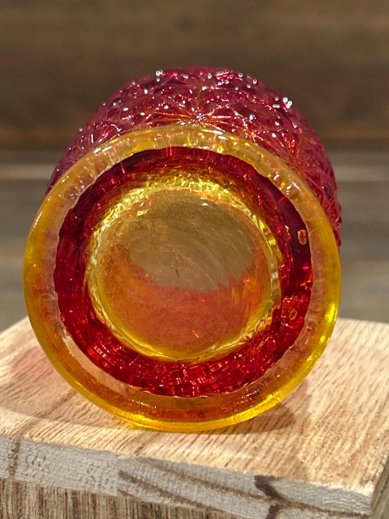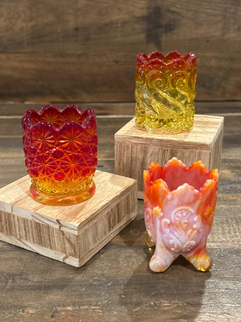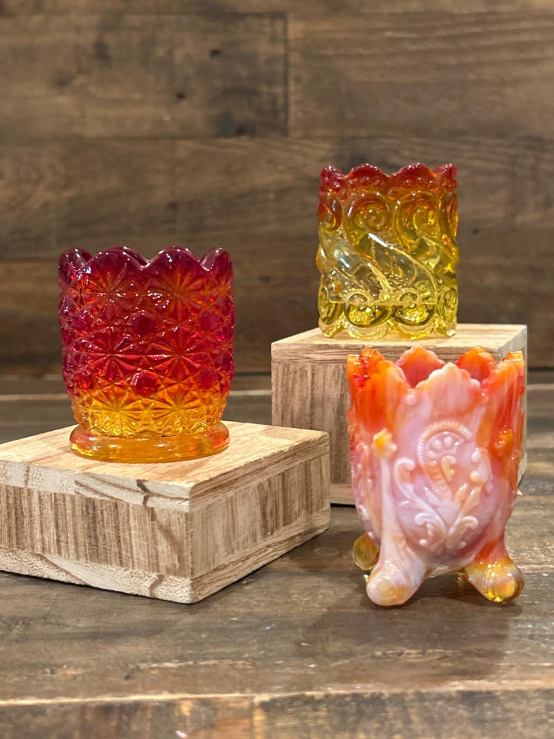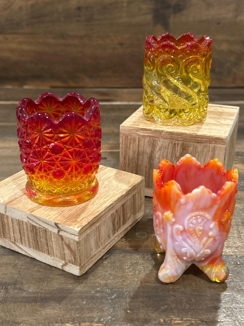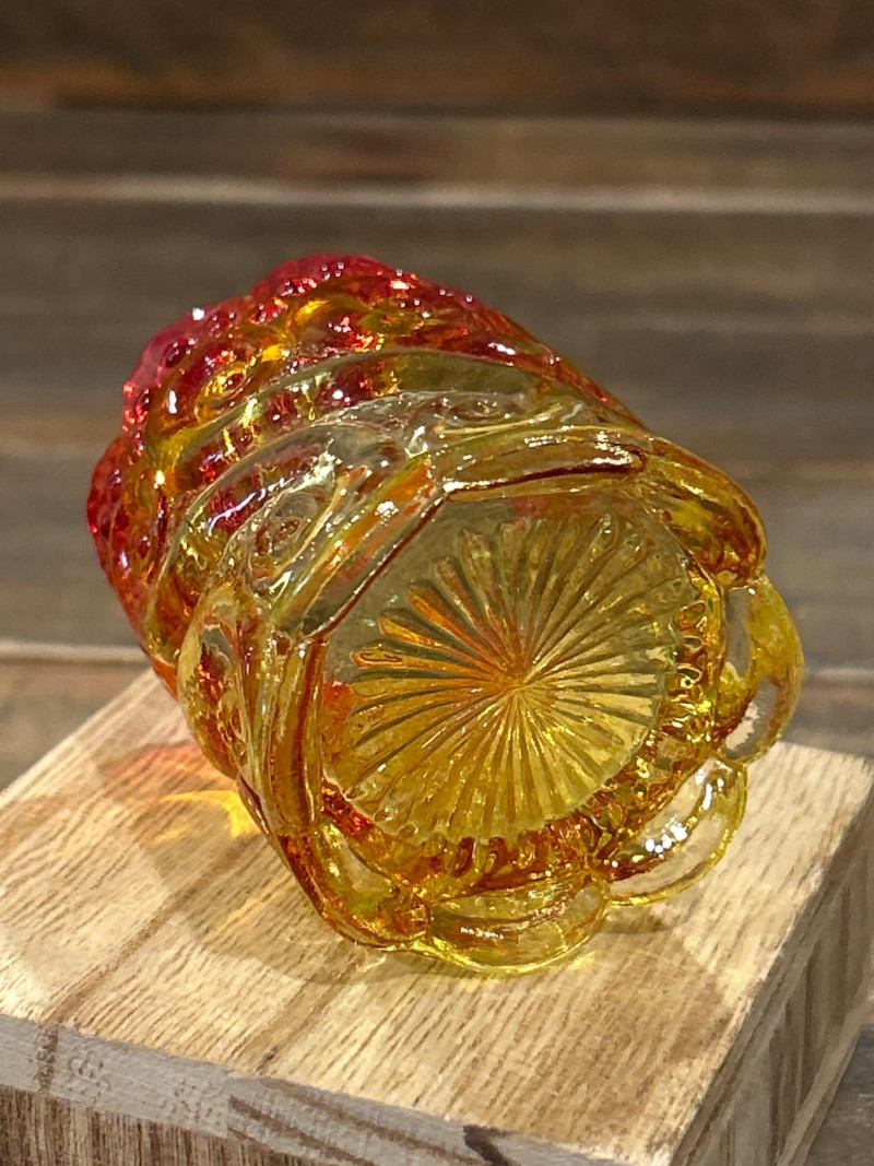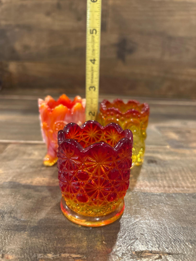Color: Deep ruby red fading to golden amber Design: Pressed “Daisy & Button” pattern with scalloped rim and starburst medallions Attribution: Likely L.E. Smith Glass Co., circa 1960s–1970s Style Notes: A geometric classic with crisp patterning and a bold amberina gradient. Color: Bright yellow transitioning to deep red at the rim Design: Swirling “S” scroll motif with scalloped edge and textured relief Attribution: Likely Kanawha Glass Co., Dunbar, WV, circa 1960s Style Notes: Sculptural and expressive, with luminous amberina tones and fluid form. Color: Glossy marbled orange and white slag glass Design: Ornate shield and bead motif with three feet and scalloped rim Attribution: Unmarked, mid-century American pressed glass Style Notes: Richly molded and boldly marbled, a standout example of postwar slag glass. Set Notes: