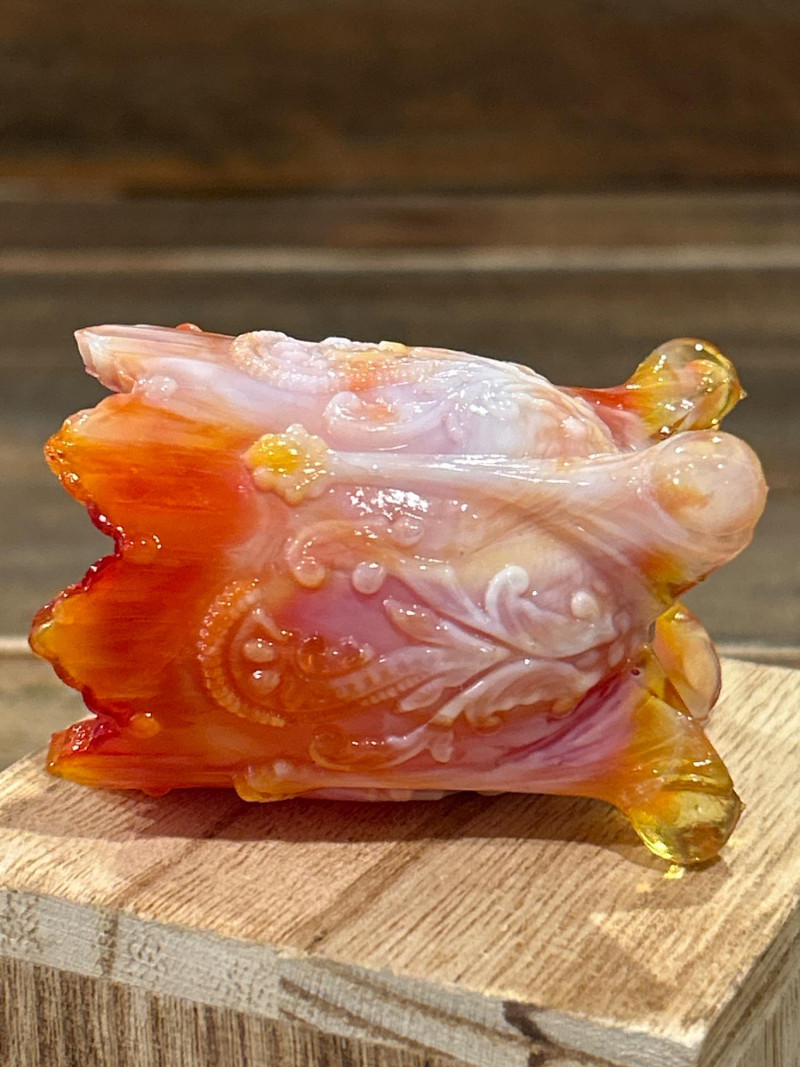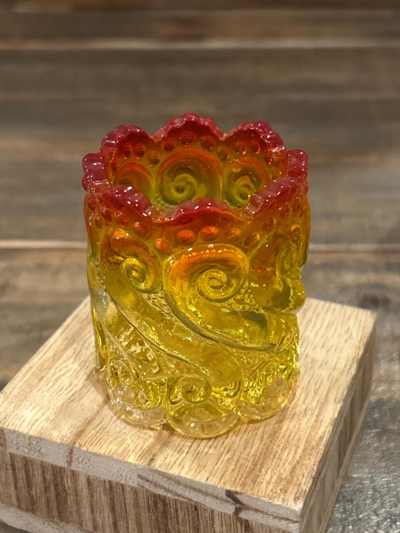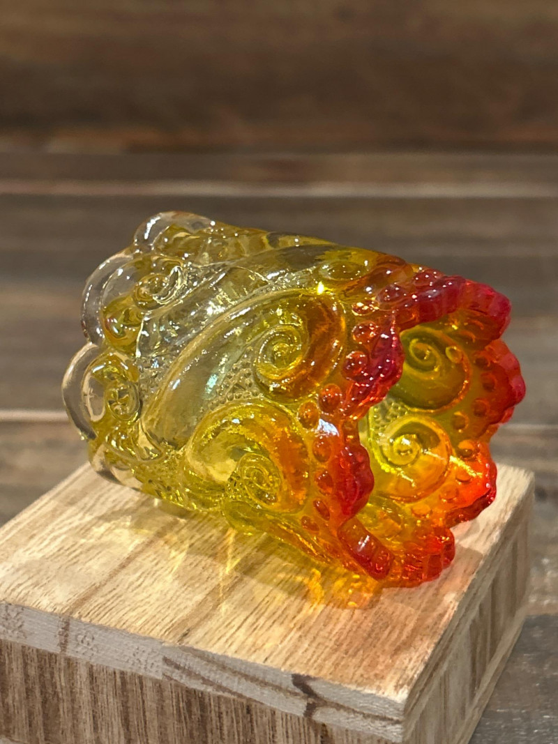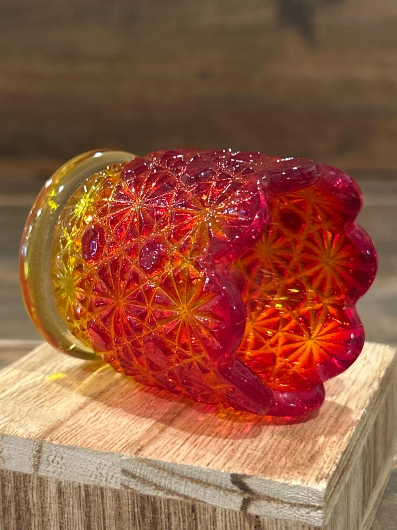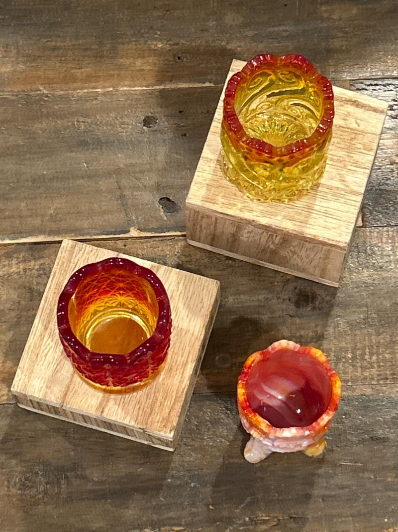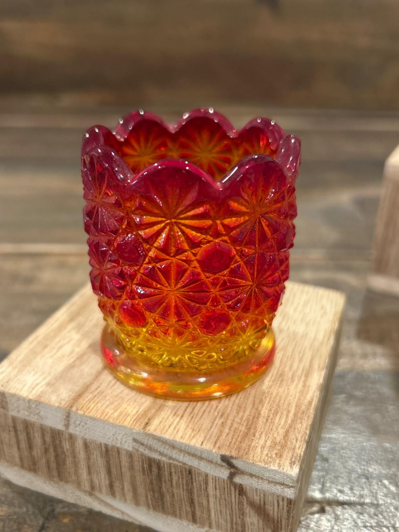 Color: Deep ruby red fading to golden amber Design: Pressed “Daisy & Button” pattern with scalloped rim and starburst medallions Attribution: Likely L.E. Smith Glass Co., circa 1960s–1970s Style Notes: A geometric classic with crisp patterning and a bold amberina gradient. Color: Bright yellow transitioning to deep red at the rim Design: Swirling “S” scroll motif with scalloped edge and textured relief Attribution: Likely Kanawha Glass Co., Dunbar, WV, circa 1960s Style Notes: Sculptural and expressive, with luminous amberina tones and fluid form. Color: Glossy marbled orange and white slag glass Design: Ornate shield and bead motif with three feet and scalloped rim Attribution: Unmarked, mid-century American pressed glass Style Notes: Richly molded and boldly marbled, a standout example of postwar slag glass. Set Notes: