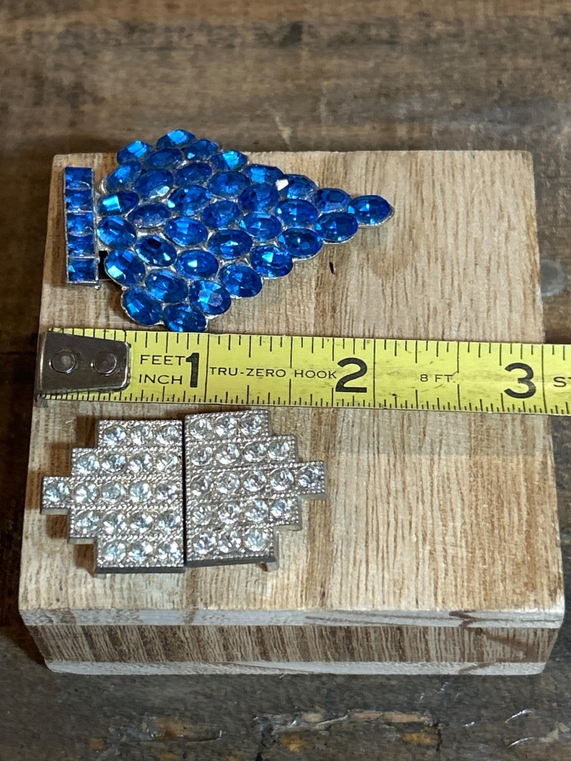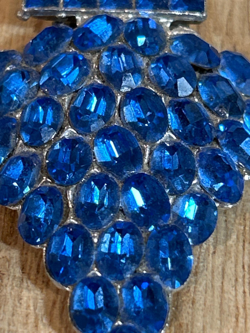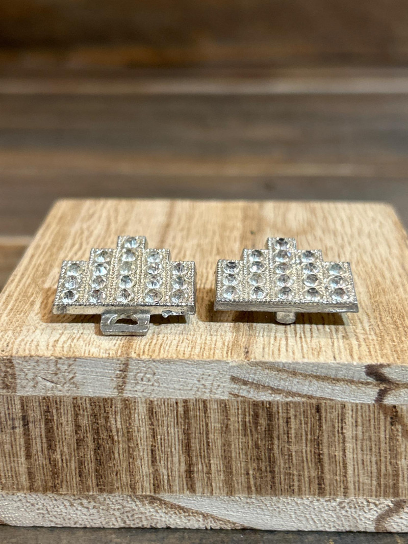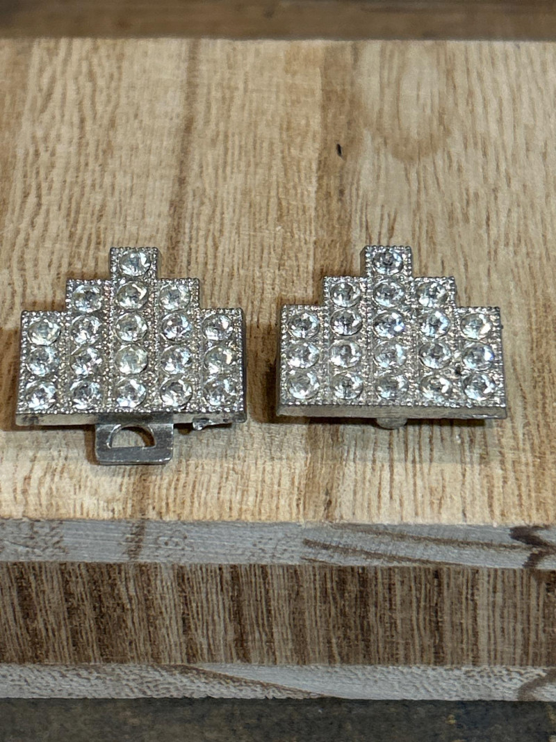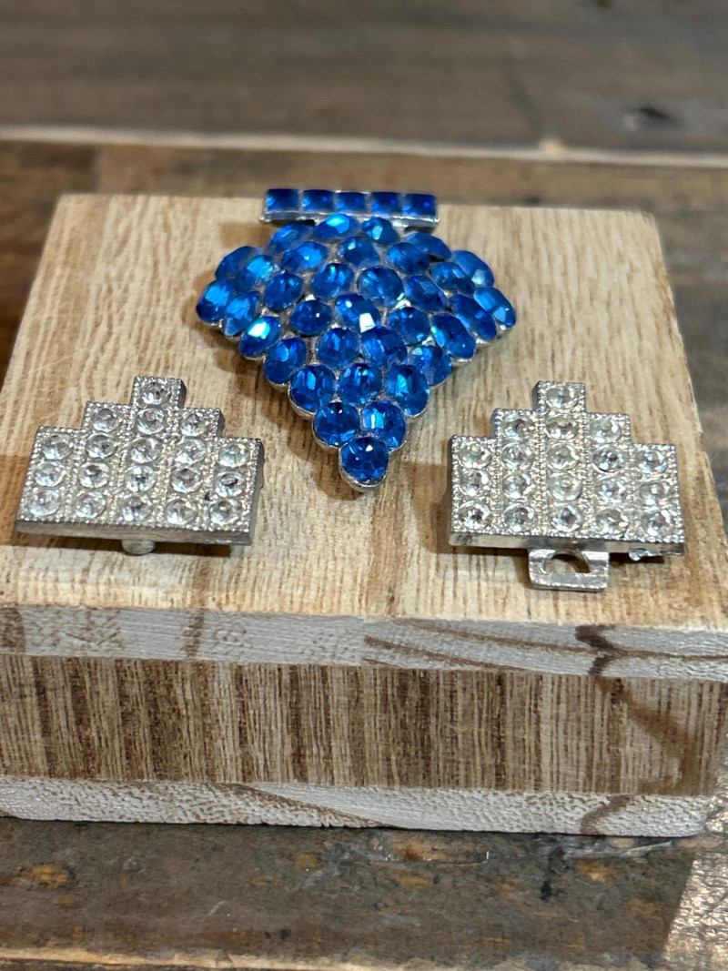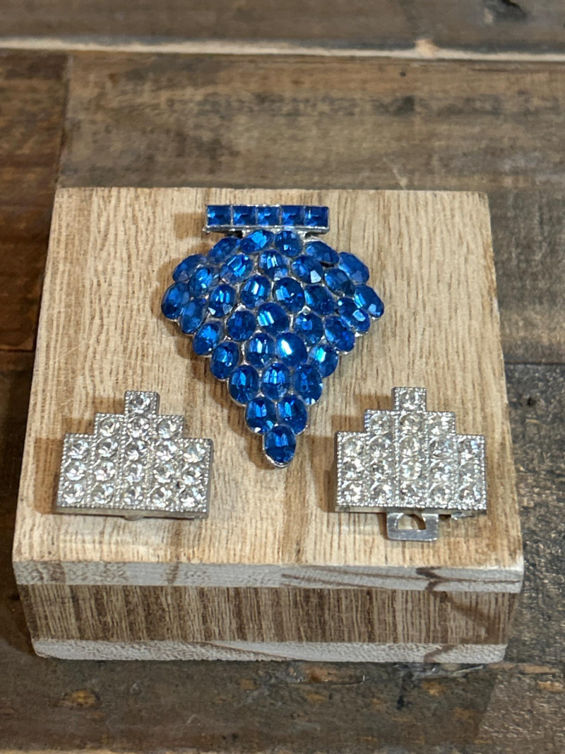 Dress Clip – Art Deco Blue Rhinestone Shield Dimensions:2.5" tall × 1.75" wideColor:Deep sapphire blue Material:Silver-tone metal with faceted glass rhinestones Design:Cascading shield form featuring multiple oval-cut rhinestones and a rectangular bar of square stones at the top. The reverse includes an ornate etched backplate and working hinged clip typical of 1930s craftsmanship. Style Notes:A striking example of Art Deco glamour with bold geometric symmetry and brilliant blue radiance. Originally used as a dress or fur clip to accent necklines, hats, or belts. Buckles (Pair) – Clear Rhinestone Geometric Stepped Design Dimensions:1.25" tall × 1.25" wide (each) Color:Clear crystal Material:Silver-tone metal with prong-set rhinestones Design:Tiered rectangular form set with clear faceted stones, showcasing the classic stepped Art Deco motif. Style Notes:Versatile accessories that once adorned shoes or fabric trims, these buckles echo the architectural style of the era and complement the blue clip beautifully as a matched set.