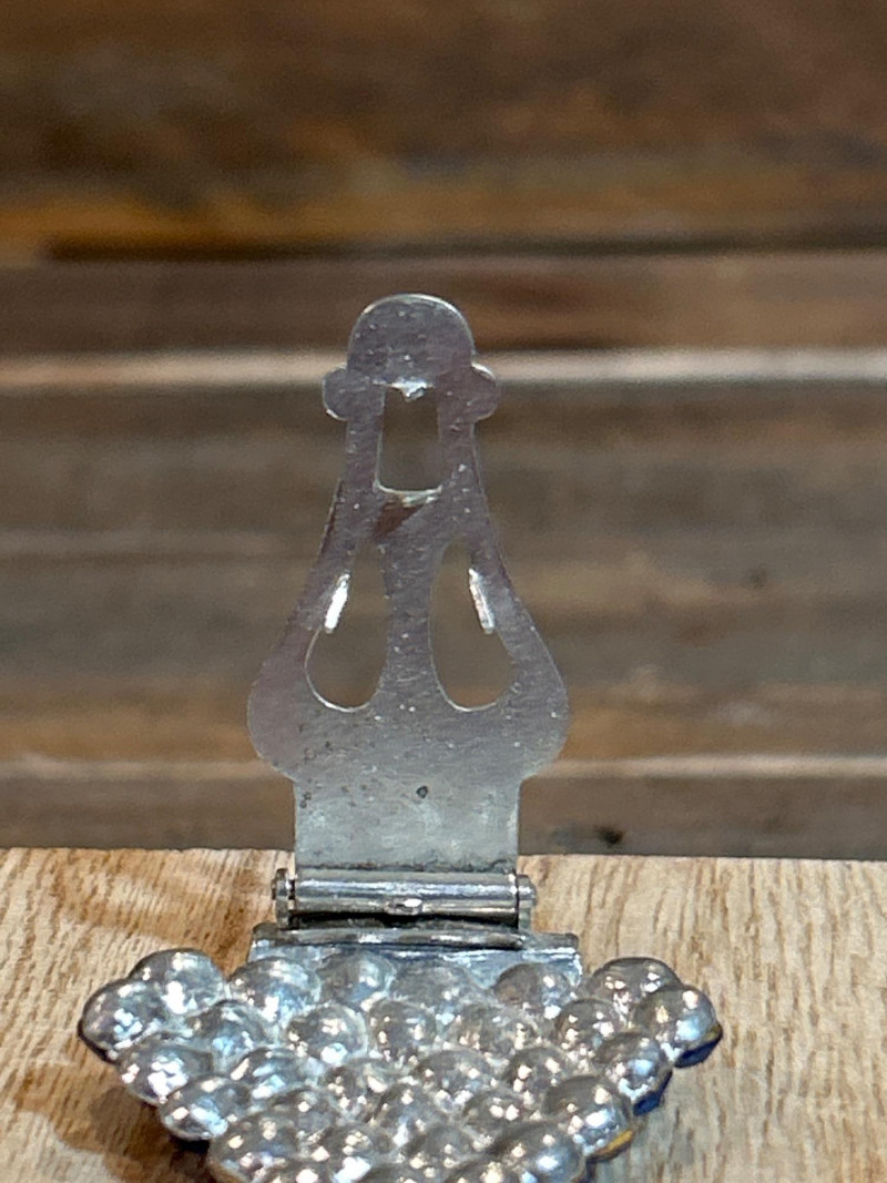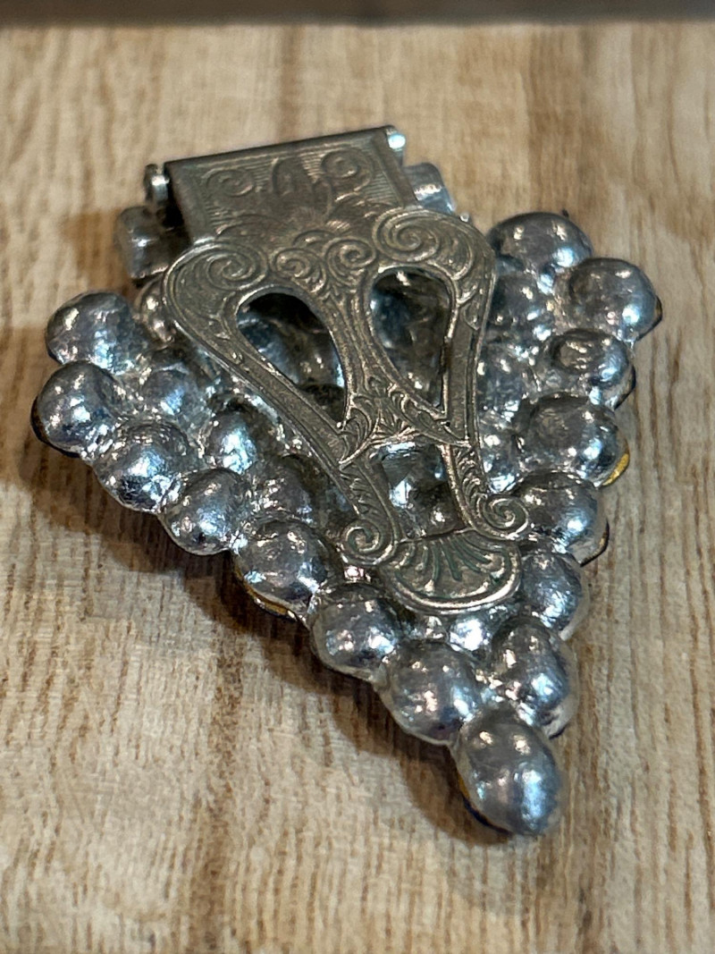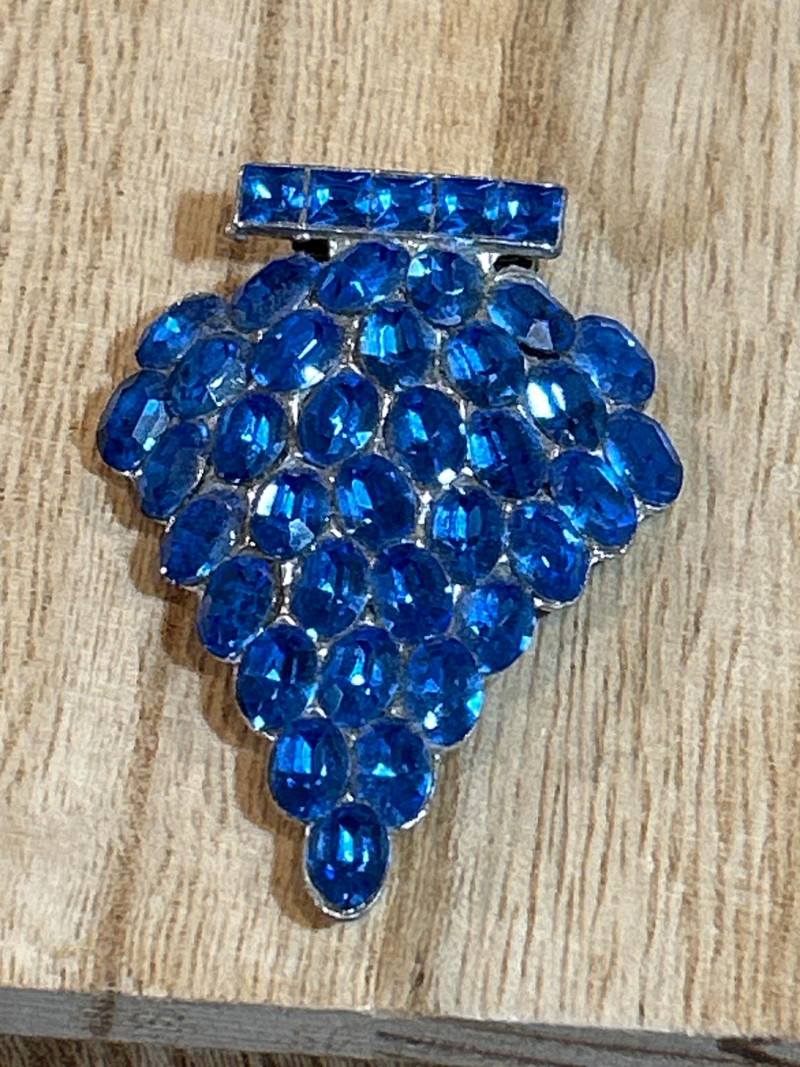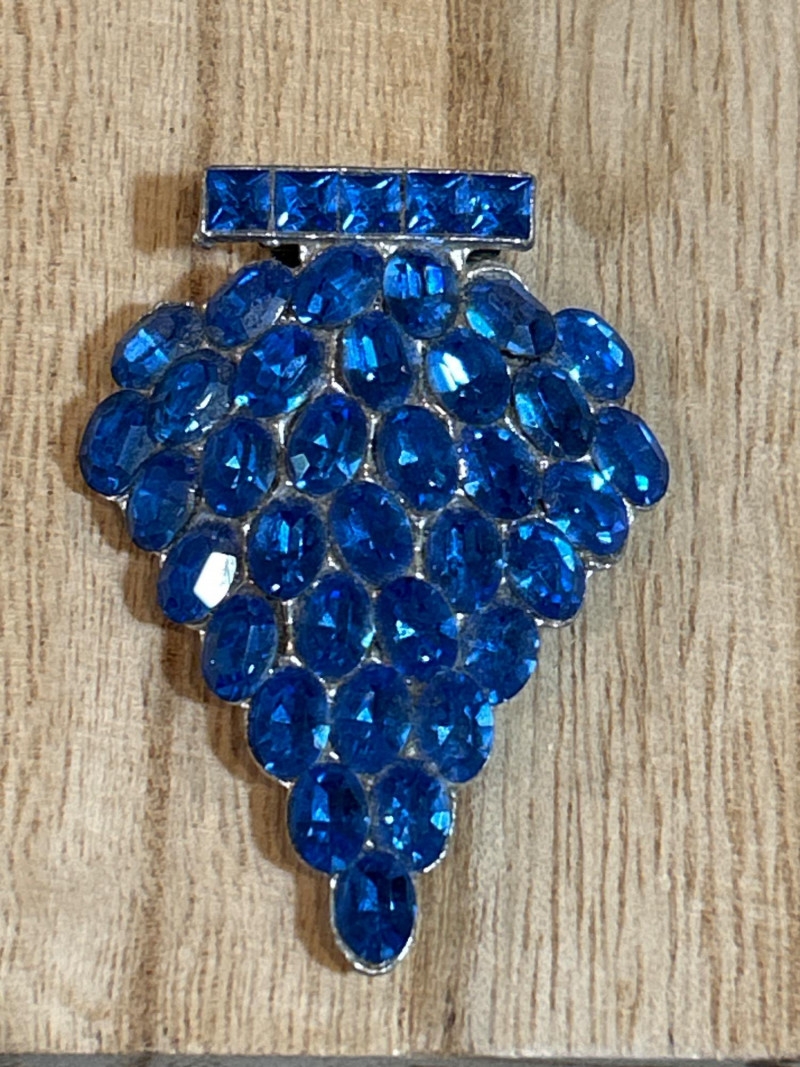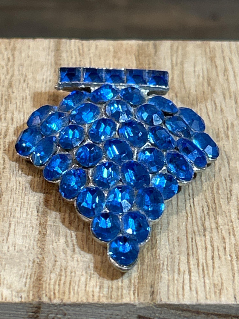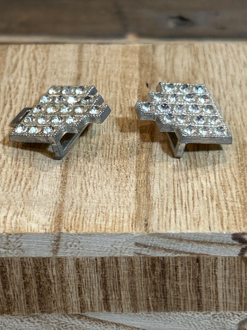 Dress Clip – Art Deco Blue Rhinestone Shield Dimensions:2.5" tall × 1.75" wideColor:Deep sapphire blue Material:Silver-tone metal with faceted glass rhinestones Design:Cascading shield form featuring multiple oval-cut rhinestones and a rectangular bar of square stones at the top. The reverse includes an ornate etched backplate and working hinged clip typical of 1930s craftsmanship. Style Notes:A striking example of Art Deco glamour with bold geometric symmetry and brilliant blue radiance. Originally used as a dress or fur clip to accent necklines, hats, or belts. Buckles (Pair) – Clear Rhinestone Geometric Stepped Design Dimensions:1.25" tall × 1.25" wide (each) Color:Clear crystal Material:Silver-tone metal with prong-set rhinestones Design:Tiered rectangular form set with clear faceted stones, showcasing the classic stepped Art Deco motif. Style Notes:Versatile accessories that once adorned shoes or fabric trims, these buckles echo the architectural style of the era and complement the blue clip beautifully as a matched set.