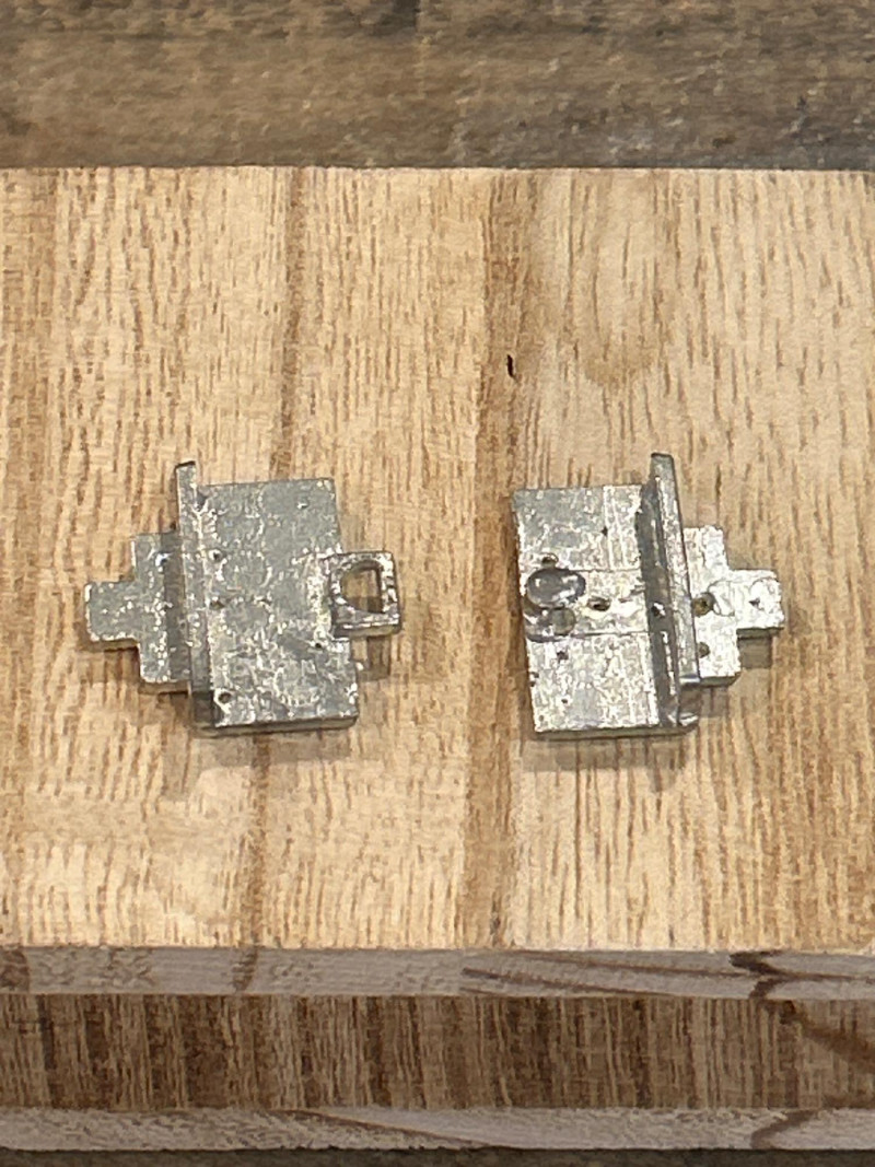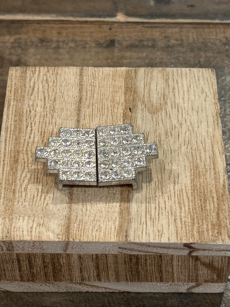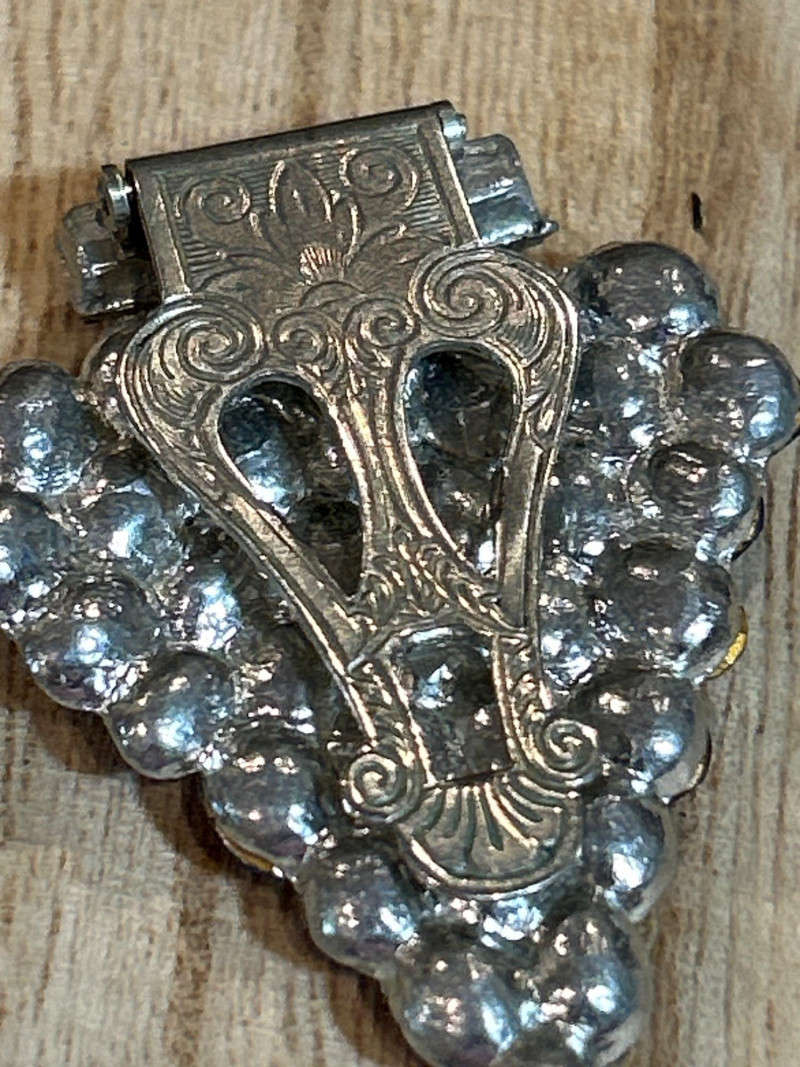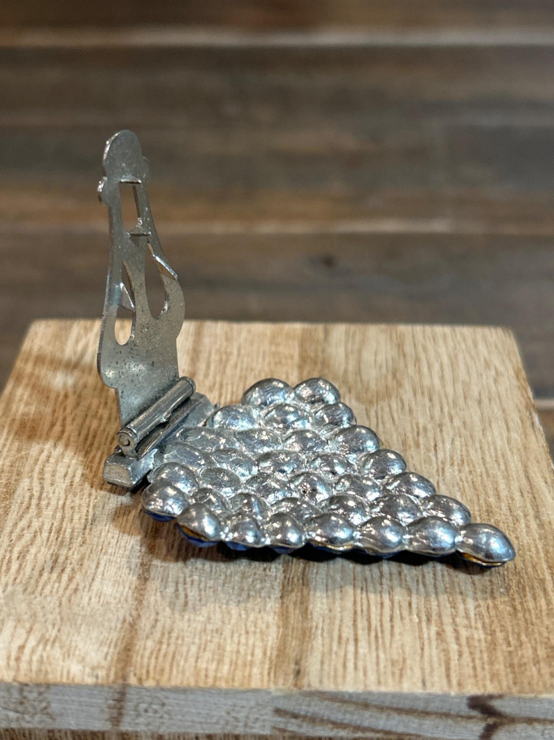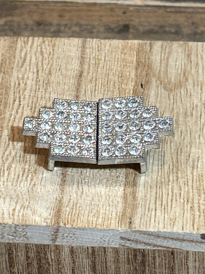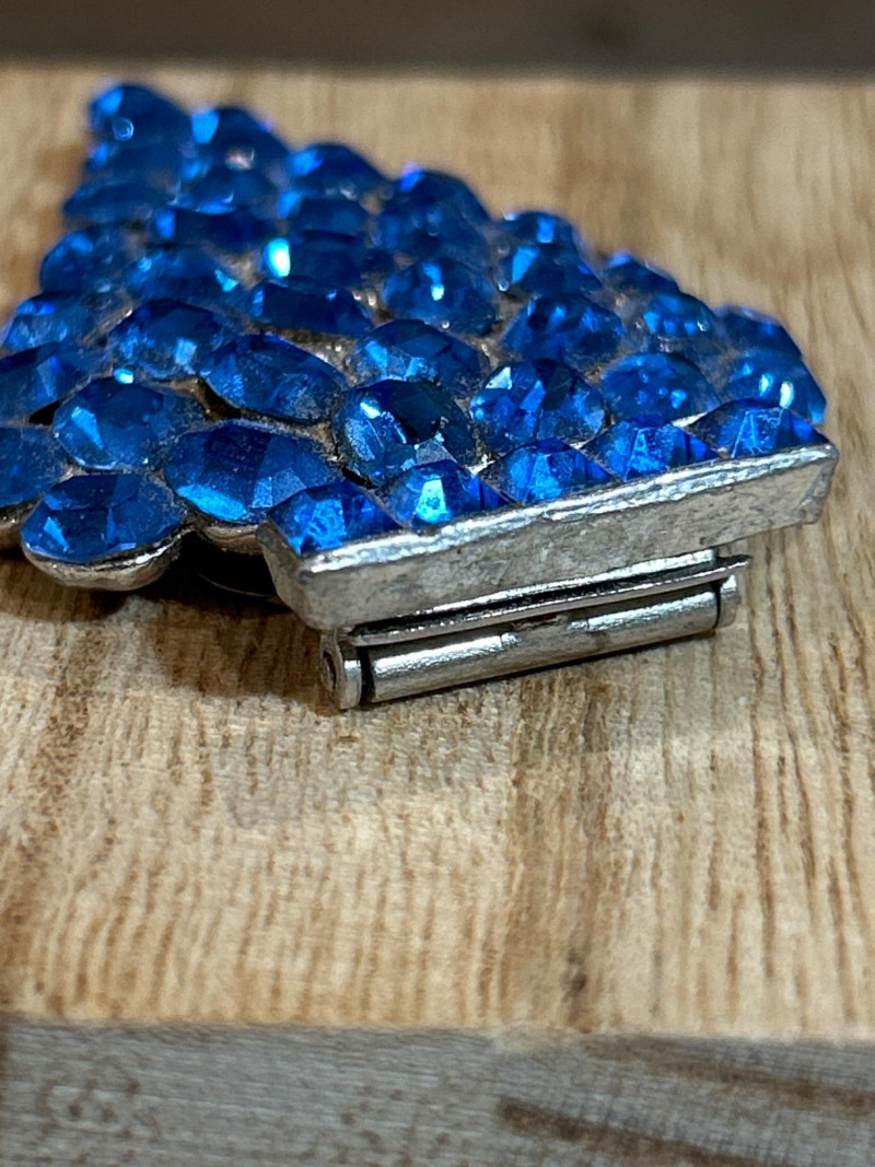 Dress Clip – Art Deco Blue Rhinestone Shield Dimensions:2.5" tall × 1.75" wideColor:Deep sapphire blue Material:Silver-tone metal with faceted glass rhinestones Design:Cascading shield form featuring multiple oval-cut rhinestones and a rectangular bar of square stones at the top. The reverse includes an ornate etched backplate and working hinged clip typical of 1930s craftsmanship. Style Notes:A striking example of Art Deco glamour with bold geometric symmetry and brilliant blue radiance. Originally used as a dress or fur clip to accent necklines, hats, or belts. Buckles (Pair) – Clear Rhinestone Geometric Stepped Design Dimensions:1.25" tall × 1.25" wide (each) Color:Clear crystal Material:Silver-tone metal with prong-set rhinestones Design:Tiered rectangular form set with clear faceted stones, showcasing the classic stepped Art Deco motif. Style Notes:Versatile accessories that once adorned shoes or fabric trims, these buckles echo the architectural style of the era and complement the blue clip beautifully as a matched set.
