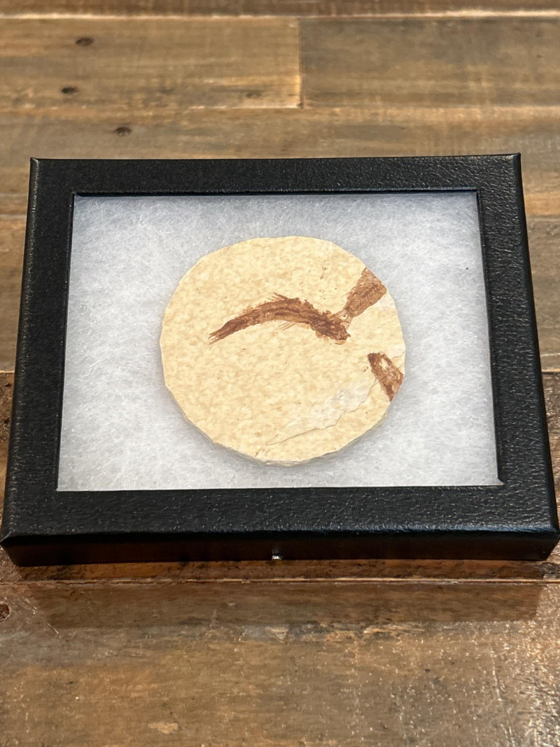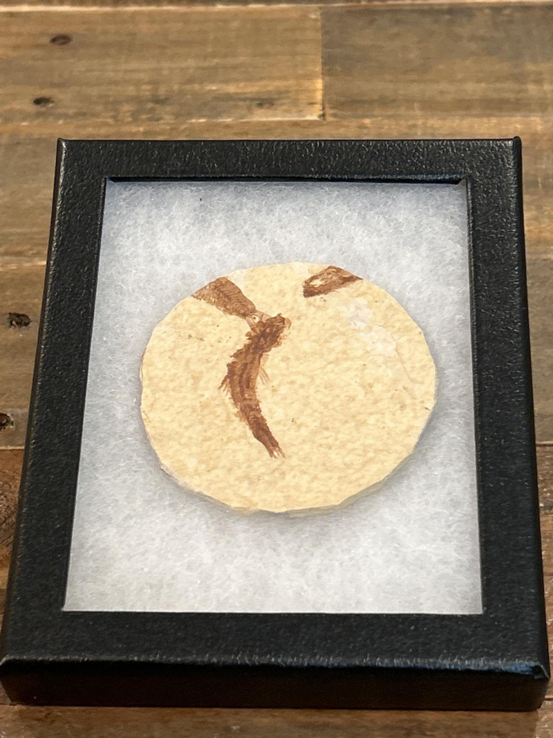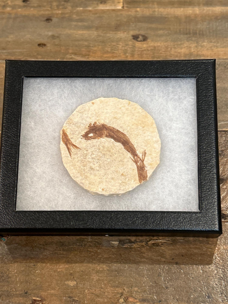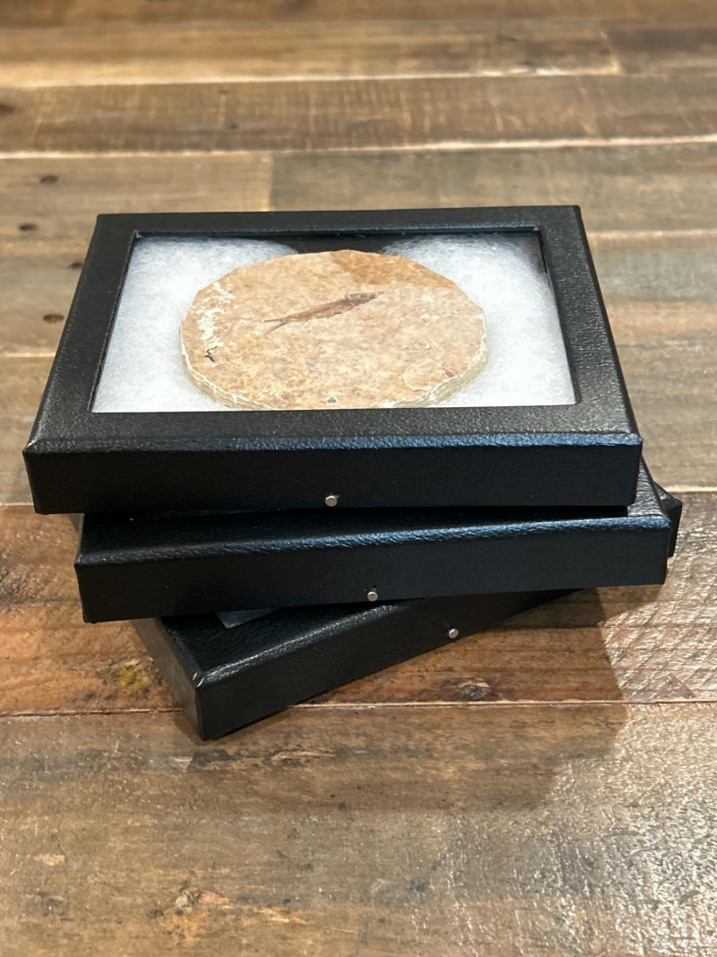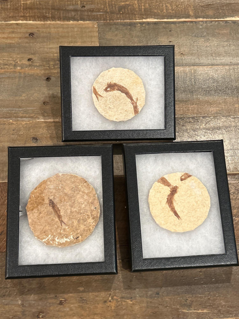 A curated trio of authentic fossil fish specimens from Wyoming’s Green River Formation, dating to the Eocene Epoch (~50 million years ago). Each specimen is preserved in cream-to-tan shale with visible skeletal and fin structures, professionally mounted in black glass-fronted frames. These examples reflect the exceptional fossilization conditions of this iconic formation. Formation:Green River Formation Age:Eocene Epoch (~50 million years) Location:Wyoming, USA Species (likely):Knightia eocaenaor Diplomystus dentatus Material:Fossil fish in natural shale matrix Display:Black frames with protective glass and foam backing Frame Size:Approx. 6.5” H × 5” W Fossil Disc Size:Approx. 3.5”–4” diameter Note: Green River fish fossils are among the most widely collected vertebrate fossils, valued for their clarity, provenance, and accessibility.
