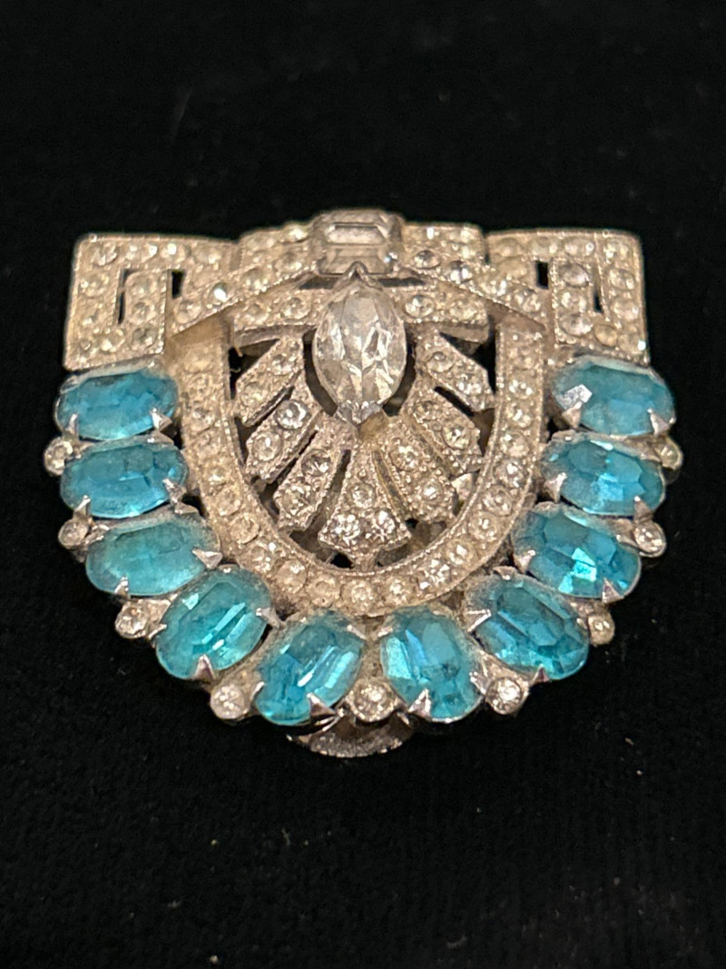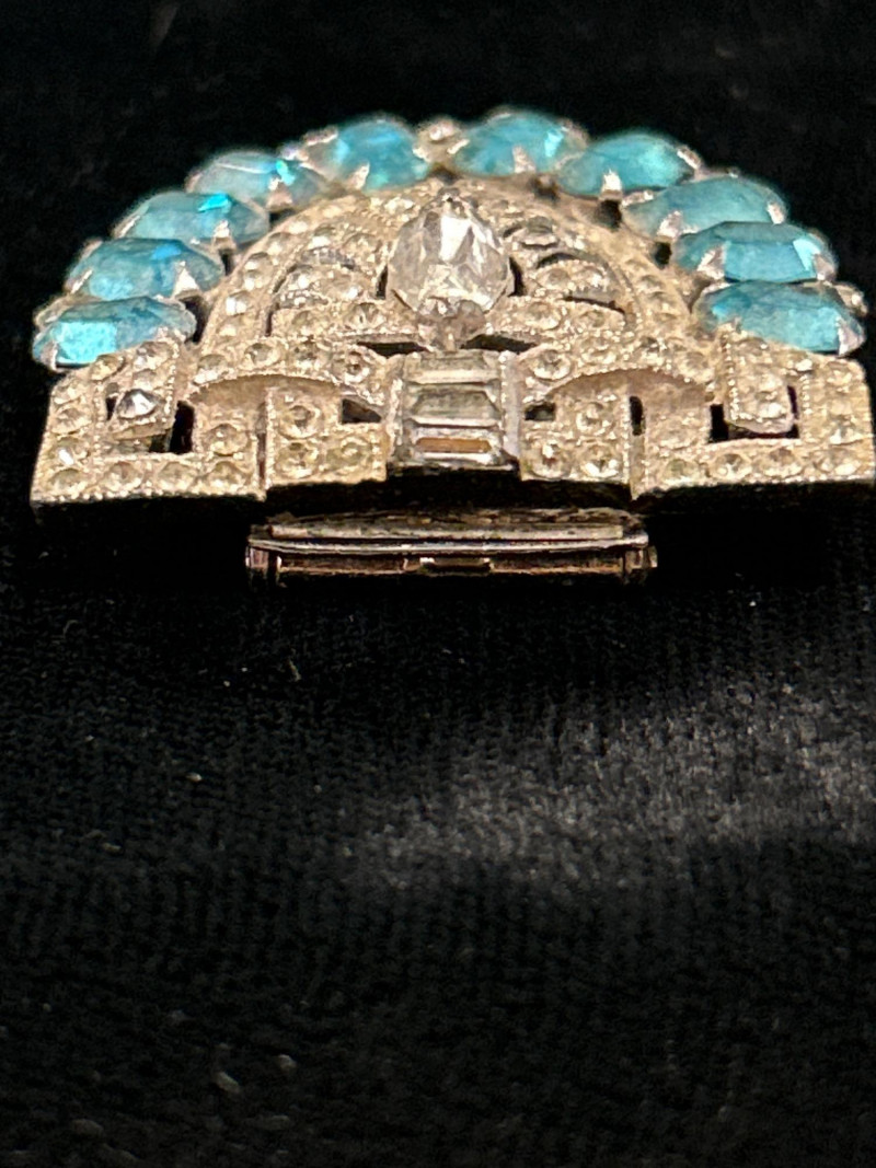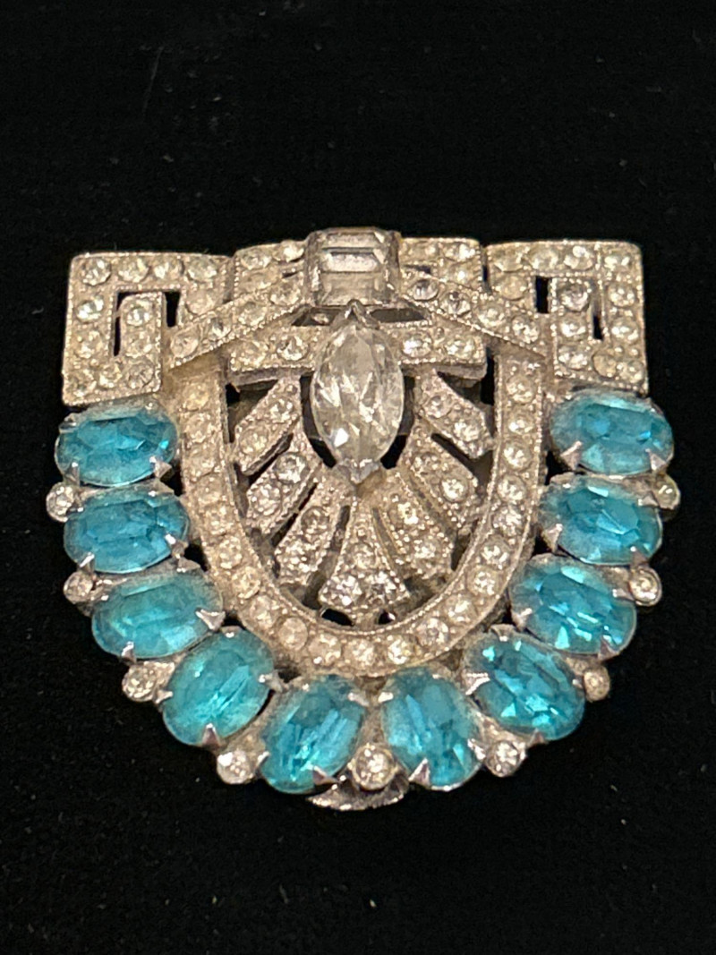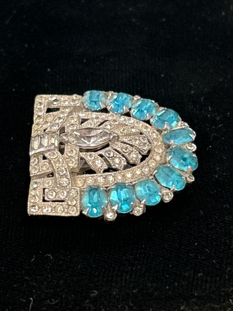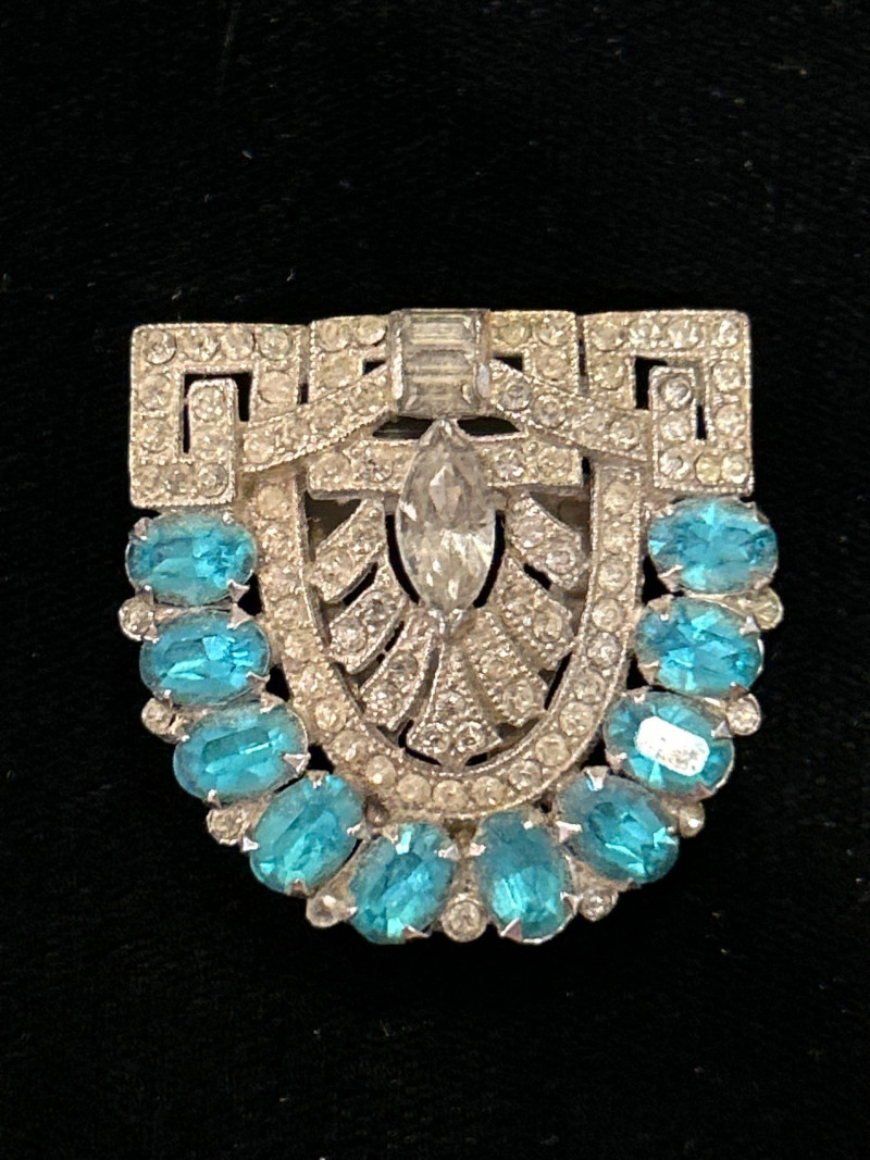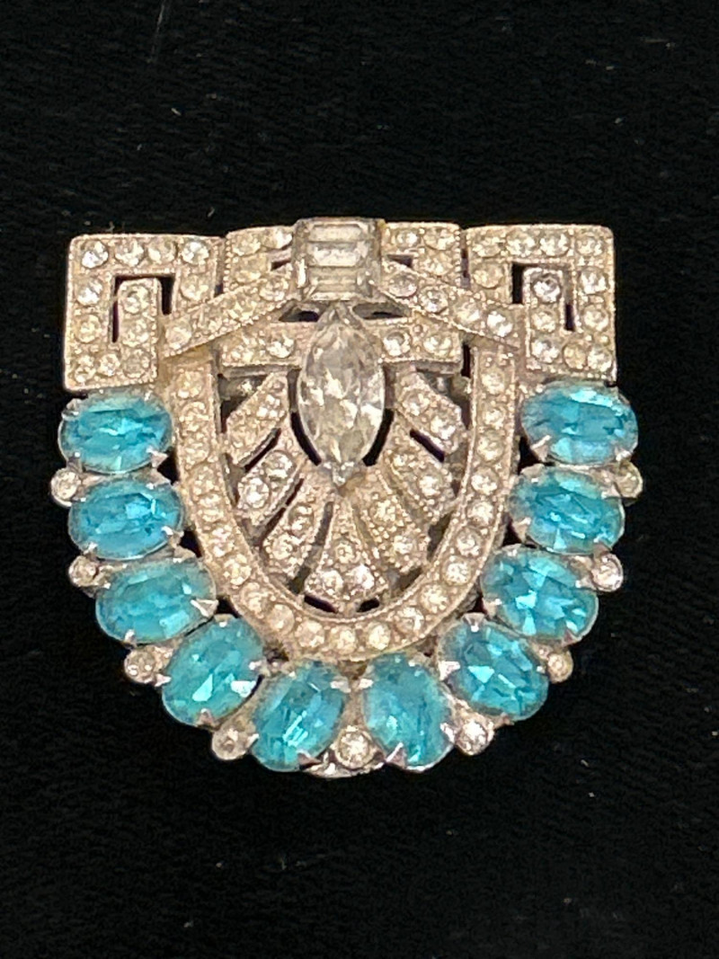 A stunning Art Deco dress clip featuring a bold shield-shaped design adorned with brilliant clear rhinestones and vibrant aqua-blue oval glass stones. The geometric top section is set with pave rhinestones in a stepped motif framing a marquise-cut center stone, radiating downward into a fan of sparkling clear accents. The outer semicircle is bordered by twelve faceted aqua stones that capture and reflect light beautifully. Item Details: Era: Circa 1930s Design Style: Art Deco geometric shield motif Materials: Rhodium-plated white metal, clear and aqua glass stones (rhinestones) Stone Cuts: Marquise, baguette, round, and oval faceted Dimensions: Approx. 2¼ in. long × 1¾ in. wide Fastening: Hinged clip mechanism on reverse, typical of Deco dress clips Condition: Excellent vintage condition; bright stones and secure clip. Minor age-appropriate wear to plating on reverse. Collecting Note: