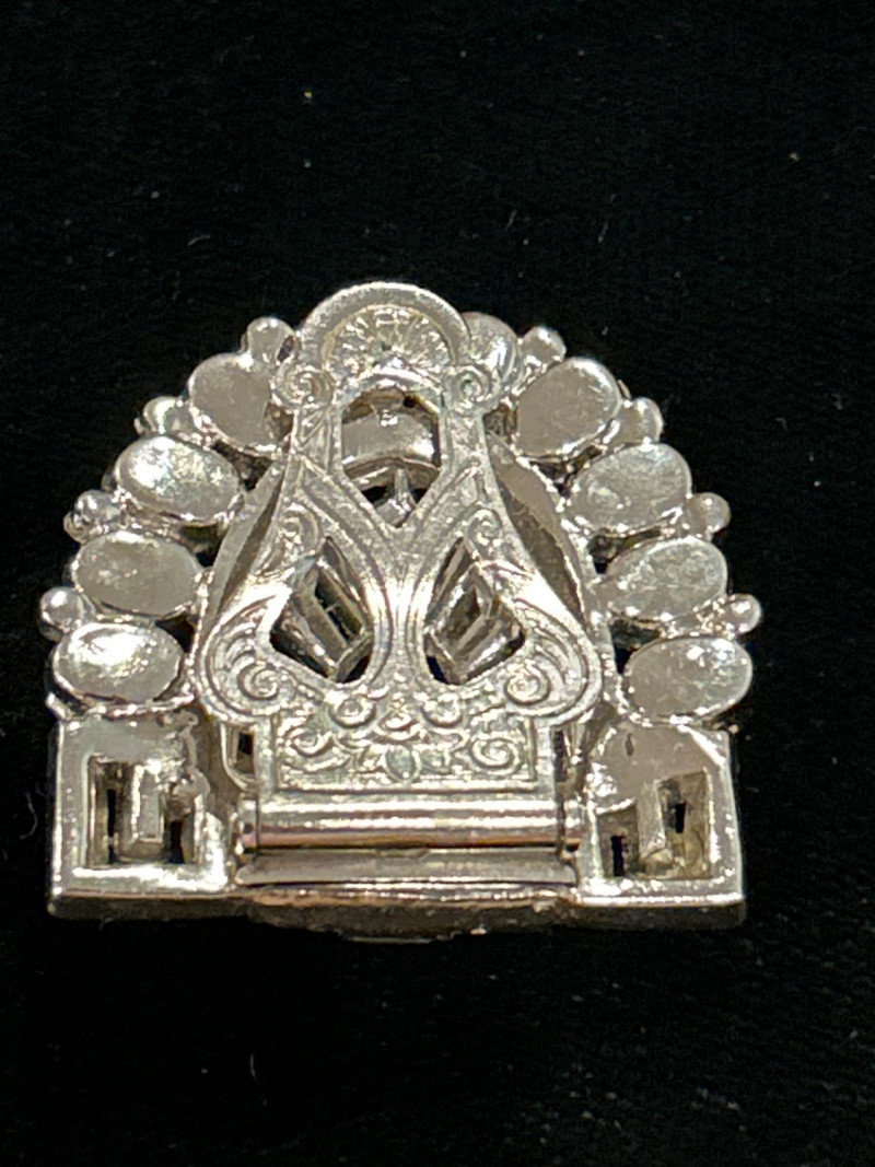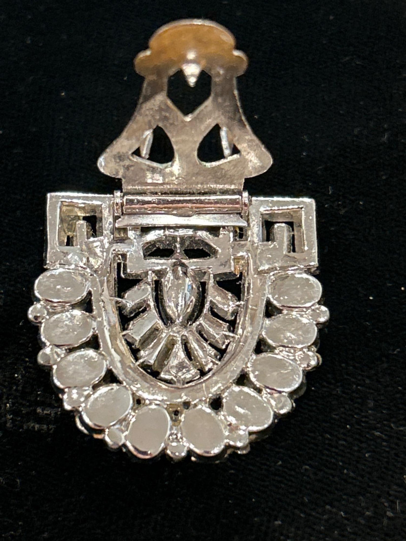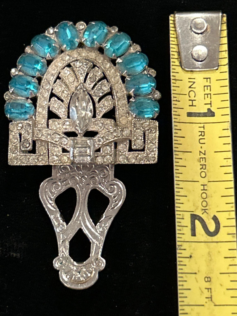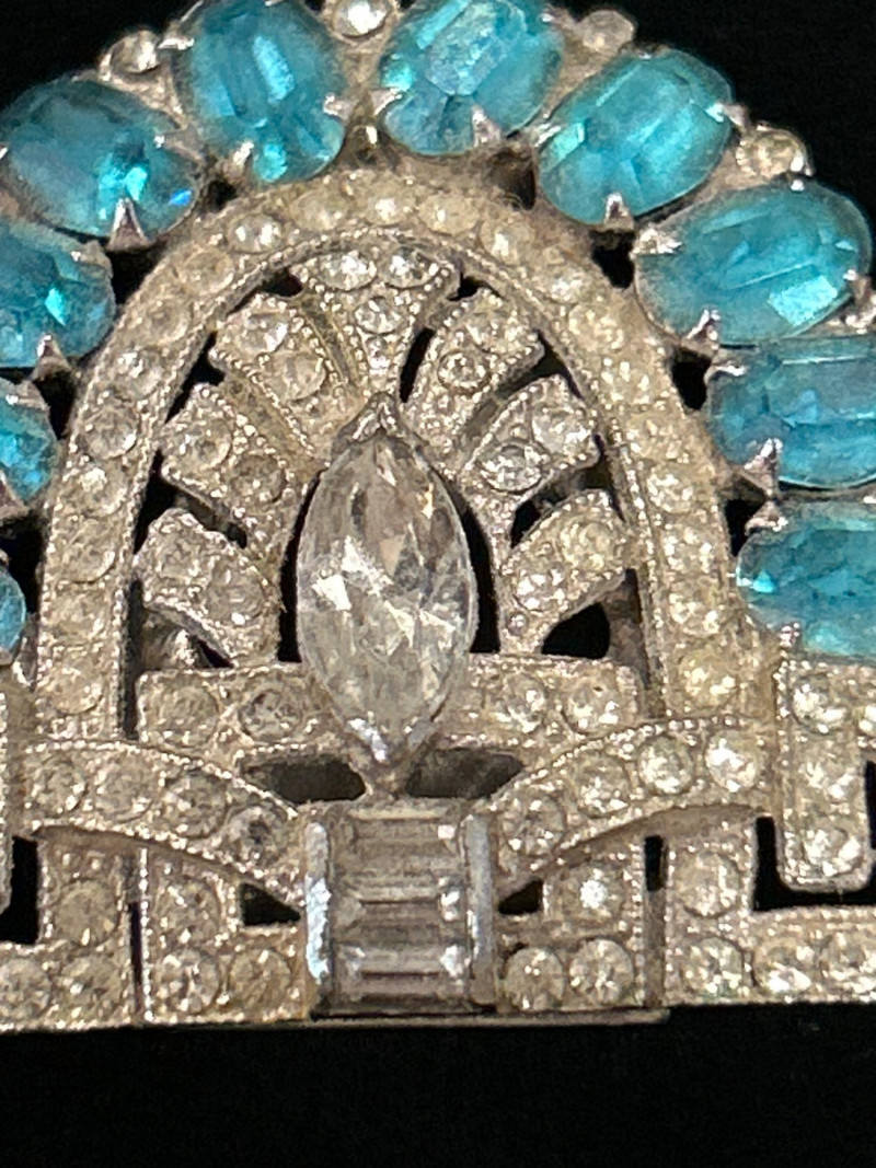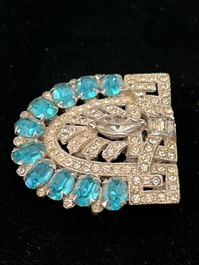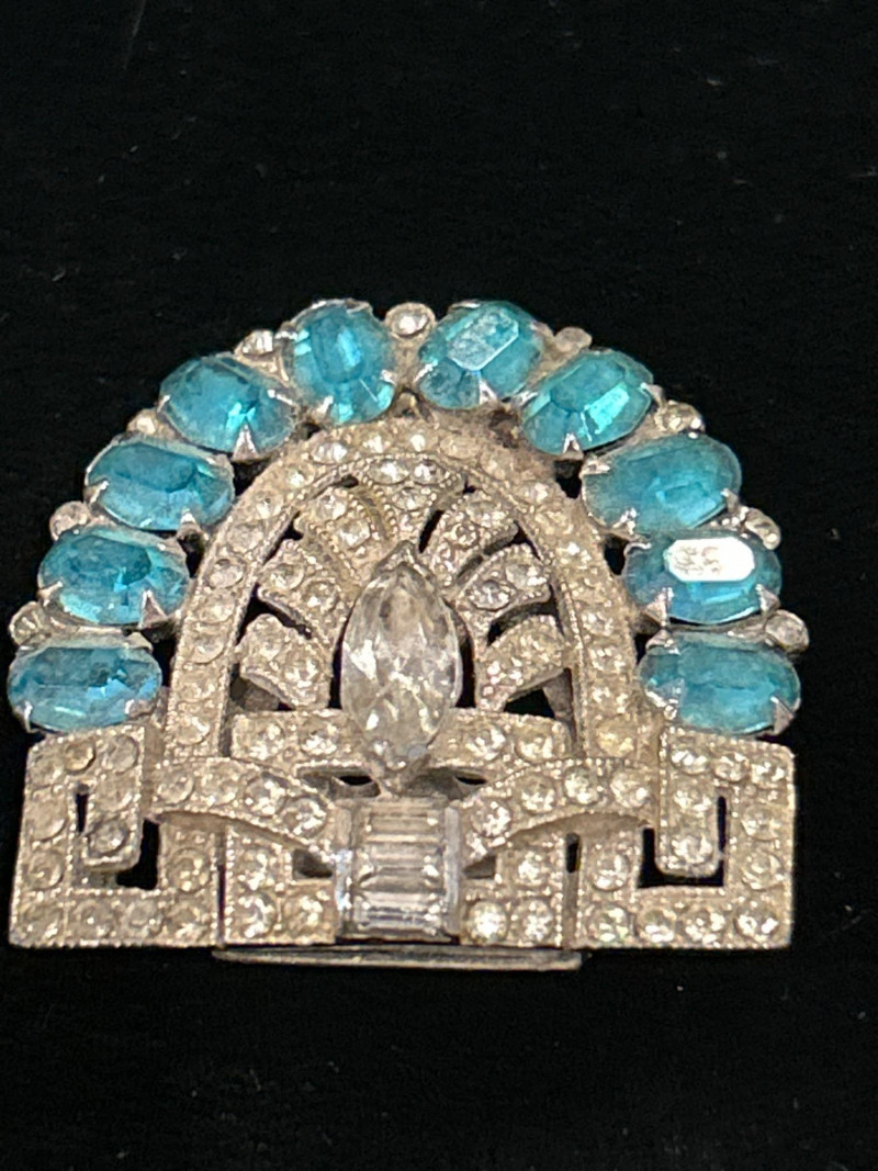 A stunning Art Deco dress clip featuring a bold shield-shaped design adorned with brilliant clear rhinestones and vibrant aqua-blue oval glass stones. The geometric top section is set with pave rhinestones in a stepped motif framing a marquise-cut center stone, radiating downward into a fan of sparkling clear accents. The outer semicircle is bordered by twelve faceted aqua stones that capture and reflect light beautifully. Item Details: Era: Circa 1930s Design Style: Art Deco geometric shield motif Materials: Rhodium-plated white metal, clear and aqua glass stones (rhinestones) Stone Cuts: Marquise, baguette, round, and oval faceted Dimensions: Approx. 2¼ in. long × 1¾ in. wide Fastening: Hinged clip mechanism on reverse, typical of Deco dress clips Condition: Excellent vintage condition; bright stones and secure clip. Minor age-appropriate wear to plating on reverse. Collecting Note: