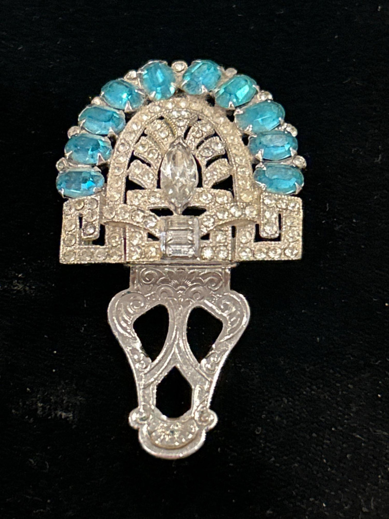 Dress clips were a defining accessory of the 1930s–40s, worn singly or as matched pairs on lapels, hats, and evening gowns. This piece embodies the elegance and craftsmanship of the Art Deco period, with its symmetrical architecture, brilliant rhinestone work, and signature aquamarine color palette reminiscent of early Marcel Boucher and Trifari styles.