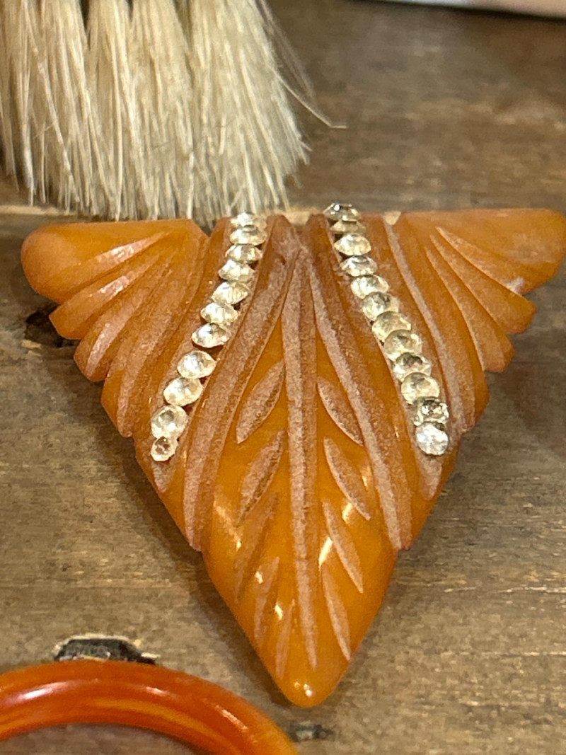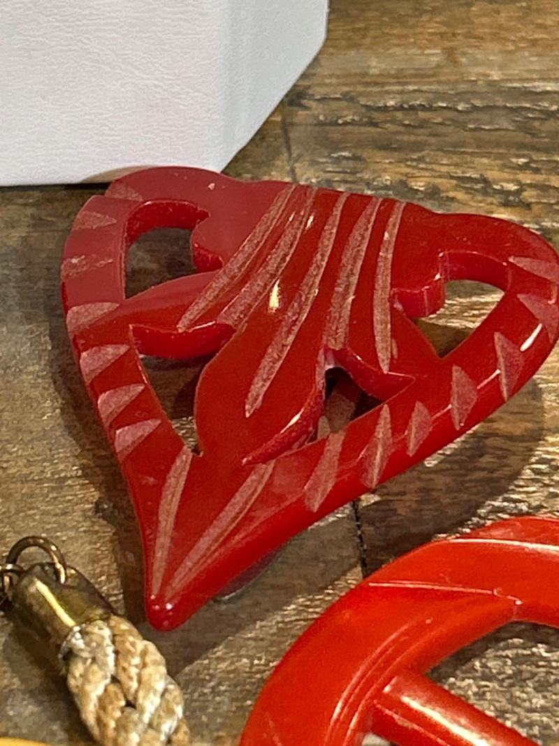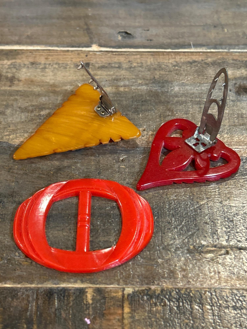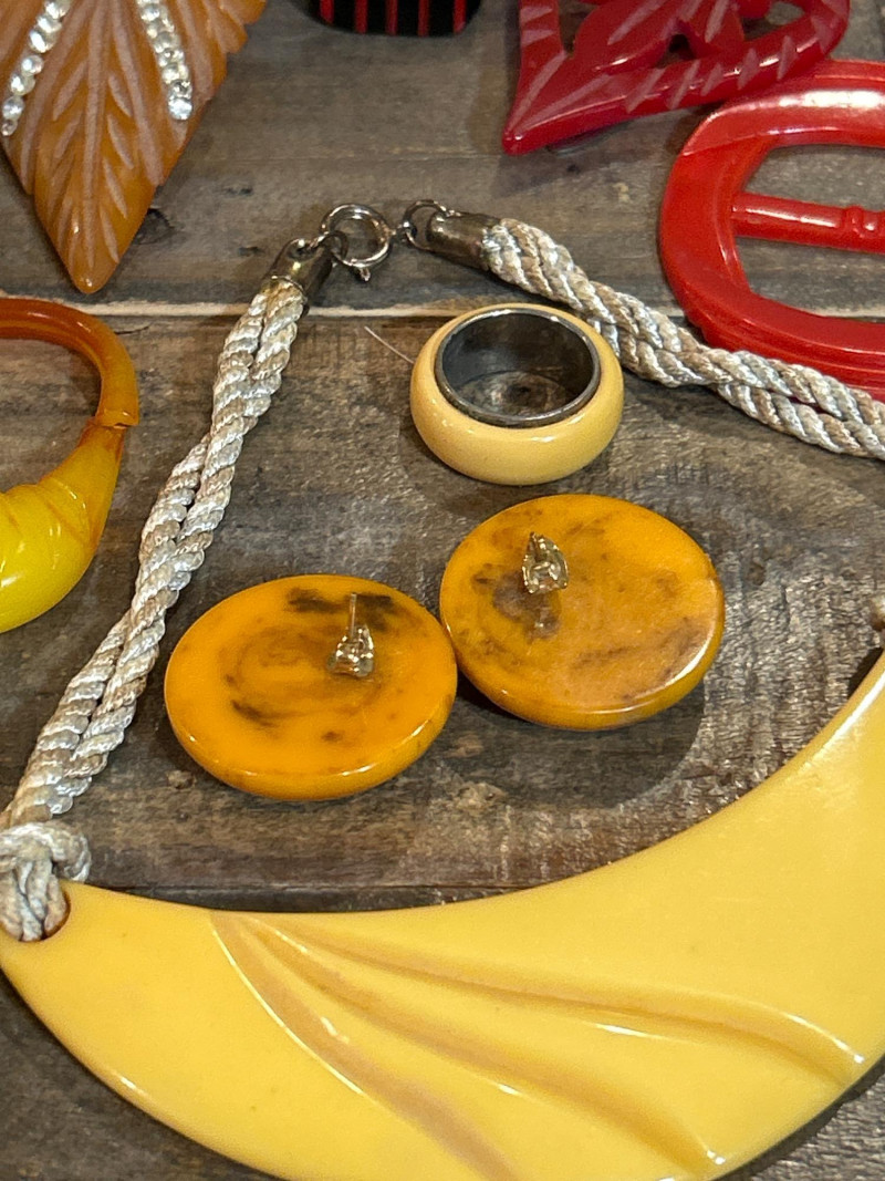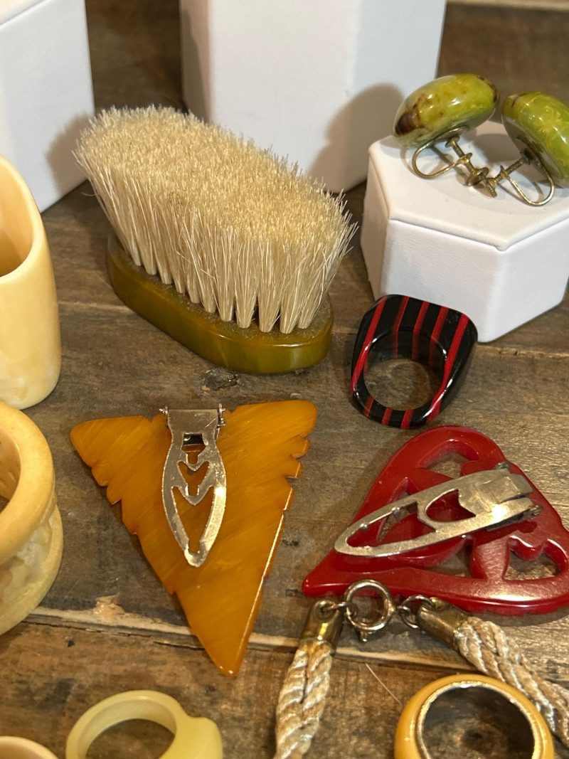 A vibrant and eclectic collection of vintage Bakelite and celluloid jewelry and accessories, celebrating the bold hues and iconic design motifs of the 1930s to 1950s. This 20+ piece lot features carved, molded, and marbled examples in classic tones of butterscotch, apple juice, cherry red, and amber—hallmarks of early plastic artistry. Bakelite napkin rings Carved Brooches Includes a leaf-form amber Bakelite brooch with rhinestone detail, a red openwork heart, and a triangular yellow piece. Necklace: Crescent-shaped yellow Bakelite pendant on a twisted cord chain. Clip-On Earrings: Domed and round forms in mottled green and amber hues. Rings: Assorted Bakelite and celluloid rings in black, ivory, and cream marbled tones. Button Buckle: Red circular Bakelite with carved detailing. Carved Celluloid Bangle: Cream tone with pierced floral relief motif. Heart Pendant : Caramel-tone Bakelite with molded loop. Small Brush: Olive green marbled Bakelite handle. A highly collectible ensemble ideal for Bakelite enthusiasts, vintage fashion stylists, and costume jewelry dealers. The variety of carving styles, forms, and colorways offers a compelling snapshot of pre-war and post-war plastic craftsmanship.Set Includes-