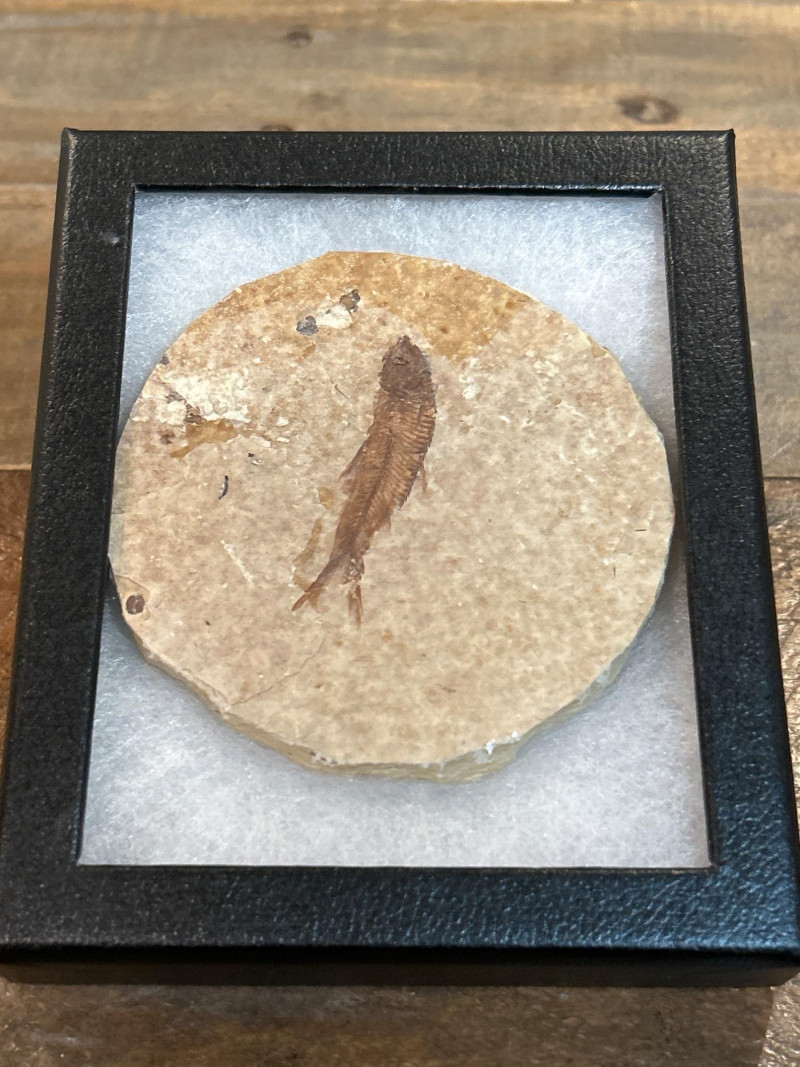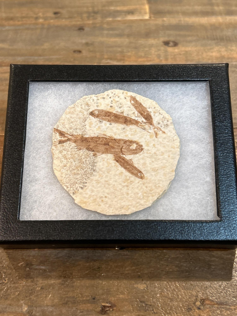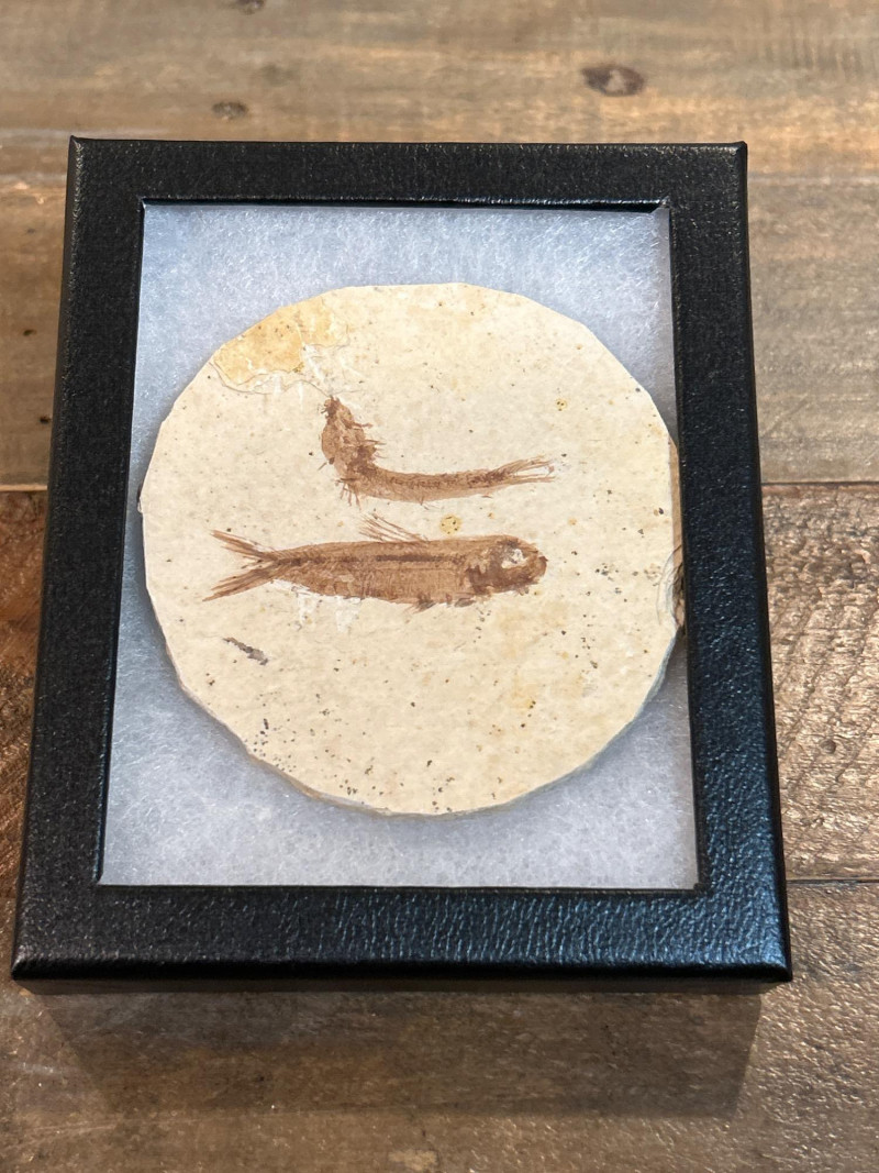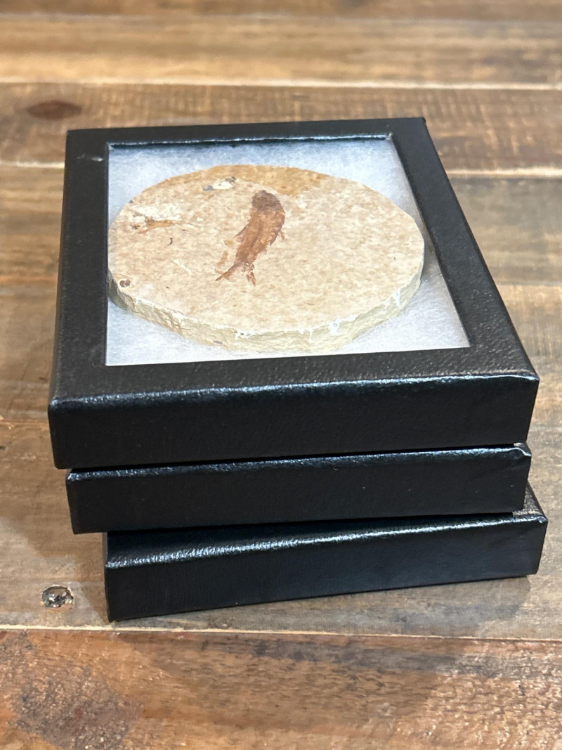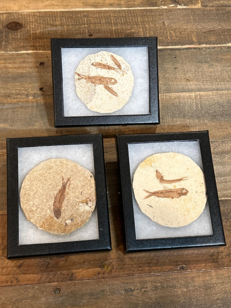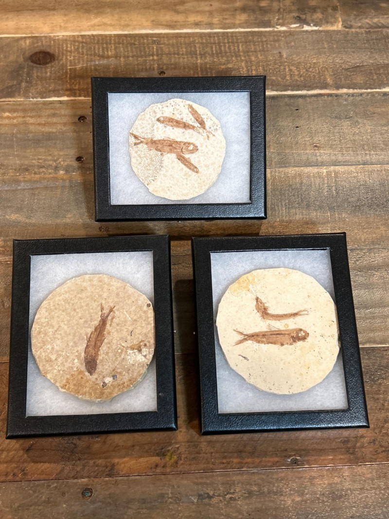A trio of Knightia fossil fish, each showcased in a sleek black glass-top riker frame. These natural specimens are embedded in circular limestone matrixes, revealing beautifully preserved skeletal and fin structures. Each stone features one to three complete fish, offering unique variation in composition and character. Sourced from the legendary Green River Formation in Wyoming, these Eocene-era fossils (~50 million years old) are celebrated for their exceptional detail and historical significance—making them a favorite among collectors, educators, and natural history enthusiasts. Specifications: Species: Knightia Geological Formation: Green River Formation Age: Eocene Epoch (~50 million years) Origin: Wyoming, USA Material: Fossil fish in limestone matrix Display: Black glass-top riker frames Frame Size (each): Approx. 4 × 4 in (10 × 10 cm) Quantity: Set of 3 framed specimens Collector’s Note: