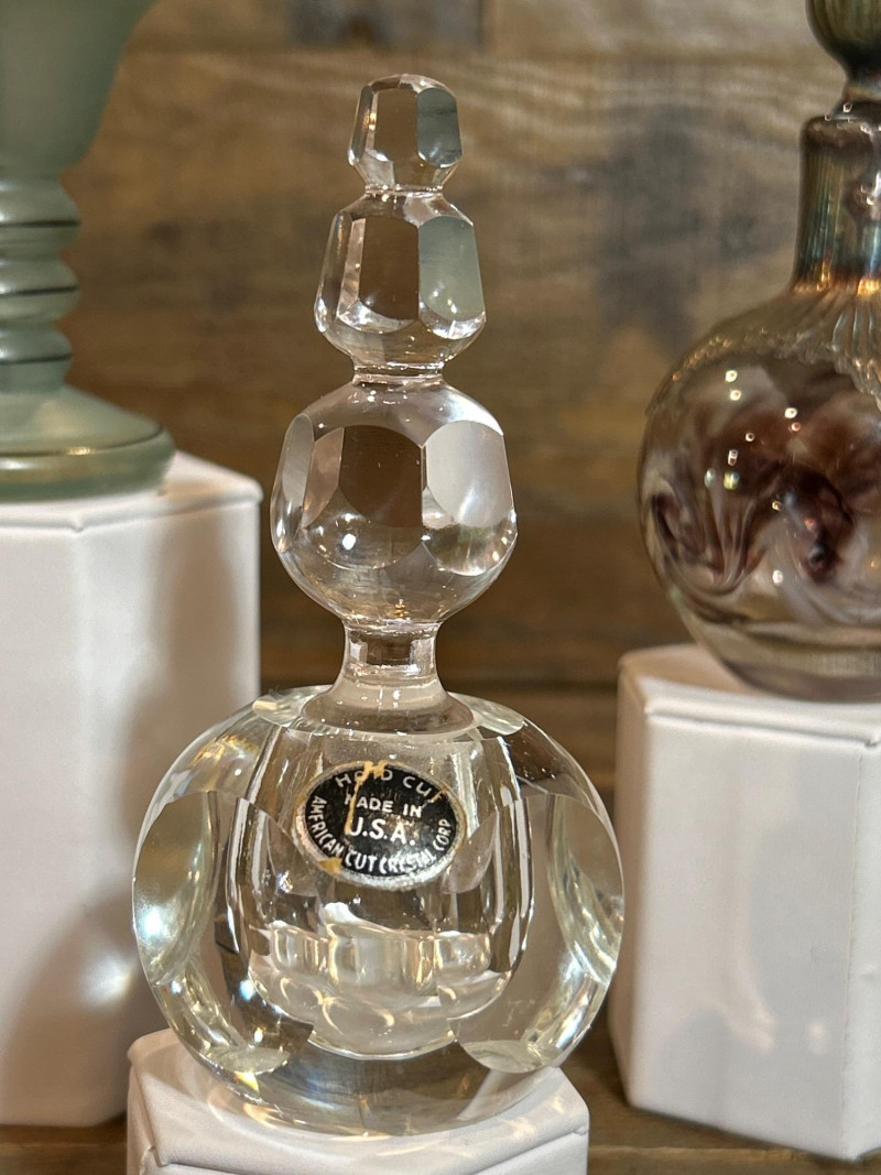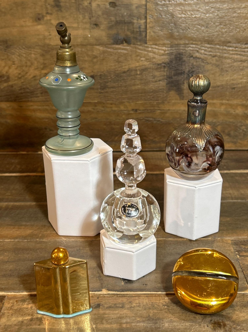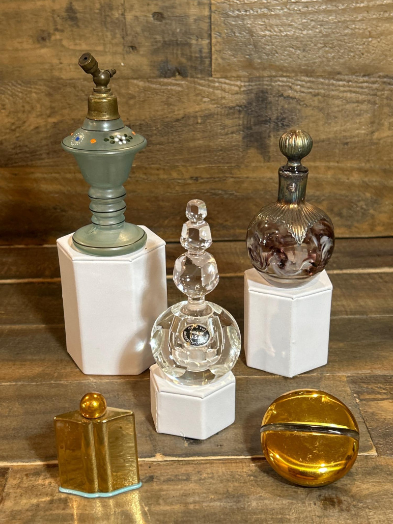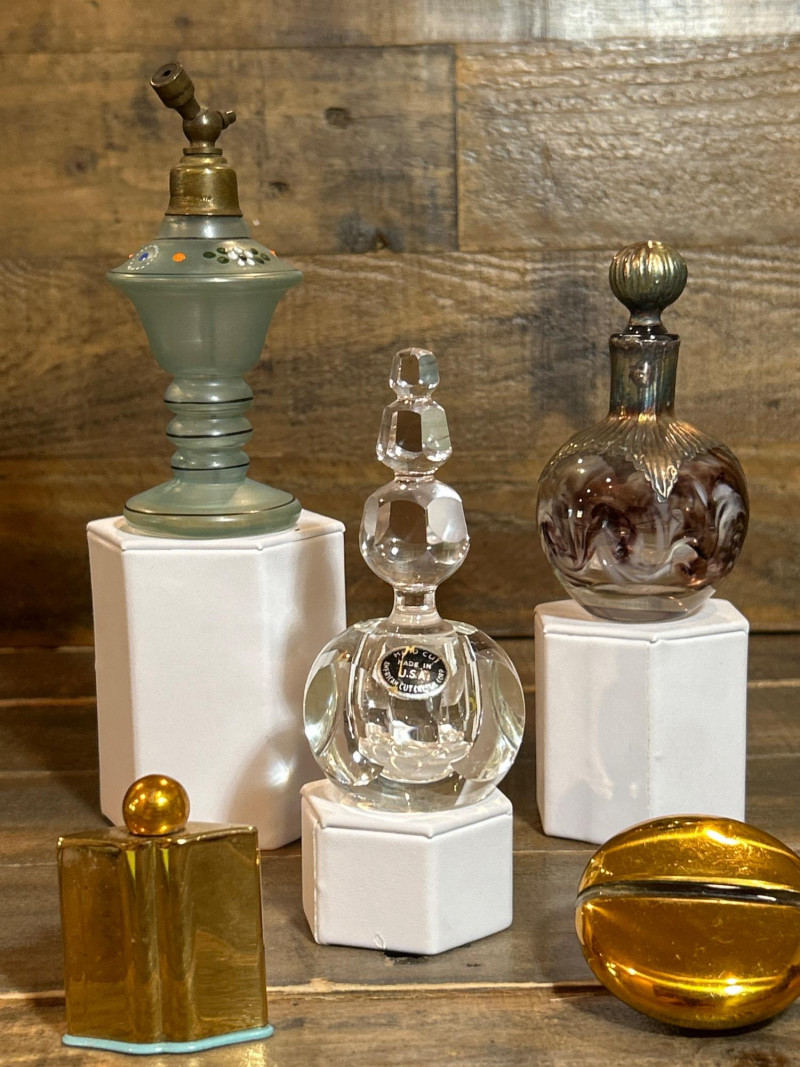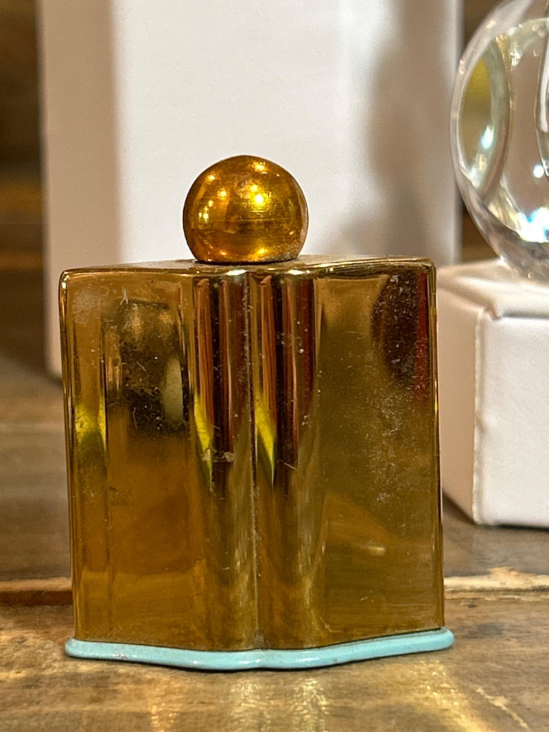 An elegant collection of five vintage perfume bottles spanning early to mid-20th century design. This curated group showcases gilt finishes, enamel decoration, precision-cut crystal, and studio-blown art glass—each reflecting the evolving artistry of vanity presentation. Maker: Coty, New York–Paris Mark: “COTY / NEW YORK / PARIS / CONT. 0.13 FL. OZ.” (base) Material: Gilt glass with aqua enamel base and round gold stopper Period: Circa 1950s Dimensions: Approx. 2 in H Description: Elegant hexagonal form with reflective gold finish and turquoise enamel trim, emblematic of Coty’s postwar miniature perfume series. Collecting Note: A refined flacon exemplifying Coty’s mid-century luxury packaging aesthetics. Maker: American Cut Crystal Corp., U.S.A. Mark: Foil label: “Hand Cut / Made in U.S.A. / American Cut Crystal Corp.” Material: Clear faceted lead crystal Period: Mid-20th century Dimensions: Approx. 4.5 in H Description: Spherical bottle with precision-cut facets and a three-tier stopper, offering exceptional clarity and light refraction. Collecting Note: A fine example of American crystal craftsmanship, ideal for collectors of vanity glass and decorative cutware. Material: Hand-blown glass with plum and white marbling, iridescent collar, and ribbed stopper Period: Late 20th century Dimensions: Approx. 4.25 in H Description: Swirled art glass body with organic patterning and metallic luster, merging studio glass artistry with functional perfume design. Collecting Note: A visually captivating, contemporary interpretation of classic perfume bottle form. Origin: Likely Bohemian or French Period: Circa 1920s–1930s Material: Frosted aqua glass with polychrome enamel and brass fittings Dimensions: Approx. 5 in H Description: Flared, stepped body with enamel dot motifs in blue, orange, white, and green; fitted with original patinated brass sprayer. Collecting Note: A charming Art Deco vanity piece combining whimsical color with fine European glasswork. Maker: Unmarked (possibly French or American) Period: Circa 1950s–1960s Material: Gilt glass with silvertone metal band and hinged opening Dimensions: Approx. 2.25 in diameter Description: Compact spherical travel bottle engraved “E.N.L.” on the lid, opening to reveal a dauber. The brilliant gold finish and modernist form evoke Space Age glamour. Collecting Note: A stylish mid-century travel flacon blending portability and panache—ideal for a modernist vanity display.Coty Paris Mini Perfume Bottle