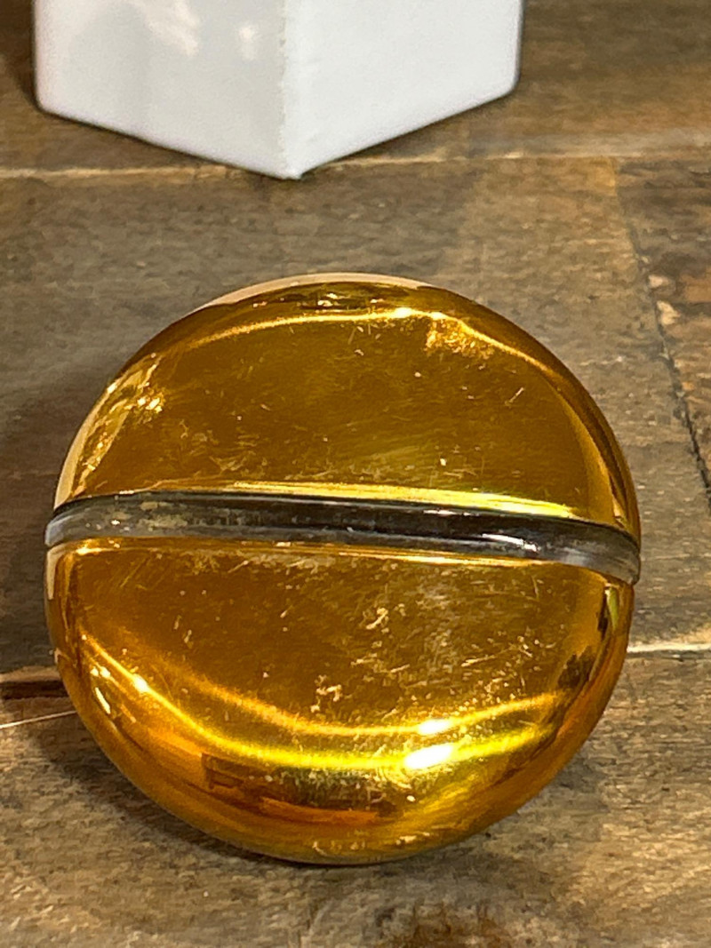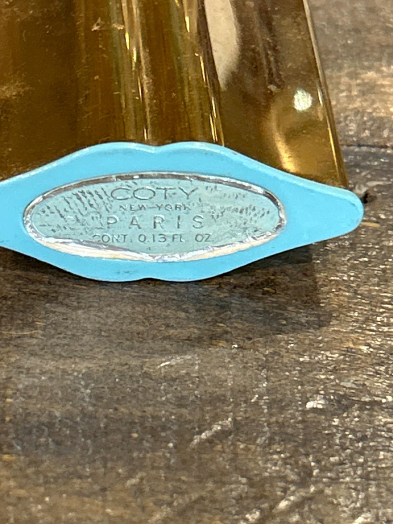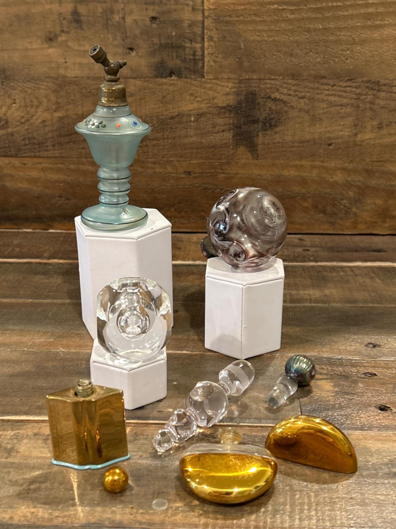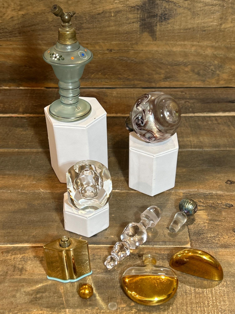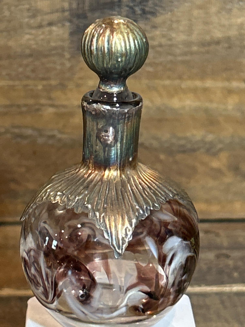 An elegant collection of five vintage perfume bottles spanning early to mid-20th century design. This curated group showcases gilt finishes, enamel decoration, precision-cut crystal, and studio-blown art glass—each reflecting the evolving artistry of vanity presentation. Maker: Coty, New York–Paris Mark: “COTY / NEW YORK / PARIS / CONT. 0.13 FL. OZ.” (base) Material: Gilt glass with aqua enamel base and round gold stopper Period: Circa 1950s Dimensions: Approx. 2 in H Description: Elegant hexagonal form with reflective gold finish and turquoise enamel trim, emblematic of Coty’s postwar miniature perfume series. Collecting Note: A refined flacon exemplifying Coty’s mid-century luxury packaging aesthetics. Maker: American Cut Crystal Corp., U.S.A. Mark: Foil label: “Hand Cut / Made in U.S.A. / American Cut Crystal Corp.” Material: Clear faceted lead crystal Period: Mid-20th century Dimensions: Approx. 4.5 in H Description: Spherical bottle with precision-cut facets and a three-tier stopper, offering exceptional clarity and light refraction. Collecting Note: A fine example of American crystal craftsmanship, ideal for collectors of vanity glass and decorative cutware. Material: Hand-blown glass with plum and white marbling, iridescent collar, and ribbed stopper Period: Late 20th century Dimensions: Approx. 4.25 in H Description: Swirled art glass body with organic patterning and metallic luster, merging studio glass artistry with functional perfume design. Collecting Note: A visually captivating, contemporary interpretation of classic perfume bottle form. Origin: Likely Bohemian or French Period: Circa 1920s–1930s Material: Frosted aqua glass with polychrome enamel and brass fittings Dimensions: Approx. 5 in H Description: Flared, stepped body with enamel dot motifs in blue, orange, white, and green; fitted with original patinated brass sprayer. Collecting Note: A charming Art Deco vanity piece combining whimsical color with fine European glasswork. Maker: Unmarked (possibly French or American) Period: Circa 1950s–1960s Material: Gilt glass with silvertone metal band and hinged opening Dimensions: Approx. 2.25 in diameter Description: Compact spherical travel bottle engraved “E.N.L.” on the lid, opening to reveal a dauber. The brilliant gold finish and modernist form evoke Space Age glamour. Collecting Note: A stylish mid-century travel flacon blending portability and panache—ideal for a modernist vanity display.Coty Paris Mini Perfume Bottle