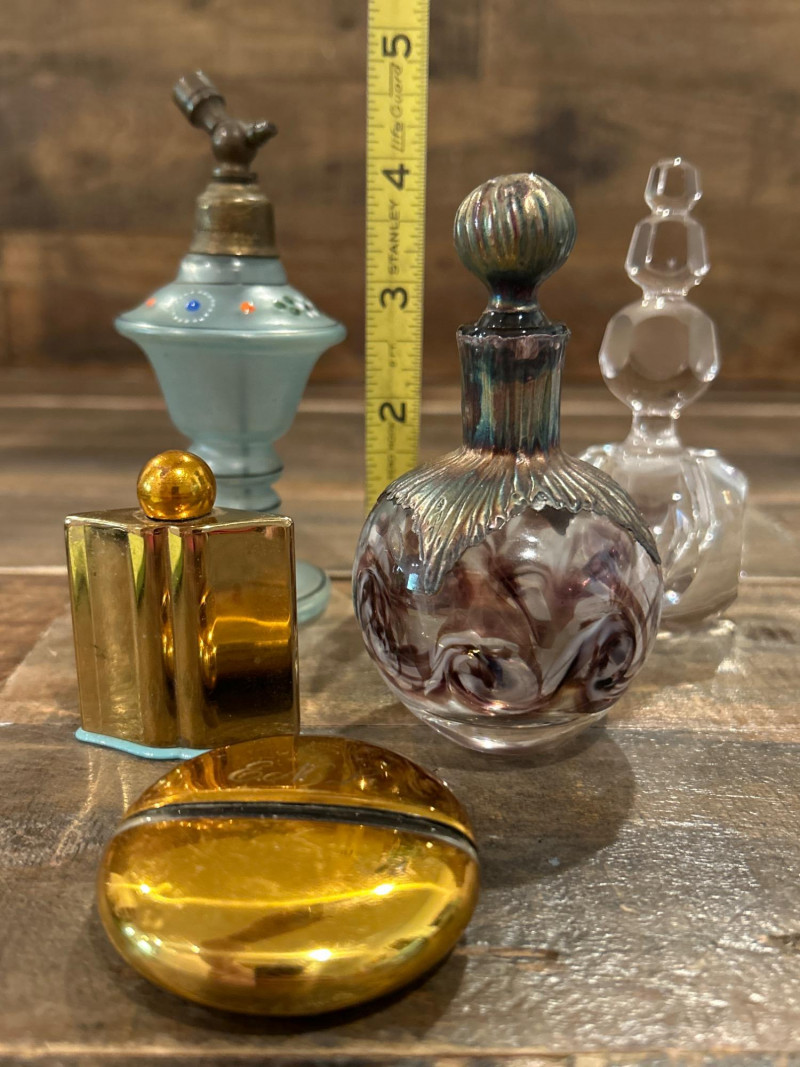 Lot # 70 - Five Vintage Perfume Bottles – Gilt, Crystal, Enamel & Art Glass