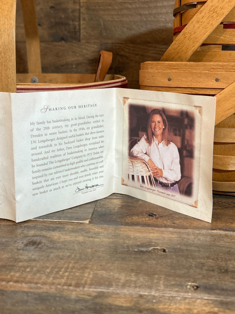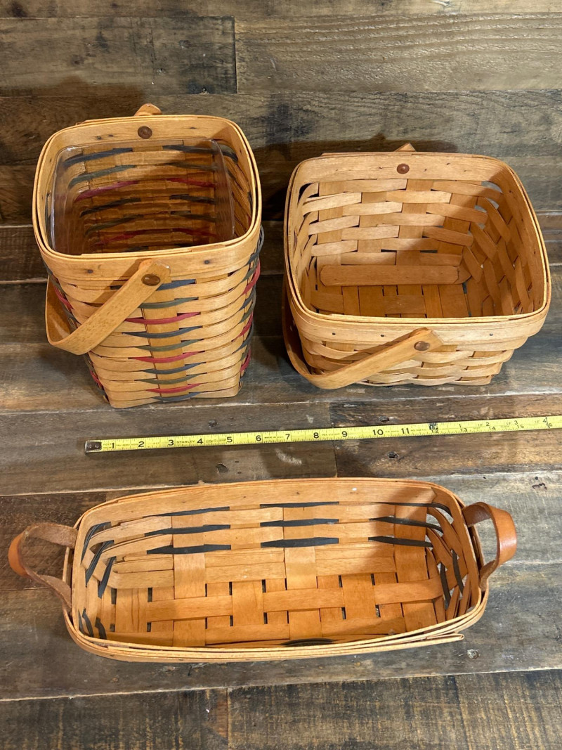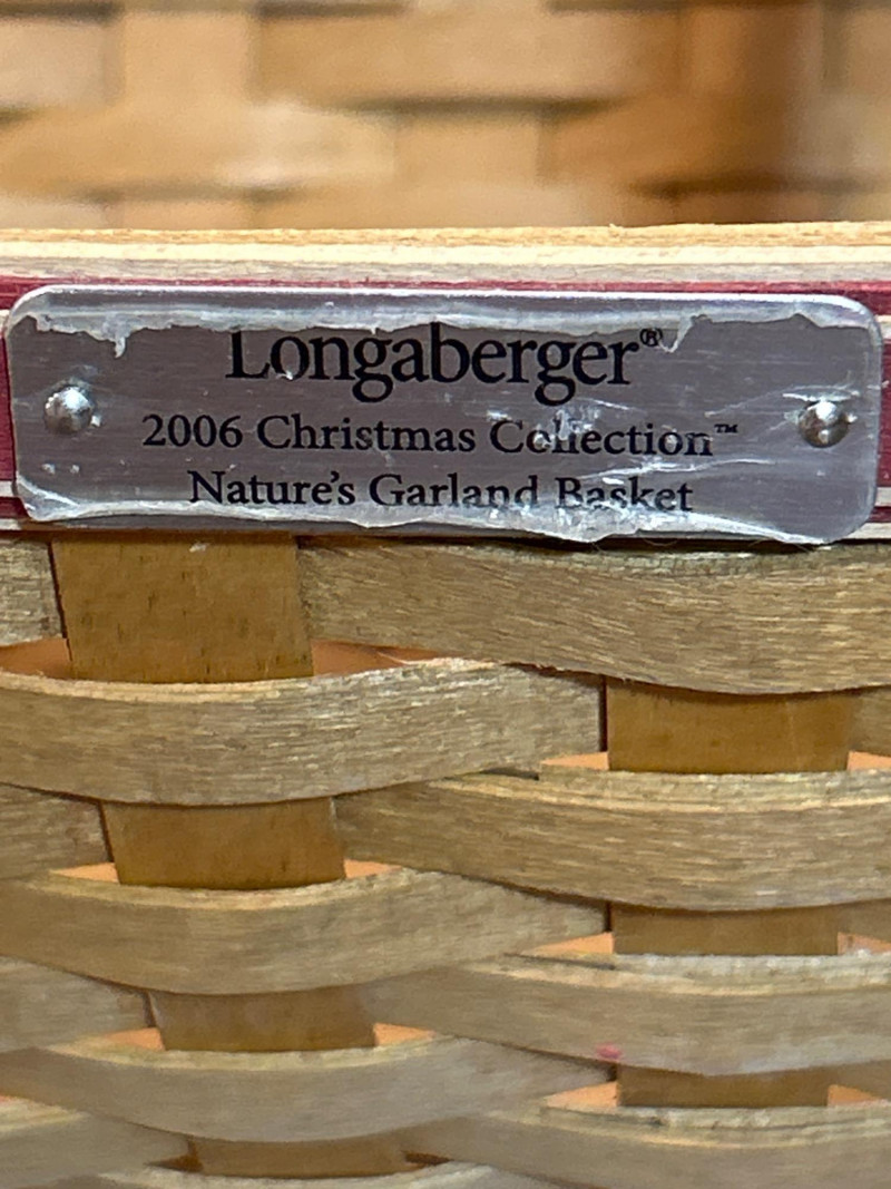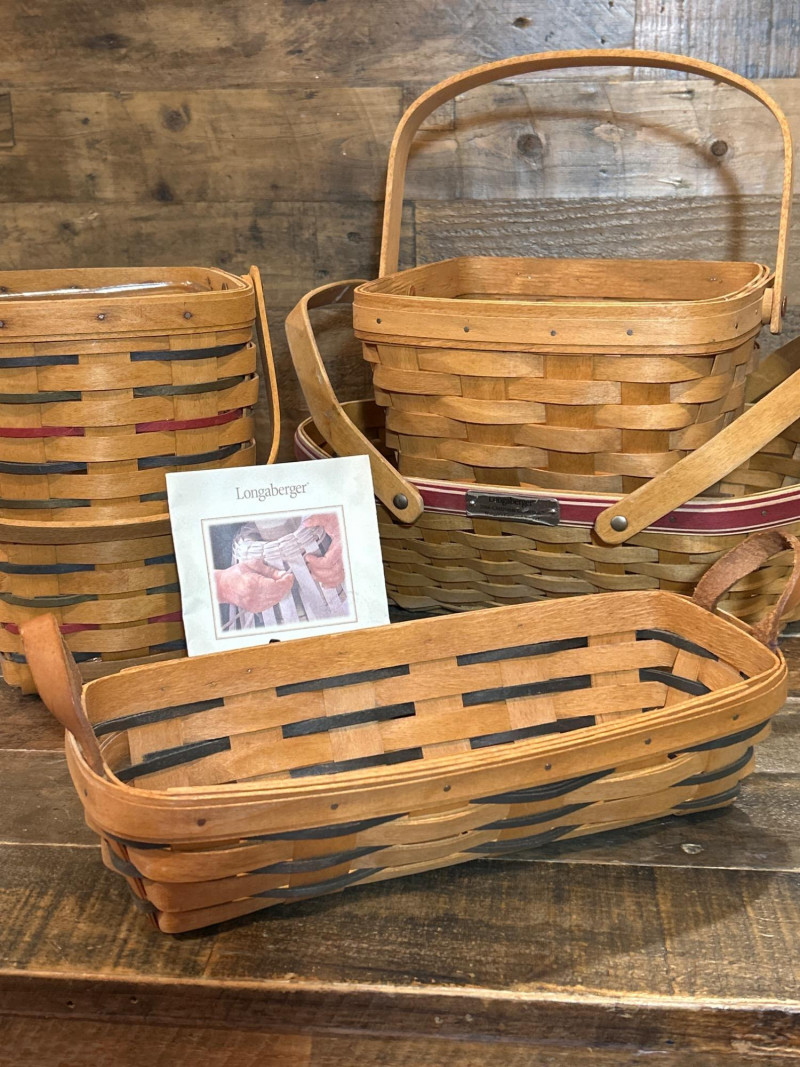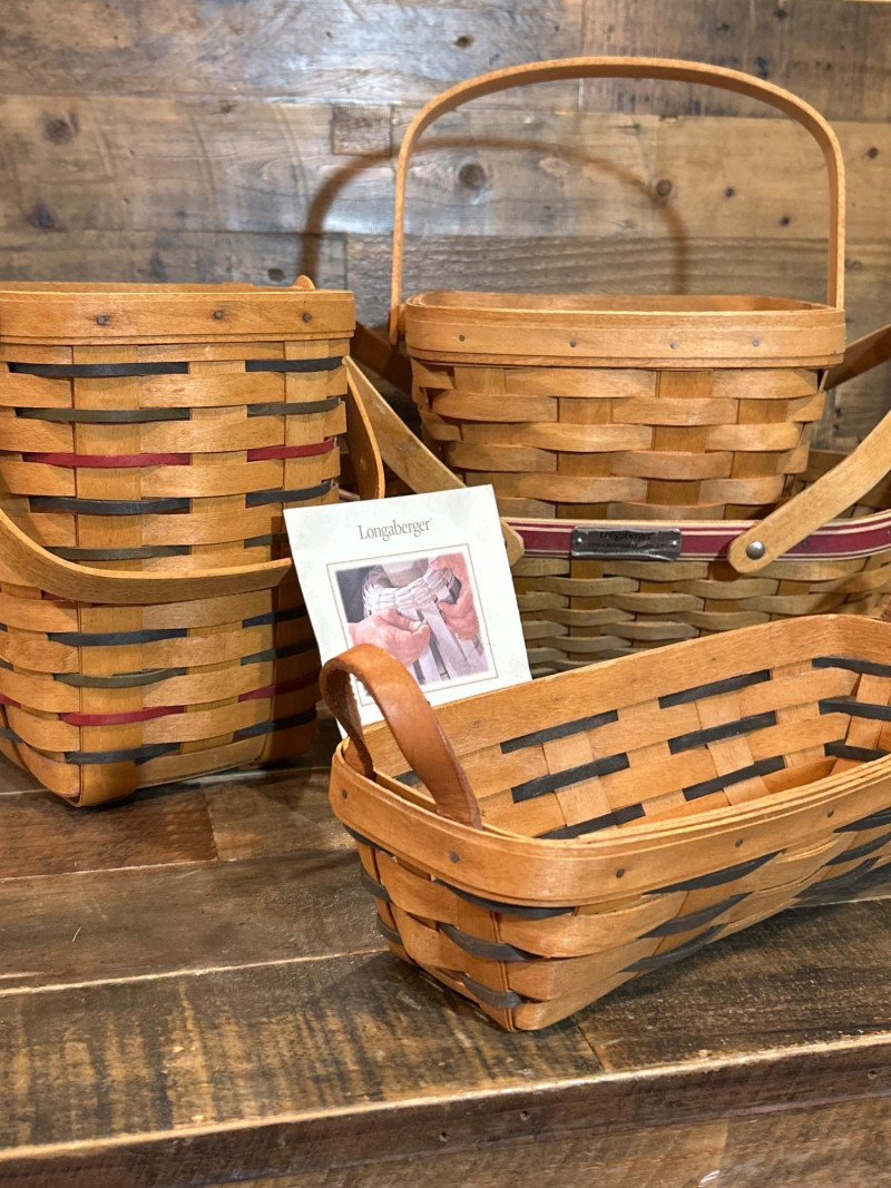 A curated set of four authentic Longaberger baskets, each handwoven in Dresden, Ohio and signed by the original artisan. Spanning 14 years of production, this collection showcases the brand’s legacy of American craftsmanship through classic maple splint weaving, seasonal accents, and varied forms. Includes the 2006 “Nature’s Garland” Christmas basket and original Longaberger brochure signed by Tami Longaberger, detailing care and heritage. Honey maple finish with red accent trim Dual swing handles Metal tag: “Longaberger 2006 Christmas Collection – Nature’s Garland Basket” Base stamped and signed/dated 2006 Approx. 13" L × 7" W × 4.5" H (10" H with handles raised) Rectangular tall form with single swing handle Red and green woven accent bands Includes clear fitted plastic liner Marked “Longaberger Baskets, Handwoven Dresden, Ohio USA – DLM 1995” Approx. 6.5" Sq × 6.5" H (9" H with handle up) Traditional square weave with single swing handle Signed “BJB1 1992” Base stamped “Longaberger Baskets, Handwoven Dresden, Ohio USA” Approx. 7" Sq × 5" H (8" H with handle raised) Long, low rectangular shape with fixed end handles Navy accent bands Signed “SMT 1996” and stamped “Longaberger Baskets, Handwoven Dresden, Ohio USA” Approx. 12.5" L × 4.5" W × 3" H Handwoven maple splints Brass tacks Wooden handles Each basket is signed and dated by its original Longaberger artisan, ensuring authenticity and traceable heritage. Includes the original “Sharing Our Heritage” brochure signed by Tami Longaberger, narrating the family’s basketmaking tradition dating back to the early 1900s.Basket A: 2006 “Nature’s Garland” Christmas Basket