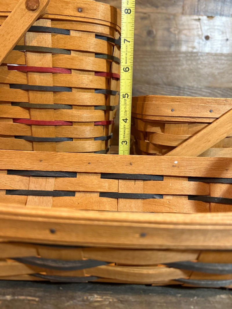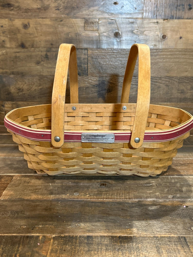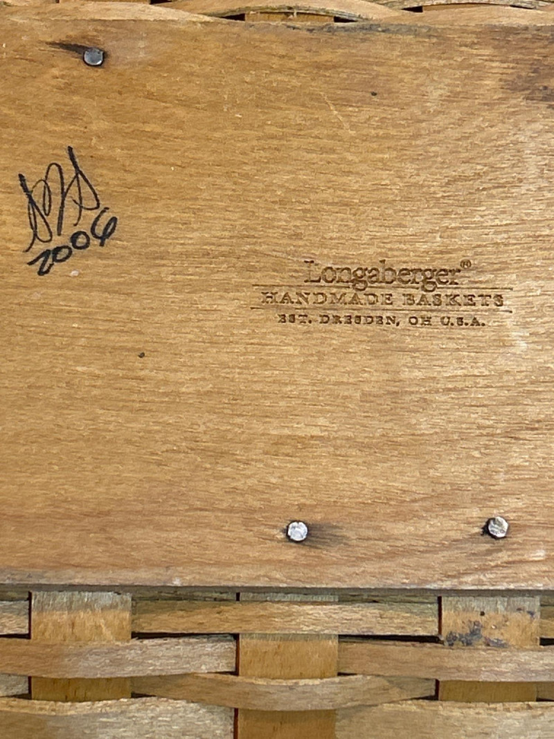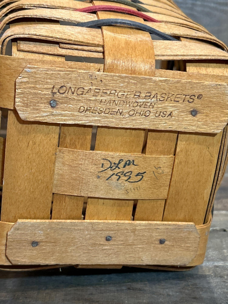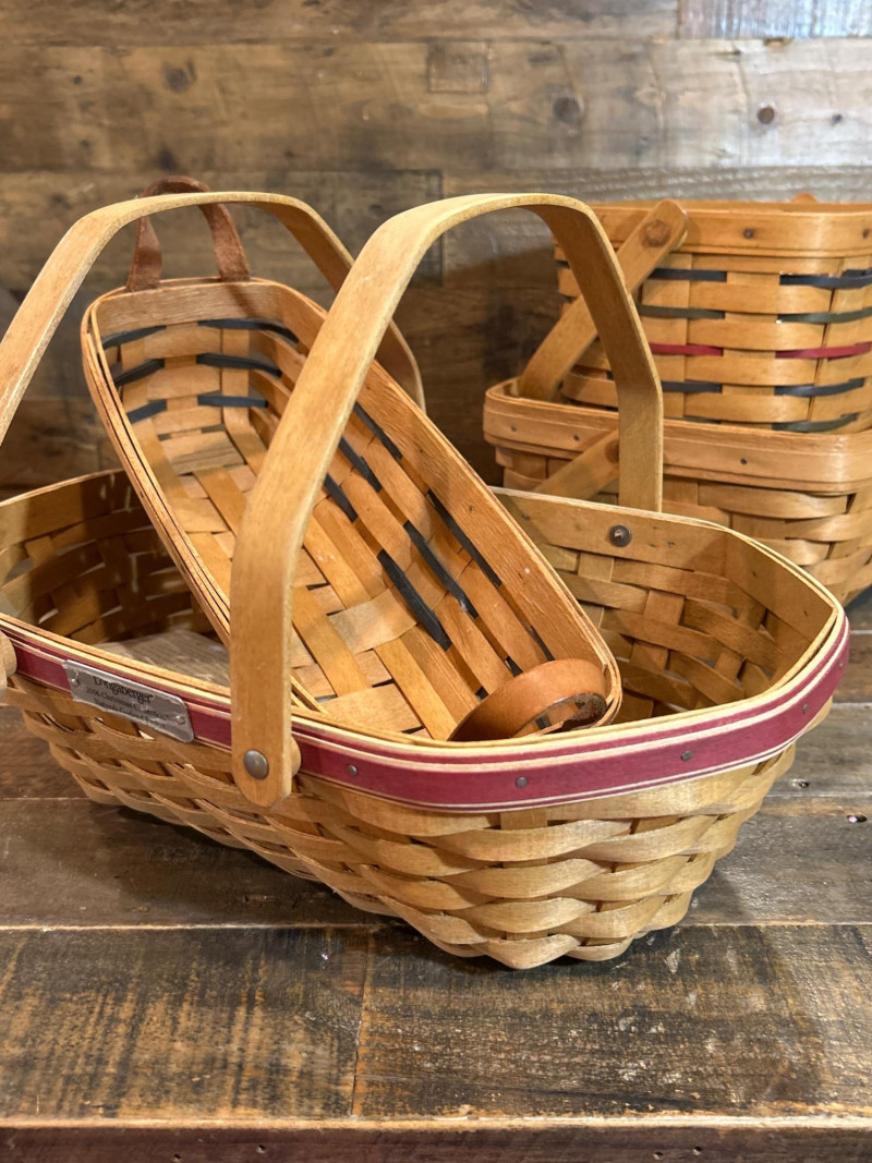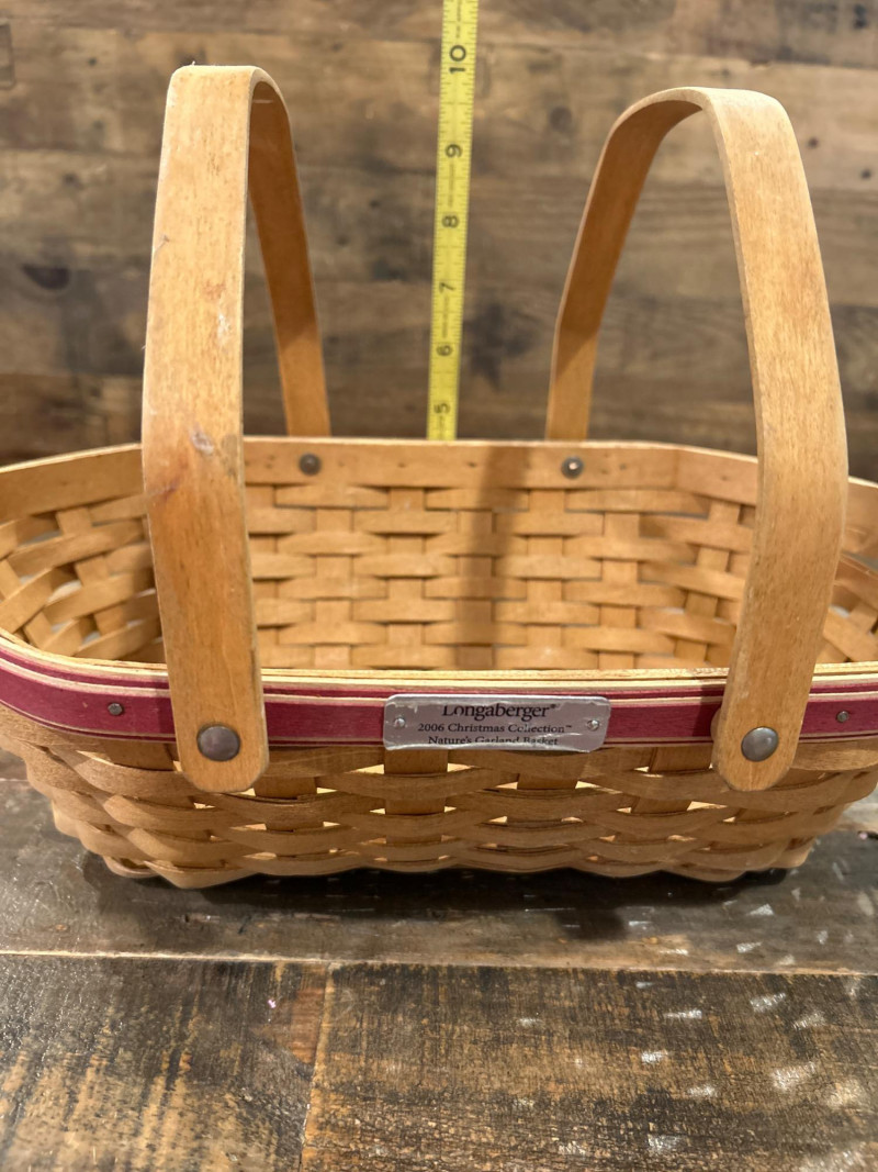 A curated set of four authentic Longaberger baskets, each handwoven in Dresden, Ohio and signed by the original artisan. Spanning 14 years of production, this collection showcases the brand’s legacy of American craftsmanship through classic maple splint weaving, seasonal accents, and varied forms. Includes the 2006 “Nature’s Garland” Christmas basket and original Longaberger brochure signed by Tami Longaberger, detailing care and heritage. Honey maple finish with red accent trim Dual swing handles Metal tag: “Longaberger 2006 Christmas Collection – Nature’s Garland Basket” Base stamped and signed/dated 2006 Approx. 13" L × 7" W × 4.5" H (10" H with handles raised) Rectangular tall form with single swing handle Red and green woven accent bands Includes clear fitted plastic liner Marked “Longaberger Baskets, Handwoven Dresden, Ohio USA – DLM 1995” Approx. 6.5" Sq × 6.5" H (9" H with handle up) Traditional square weave with single swing handle Signed “BJB1 1992” Base stamped “Longaberger Baskets, Handwoven Dresden, Ohio USA” Approx. 7" Sq × 5" H (8" H with handle raised) Long, low rectangular shape with fixed end handles Navy accent bands Signed “SMT 1996” and stamped “Longaberger Baskets, Handwoven Dresden, Ohio USA” Approx. 12.5" L × 4.5" W × 3" H Handwoven maple splints Brass tacks Wooden handles Each basket is signed and dated by its original Longaberger artisan, ensuring authenticity and traceable heritage. Includes the original “Sharing Our Heritage” brochure signed by Tami Longaberger, narrating the family’s basketmaking tradition dating back to the early 1900s.Basket A: 2006 “Nature’s Garland” Christmas Basket