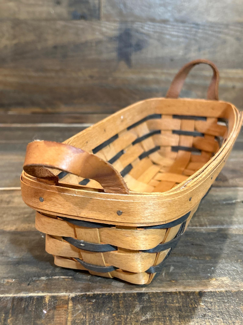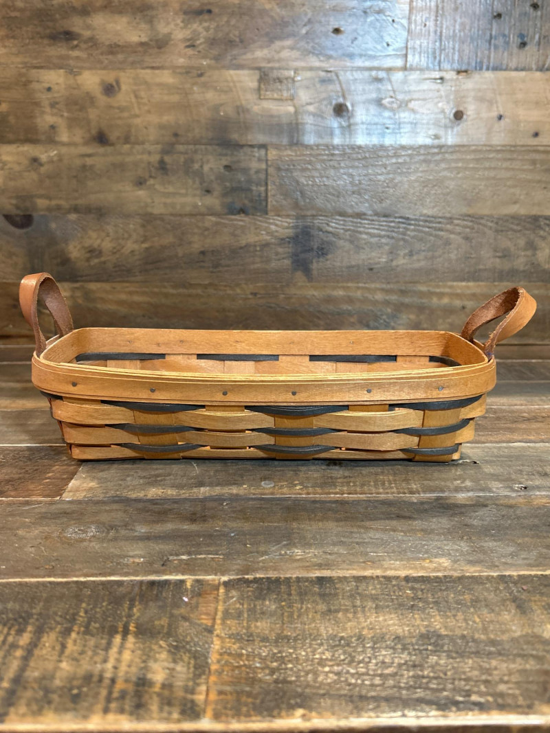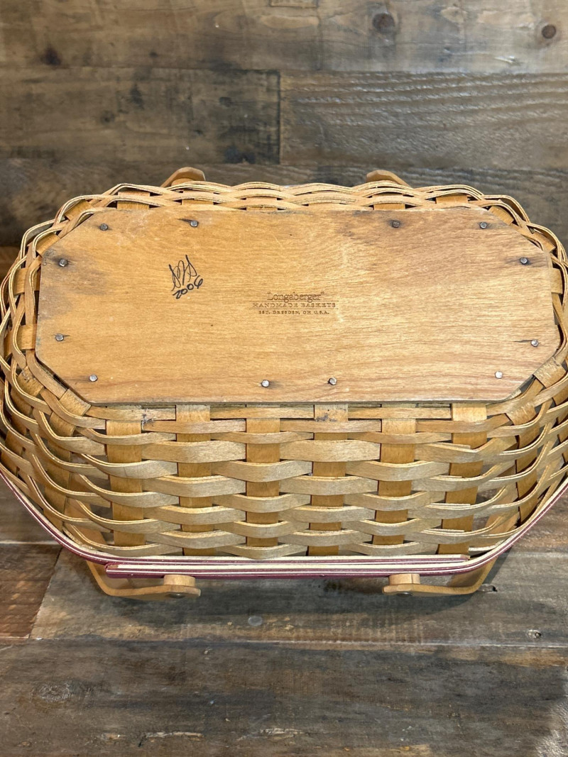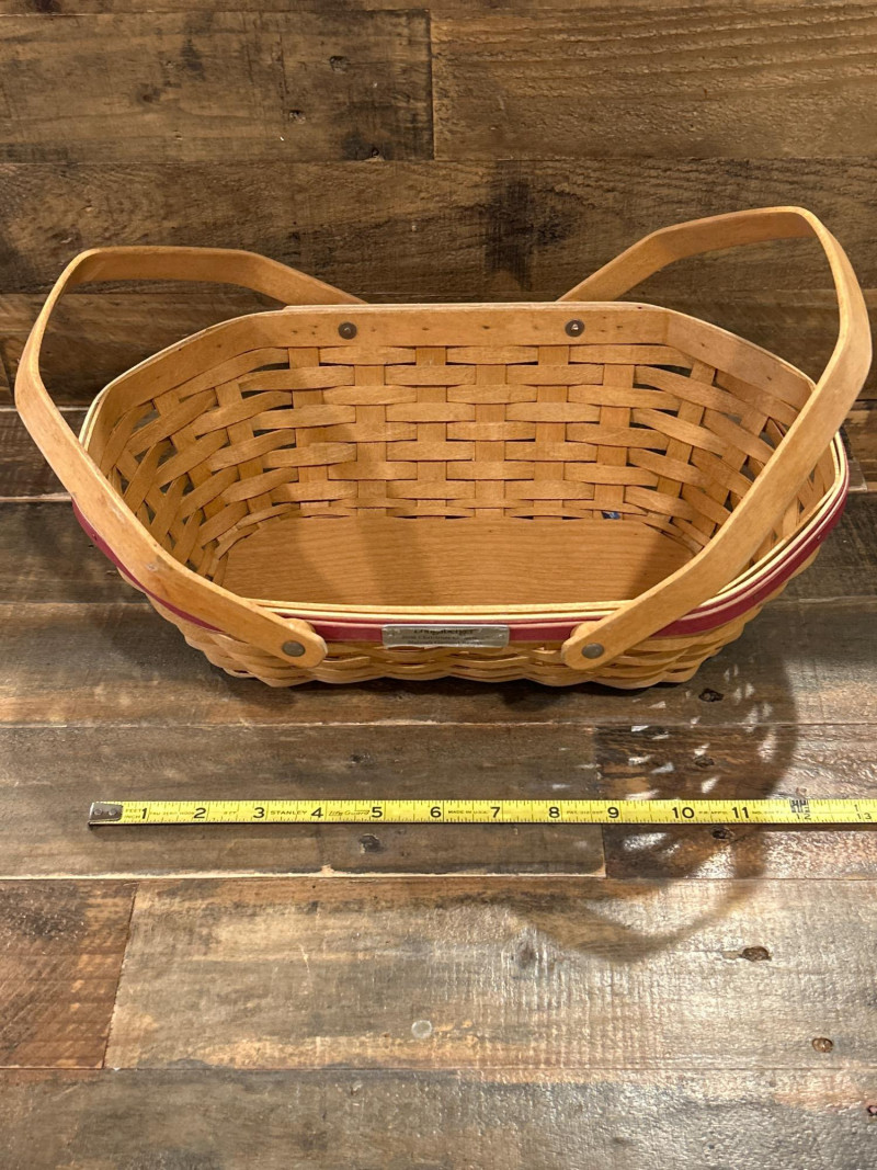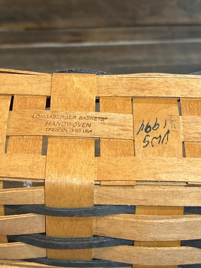 A curated set of four authentic Longaberger baskets, each handwoven in Dresden, Ohio and signed by the original artisan. Spanning 14 years of production, this collection showcases the brand’s legacy of American craftsmanship through classic maple splint weaving, seasonal accents, and varied forms. Includes the 2006 “Nature’s Garland” Christmas basket and original Longaberger brochure signed by Tami Longaberger, detailing care and heritage. Honey maple finish with red accent trim Dual swing handles Metal tag: “Longaberger 2006 Christmas Collection – Nature’s Garland Basket” Base stamped and signed/dated 2006 Approx. 13" L × 7" W × 4.5" H (10" H with handles raised) Rectangular tall form with single swing handle Red and green woven accent bands Includes clear fitted plastic liner Marked “Longaberger Baskets, Handwoven Dresden, Ohio USA – DLM 1995” Approx. 6.5" Sq × 6.5" H (9" H with handle up) Traditional square weave with single swing handle Signed “BJB1 1992” Base stamped “Longaberger Baskets, Handwoven Dresden, Ohio USA” Approx. 7" Sq × 5" H (8" H with handle raised) Long, low rectangular shape with fixed end handles Navy accent bands Signed “SMT 1996” and stamped “Longaberger Baskets, Handwoven Dresden, Ohio USA” Approx. 12.5" L × 4.5" W × 3" H Handwoven maple splints Brass tacks Wooden handles Each basket is signed and dated by its original Longaberger artisan, ensuring authenticity and traceable heritage. Includes the original “Sharing Our Heritage” brochure signed by Tami Longaberger, narrating the family’s basketmaking tradition dating back to the early 1900s.Basket A: 2006 “Nature’s Garland” Christmas Basket