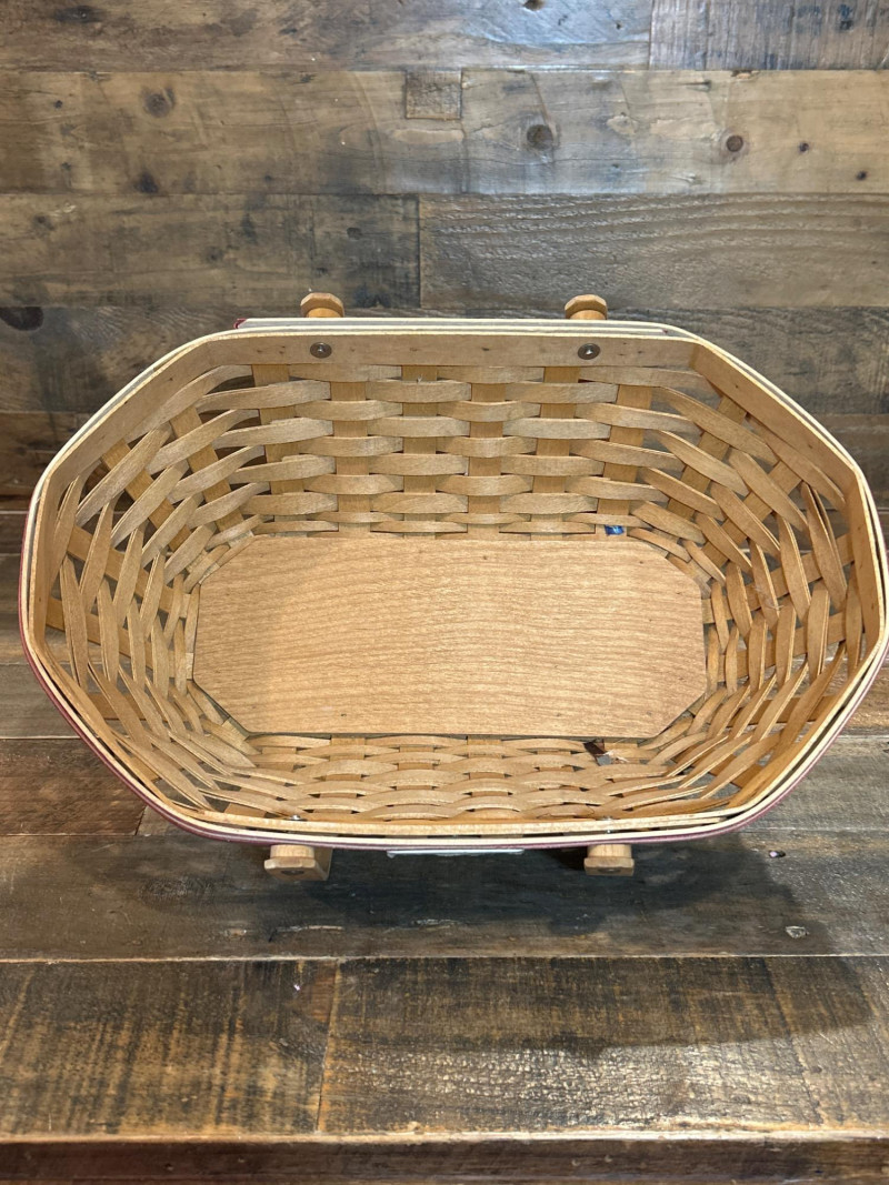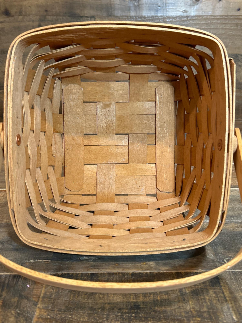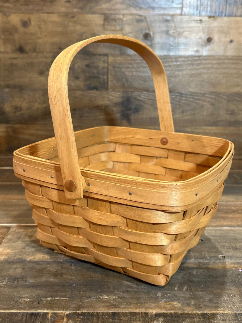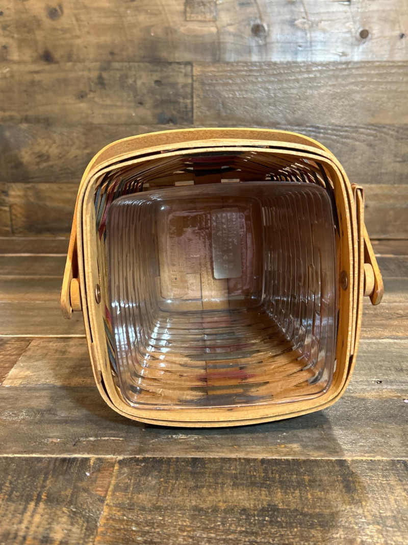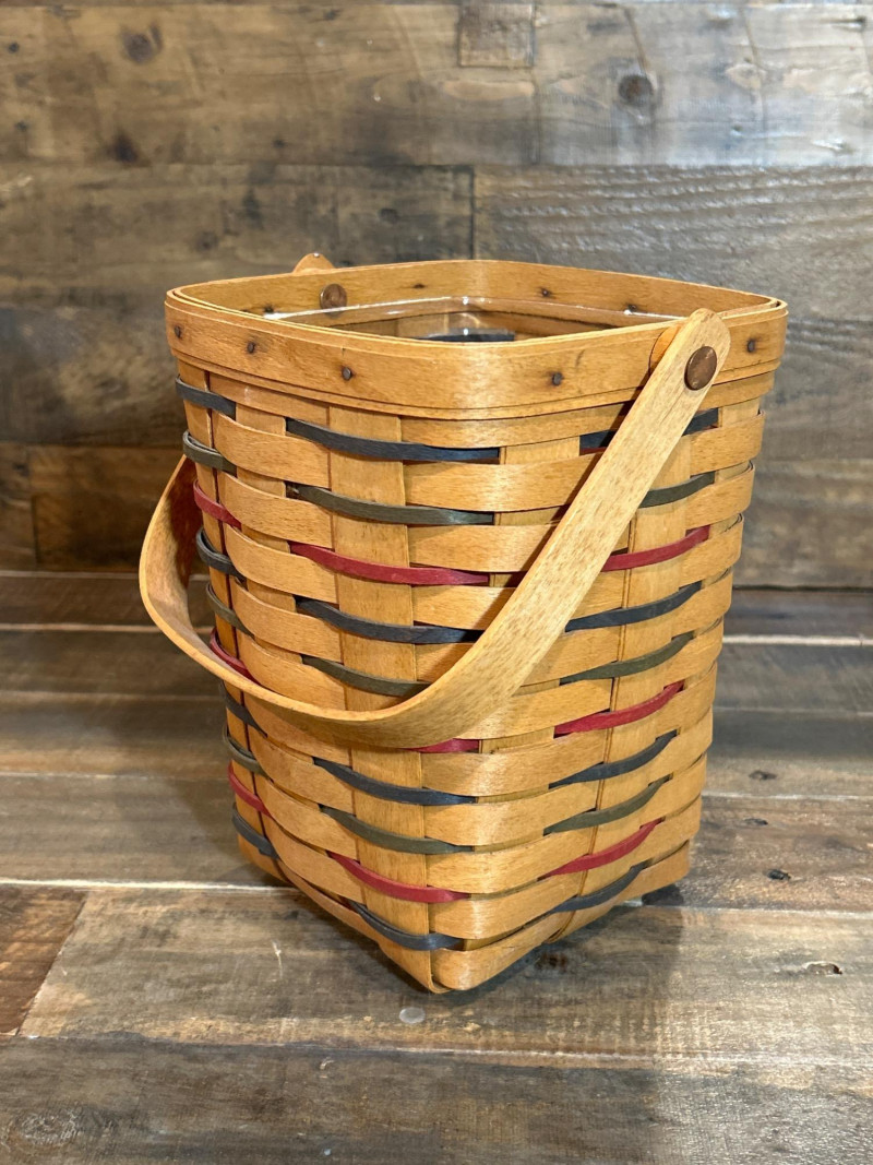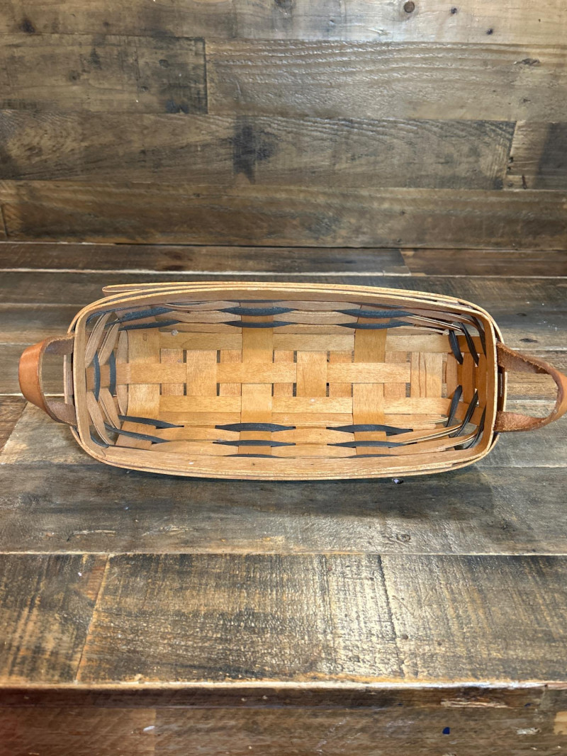 A curated set of four authentic Longaberger baskets, each handwoven in Dresden, Ohio and signed by the original artisan. Spanning 14 years of production, this collection showcases the brand’s legacy of American craftsmanship through classic maple splint weaving, seasonal accents, and varied forms. Includes the 2006 “Nature’s Garland” Christmas basket and original Longaberger brochure signed by Tami Longaberger, detailing care and heritage. Honey maple finish with red accent trim Dual swing handles Metal tag: “Longaberger 2006 Christmas Collection – Nature’s Garland Basket” Base stamped and signed/dated 2006 Approx. 13" L × 7" W × 4.5" H (10" H with handles raised) Rectangular tall form with single swing handle Red and green woven accent bands Includes clear fitted plastic liner Marked “Longaberger Baskets, Handwoven Dresden, Ohio USA – DLM 1995” Approx. 6.5" Sq × 6.5" H (9" H with handle up) Traditional square weave with single swing handle Signed “BJB1 1992” Base stamped “Longaberger Baskets, Handwoven Dresden, Ohio USA” Approx. 7" Sq × 5" H (8" H with handle raised) Long, low rectangular shape with fixed end handles Navy accent bands Signed “SMT 1996” and stamped “Longaberger Baskets, Handwoven Dresden, Ohio USA” Approx. 12.5" L × 4.5" W × 3" H Handwoven maple splints Brass tacks Wooden handles Each basket is signed and dated by its original Longaberger artisan, ensuring authenticity and traceable heritage. Includes the original “Sharing Our Heritage” brochure signed by Tami Longaberger, narrating the family’s basketmaking tradition dating back to the early 1900s.Basket A: 2006 “Nature’s Garland” Christmas Basket