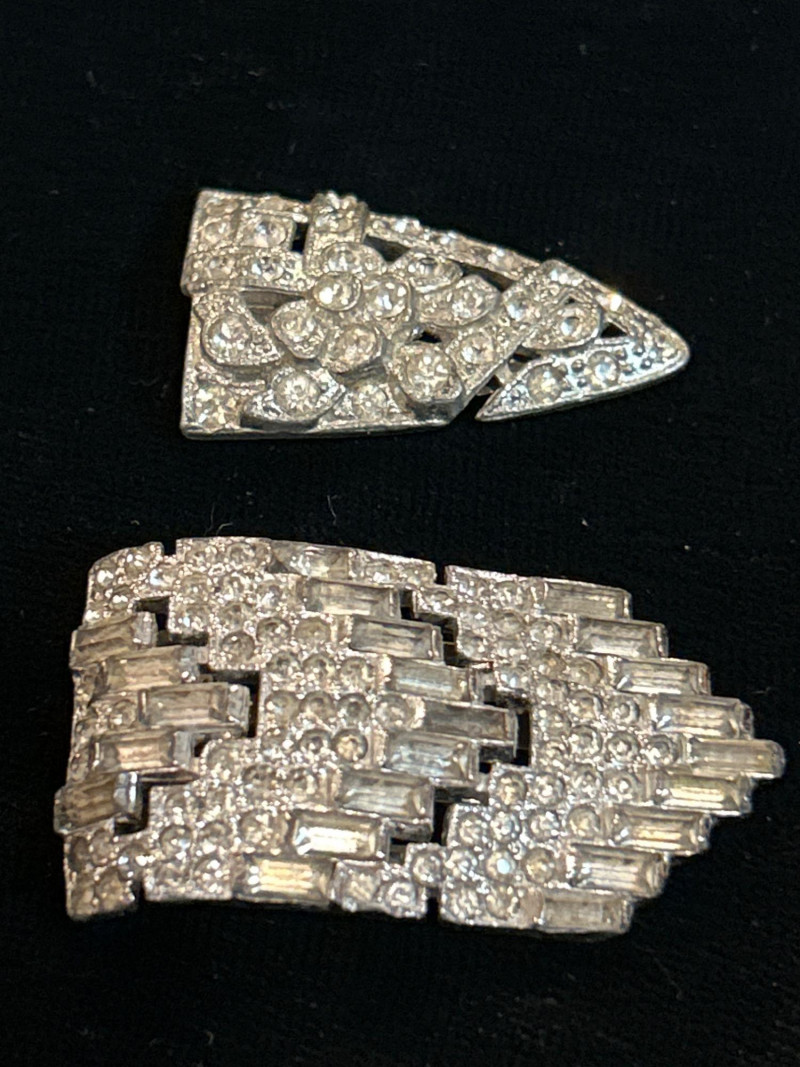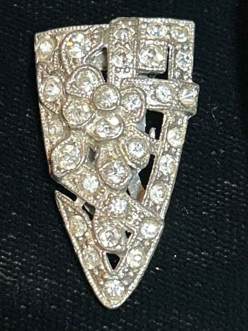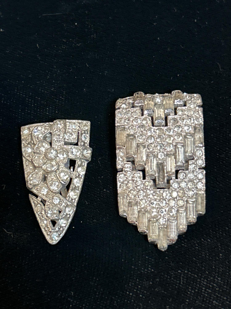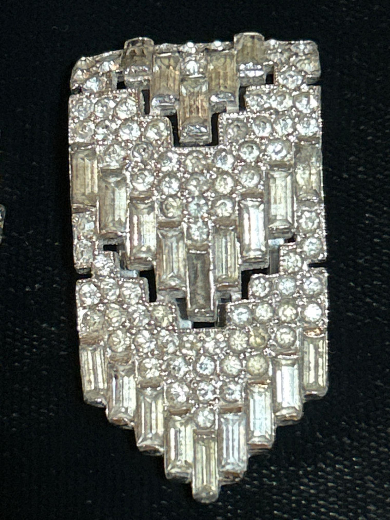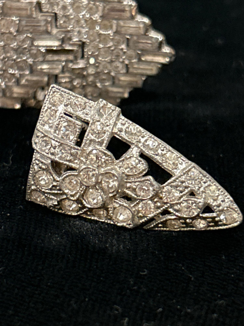 Art Deco Geometric Chevron Rhinestone Dress Clip (c.1930s) Dimensions: Approx. 2.5" long × 1.25" wide Material: Rhodium-plated silvertone metal Stones: Clear rhinestones, round and baguette cuts Design: Bold stepped chevron motif with tiered baguette and pavé-set round stones, arranged in a precise geometric Art Deco pattern Mechanism: Hinged dress clip with secure spring tension clasp (not a pin-back brooch) Era: Circa 1930s Style Notes: Exemplifies the architectural precision and symmetry of late Deco design, reflecting influences seen in early Eisenberg or Trifari pieces Art Deco Floral Shield Rhinestone Dress Clip (c.1920s–1930s) Dimensions: Approx. 1.75" long × 1" wide Material: Rhodium-plated silvertone metal Stones: Clear rhinestones / diamante glass Design: Shield-form openwork clip with floral cluster motif framed by angular geometric lines, pavé-set with brilliant rhinestones Mechanism: Hinged clip back, fully functional; designed to clasp securely on fabric Era: Late 1920s to early 1930s Style Notes: Closely matches documented 1920s Art Deco fur clips featuring paste rhinestones; combines feminine floral detailing with modernist geometry typical of the Jazz Age aesthetic