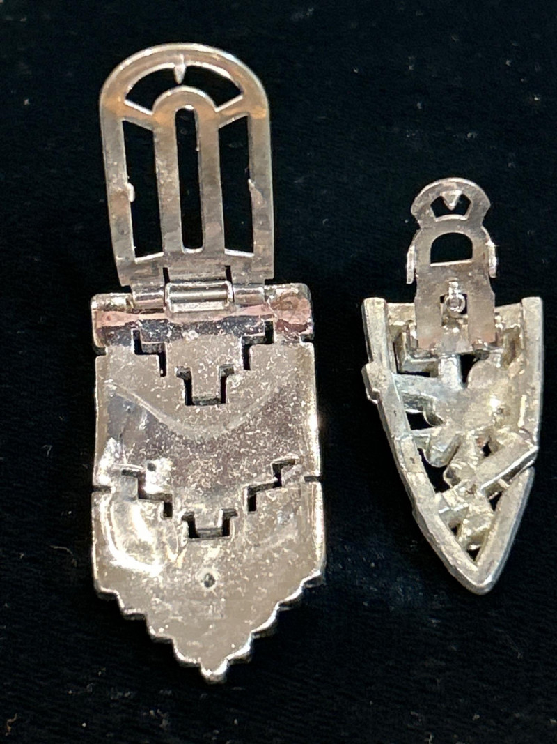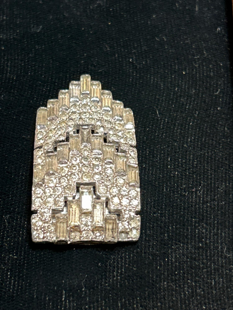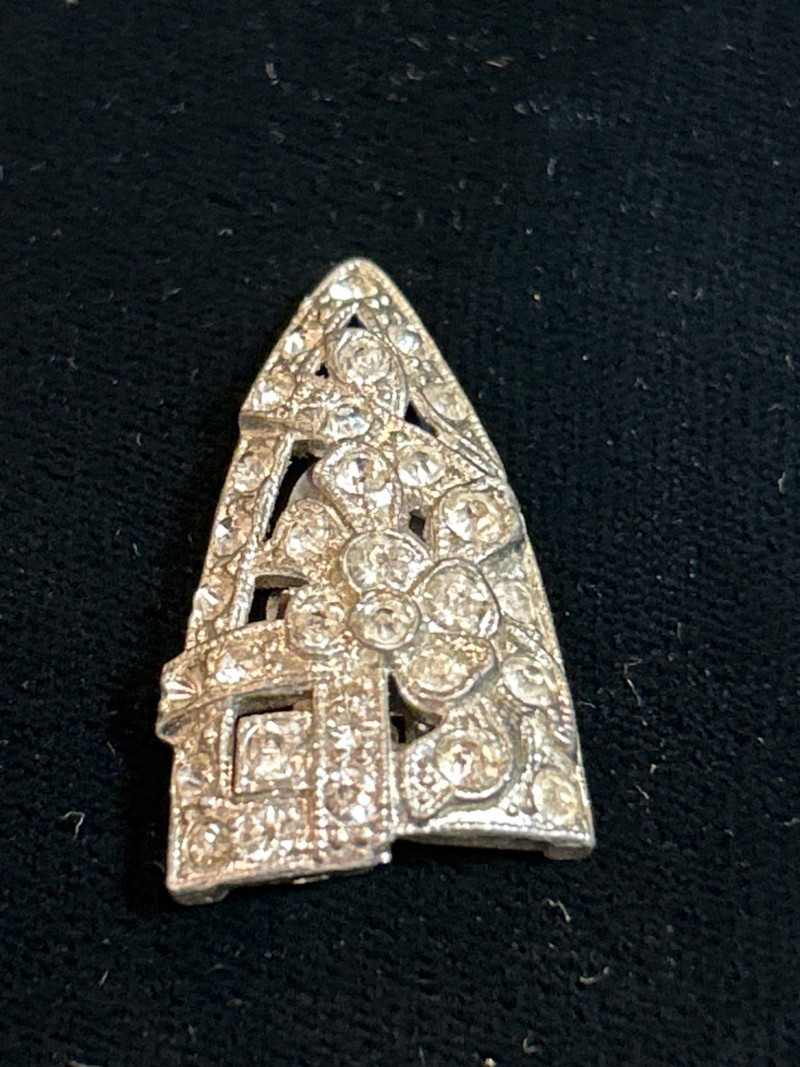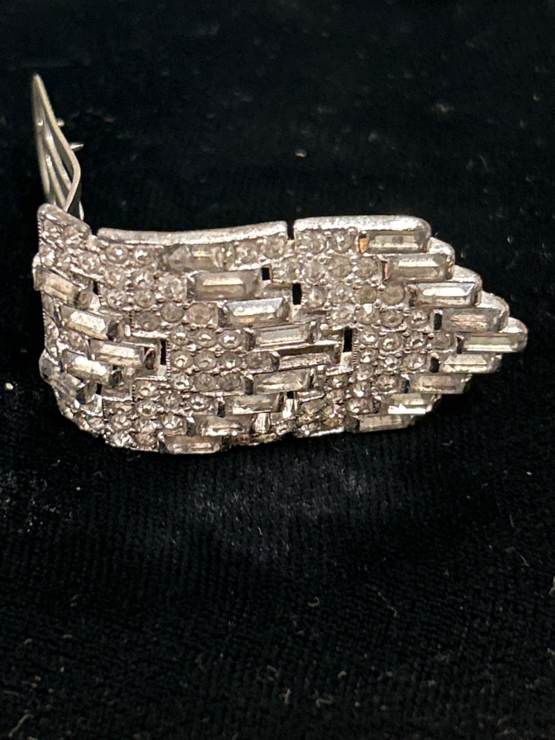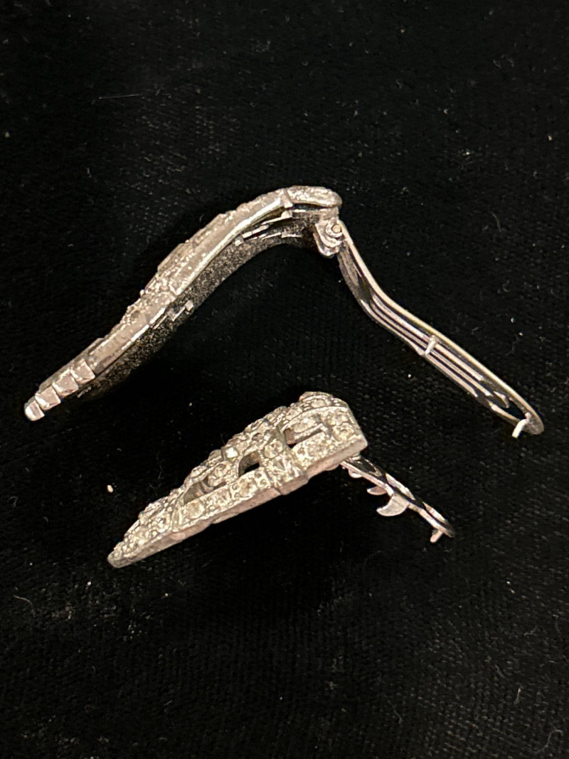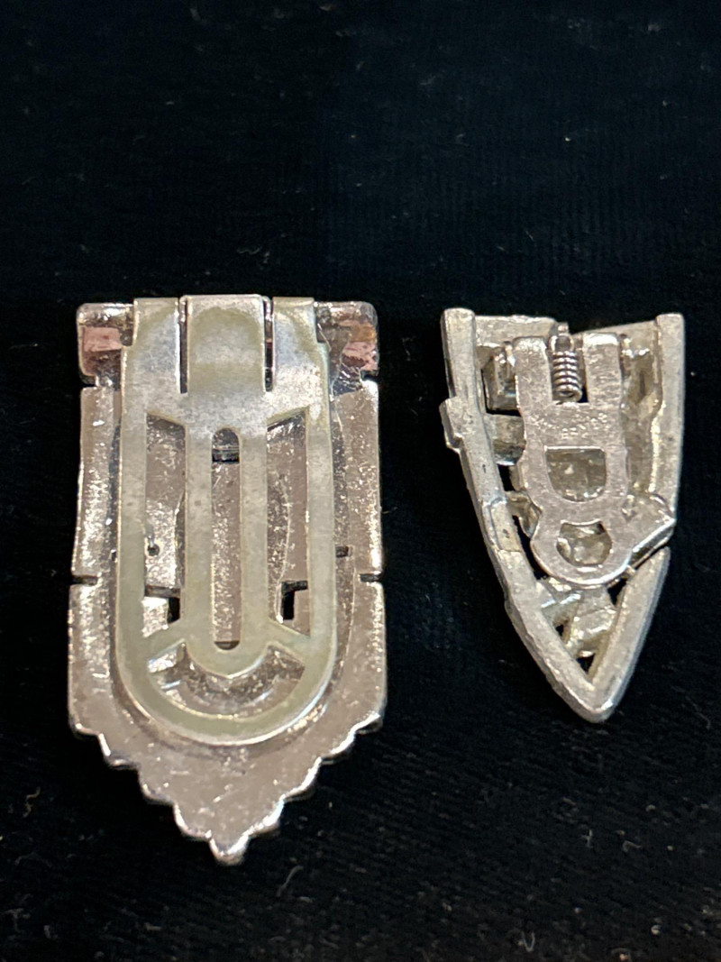 Art Deco Geometric Chevron Rhinestone Dress Clip (c.1930s) Dimensions: Approx. 2.5" long × 1.25" wide Material: Rhodium-plated silvertone metal Stones: Clear rhinestones, round and baguette cuts Design: Bold stepped chevron motif with tiered baguette and pavé-set round stones, arranged in a precise geometric Art Deco pattern Mechanism: Hinged dress clip with secure spring tension clasp (not a pin-back brooch) Era: Circa 1930s Style Notes: Exemplifies the architectural precision and symmetry of late Deco design, reflecting influences seen in early Eisenberg or Trifari pieces Art Deco Floral Shield Rhinestone Dress Clip (c.1920s–1930s) Dimensions: Approx. 1.75" long × 1" wide Material: Rhodium-plated silvertone metal Stones: Clear rhinestones / diamante glass Design: Shield-form openwork clip with floral cluster motif framed by angular geometric lines, pavé-set with brilliant rhinestones Mechanism: Hinged clip back, fully functional; designed to clasp securely on fabric Era: Late 1920s to early 1930s Style Notes: Closely matches documented 1920s Art Deco fur clips featuring paste rhinestones; combines feminine floral detailing with modernist geometry typical of the Jazz Age aesthetic