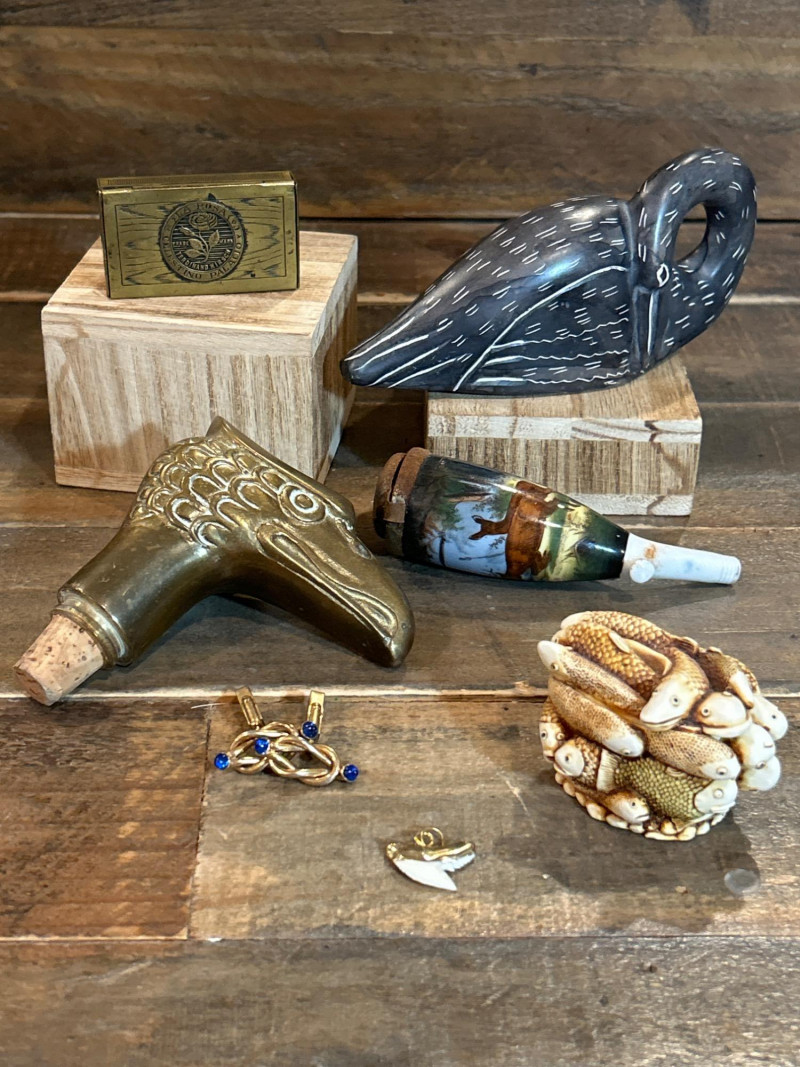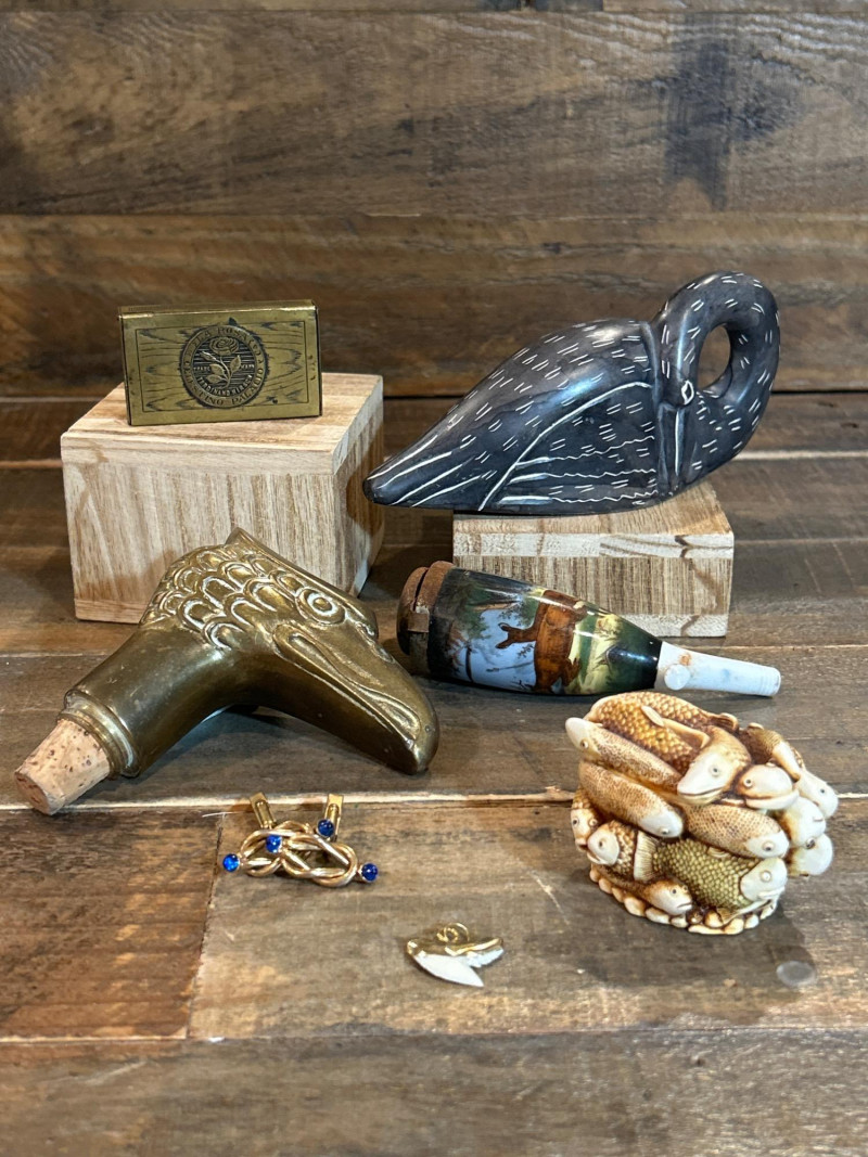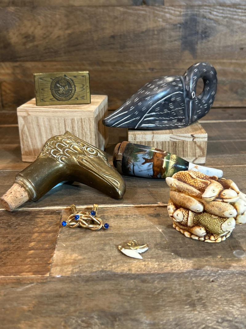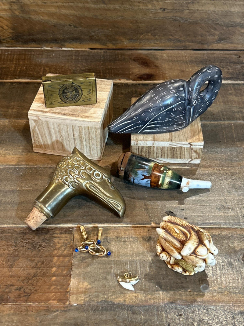 A curated 7-piece collection of vintage and artisan-crafted miniatures, blending brasswork, porcelain, resin, and natural materials. This eclectic lot includes collectible boxes, barware, jewelry, and decorative curios—ideal for collectors, stylists, or display enthusiasts. Included Pieces: Factory No. 60 Brass Match Holder – “La Rosa de Celestino Palacio”