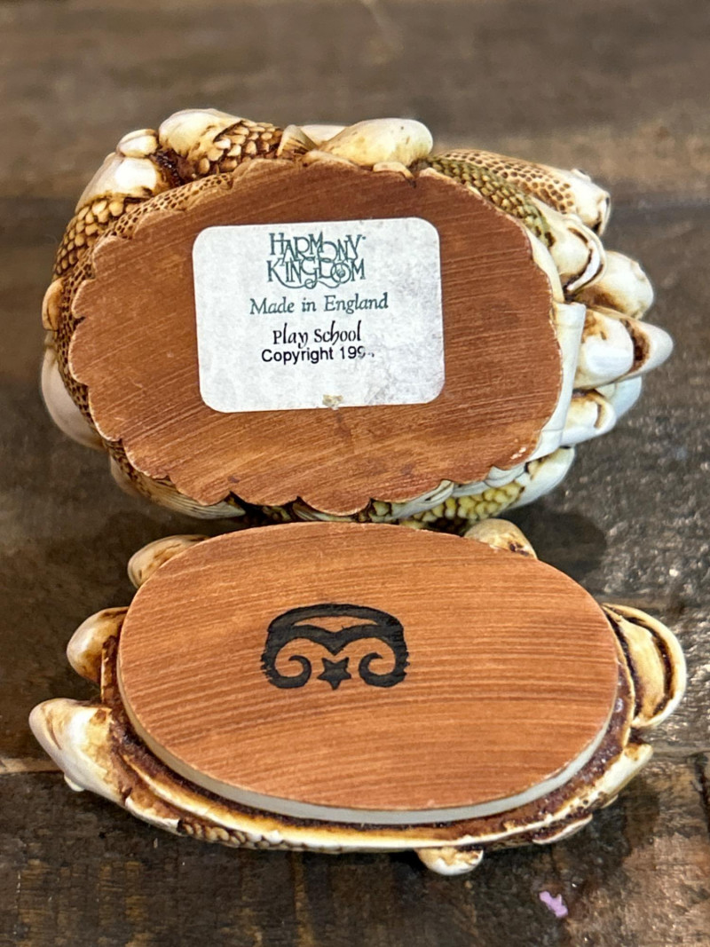Rectangular brass box with engraved rose emblem and “Ferdinand Hirsch” trademark. Circular seal on lid and “Factory No. 60” engraved on the side. Woodgrain-textured brass with industrial styling. Approx. 3.25" x 2.25". Harmony Kingdom Crab Trinket Box – “Play School” (1996)
