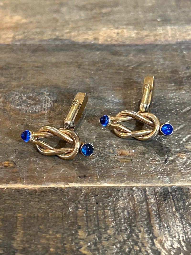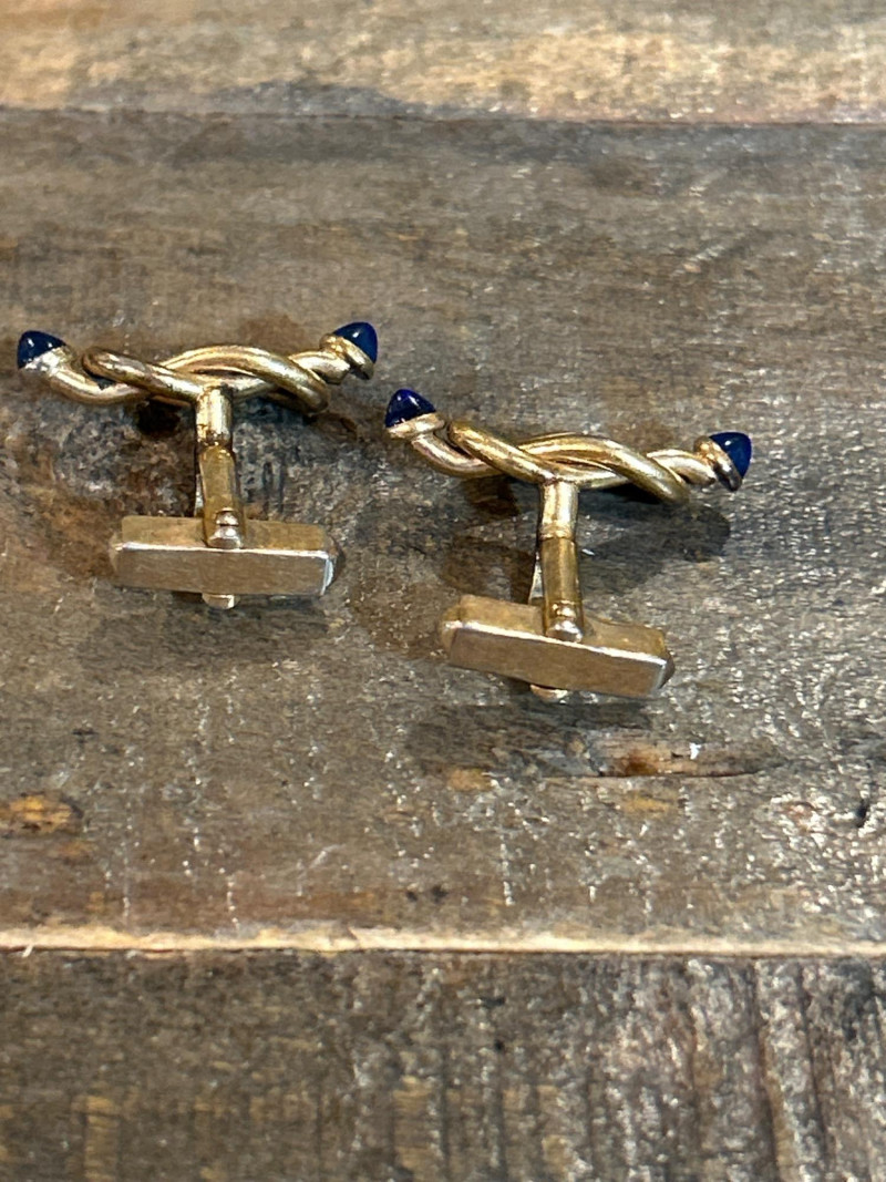 Natural shark tooth with partial 18kt gold plating; looped for wear. A bold marine-themed accessory. Approx. 1.25" L. Pair of Vintage Gold-Tone Cuff Links – Blue Cabochon & Rope Design