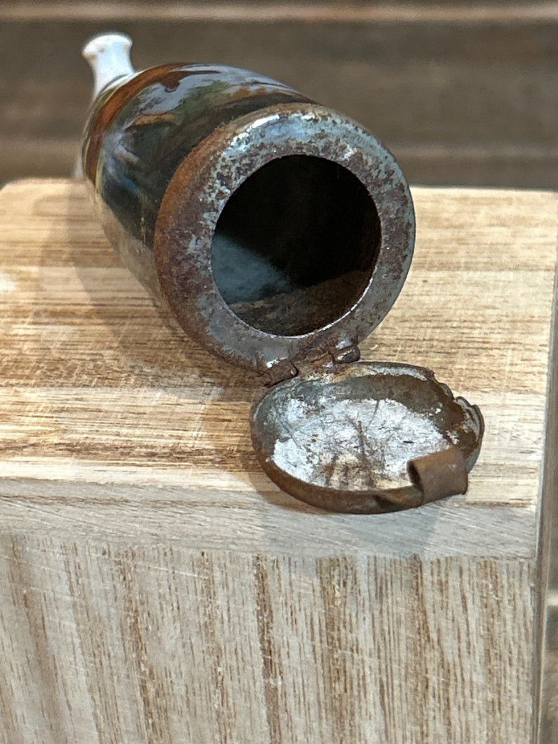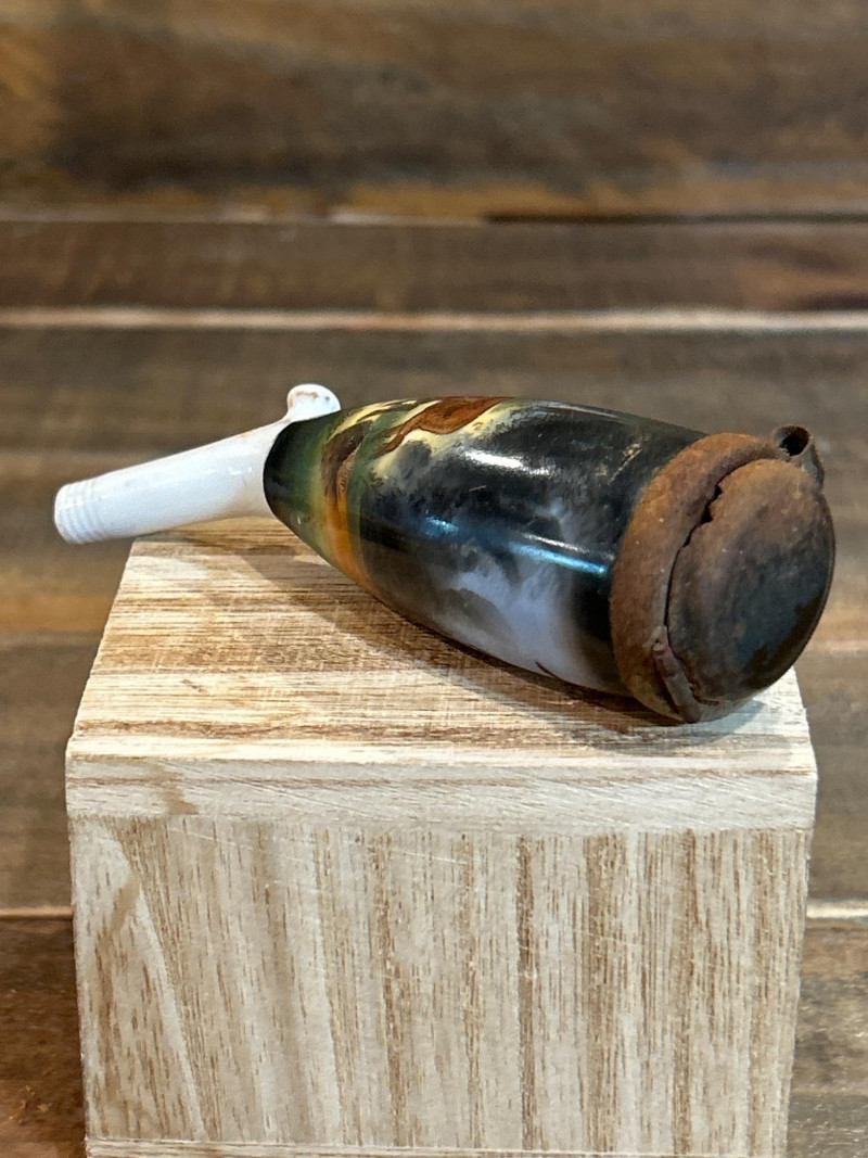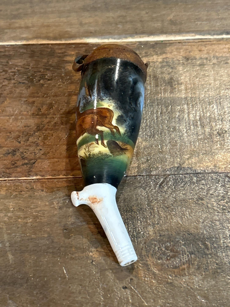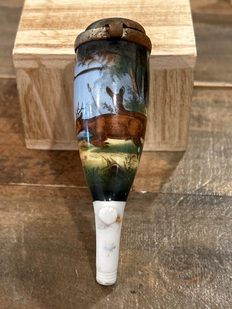 Made in England. Resin construction with removable lid. Underside marked with copyright and maker’s seal. Approx. 2.25" W. Antique German Porcelain Hunting Pipe