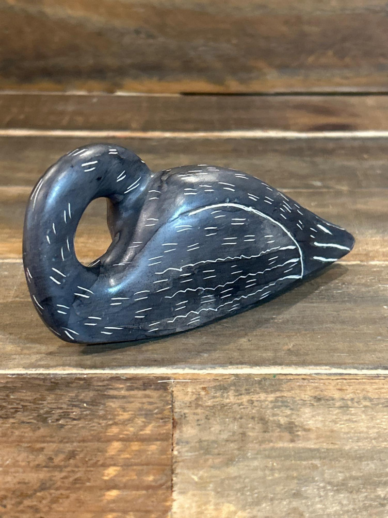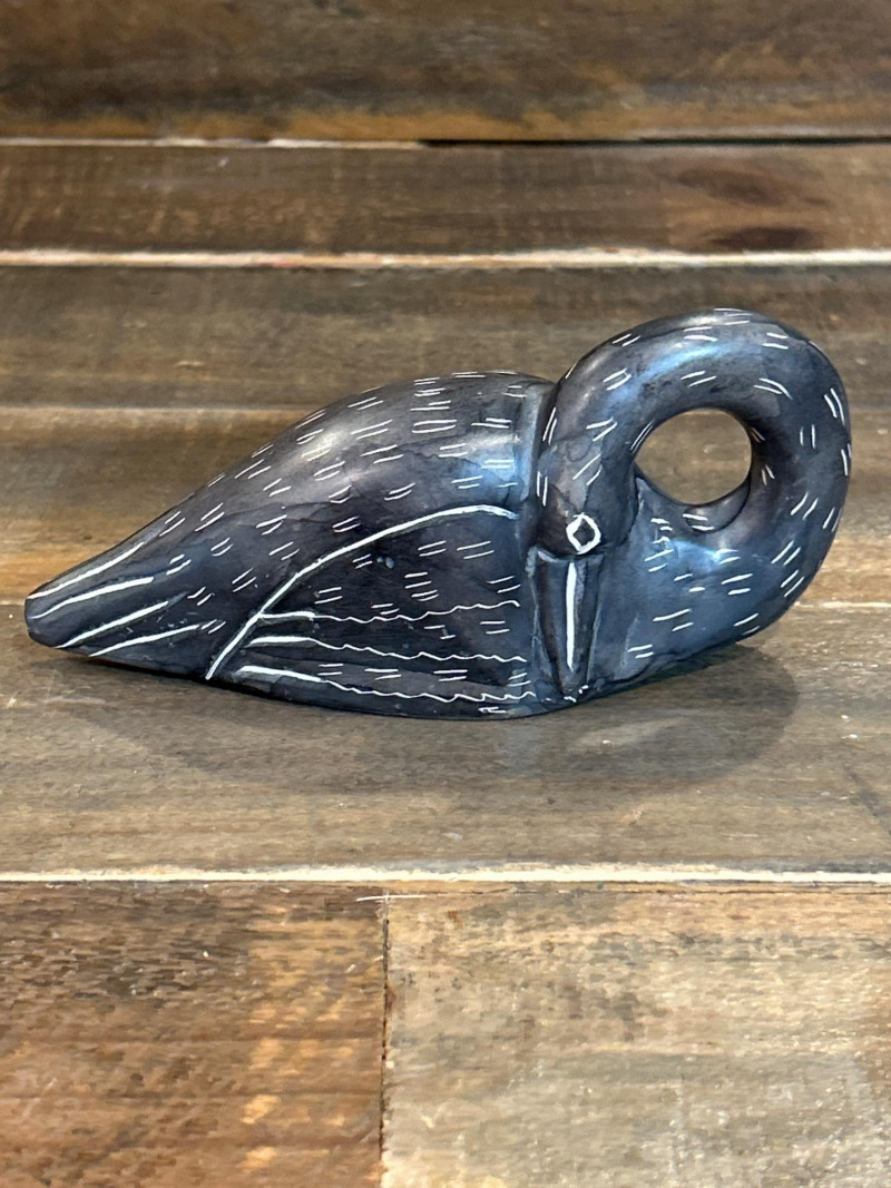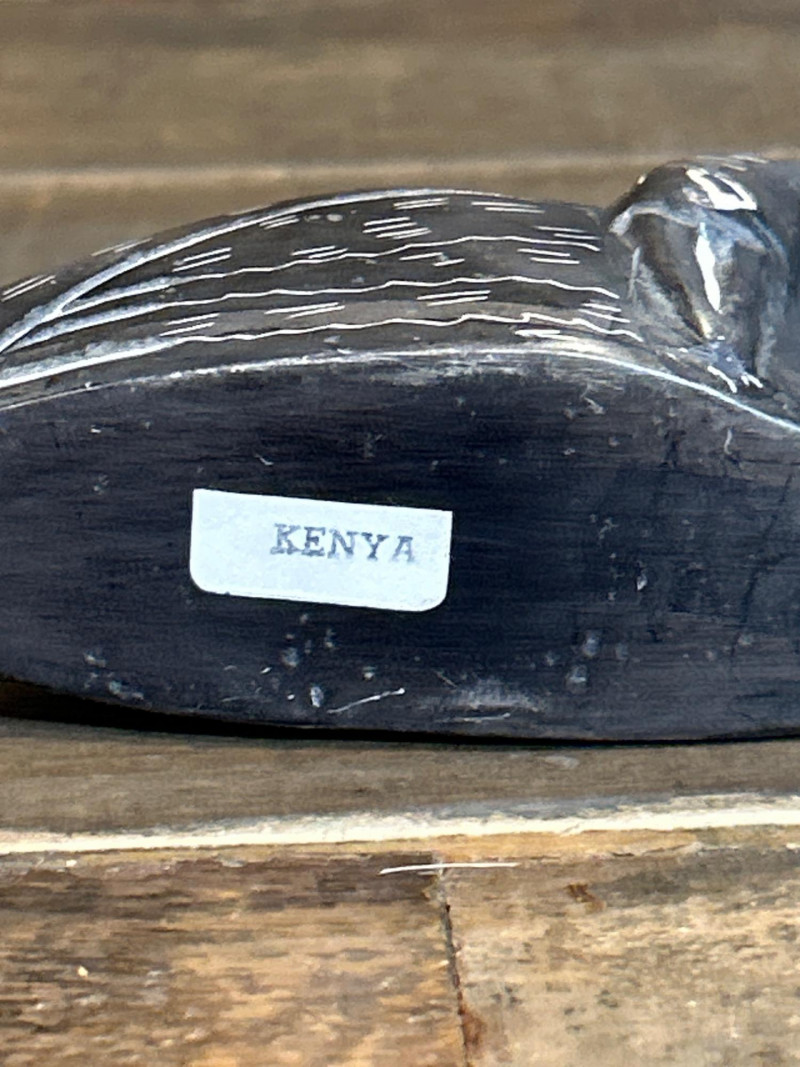 Stylized duck or swan in a resting pose with head tucked into body; circular form with etched feather detailing. Likely carved stone or wood. Underside marked “Kenya,” suggesting East African folk-art origin. Approx. 2.75" L.