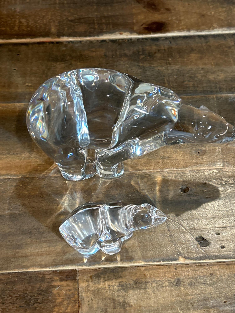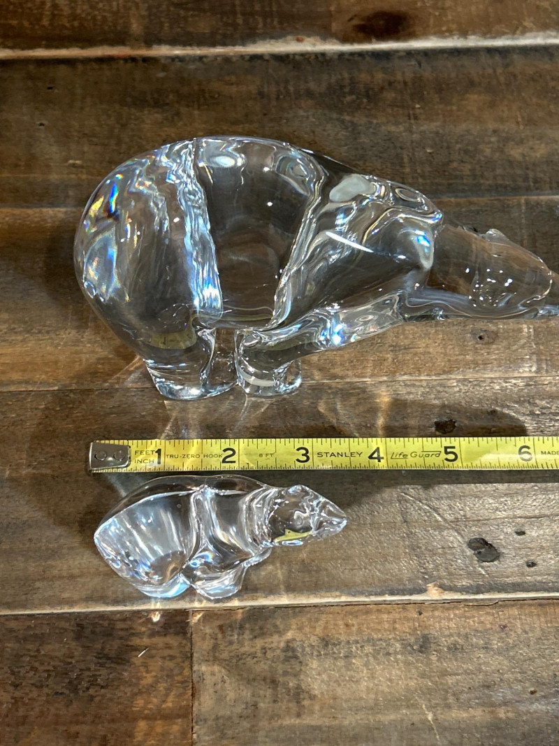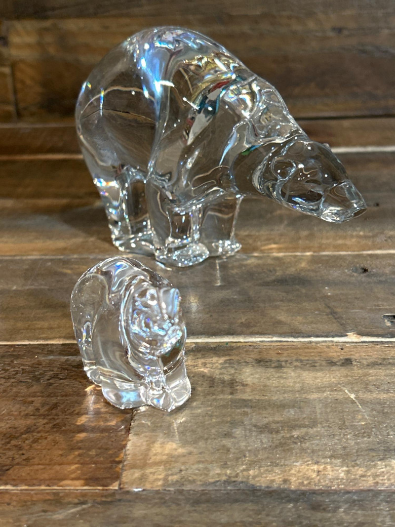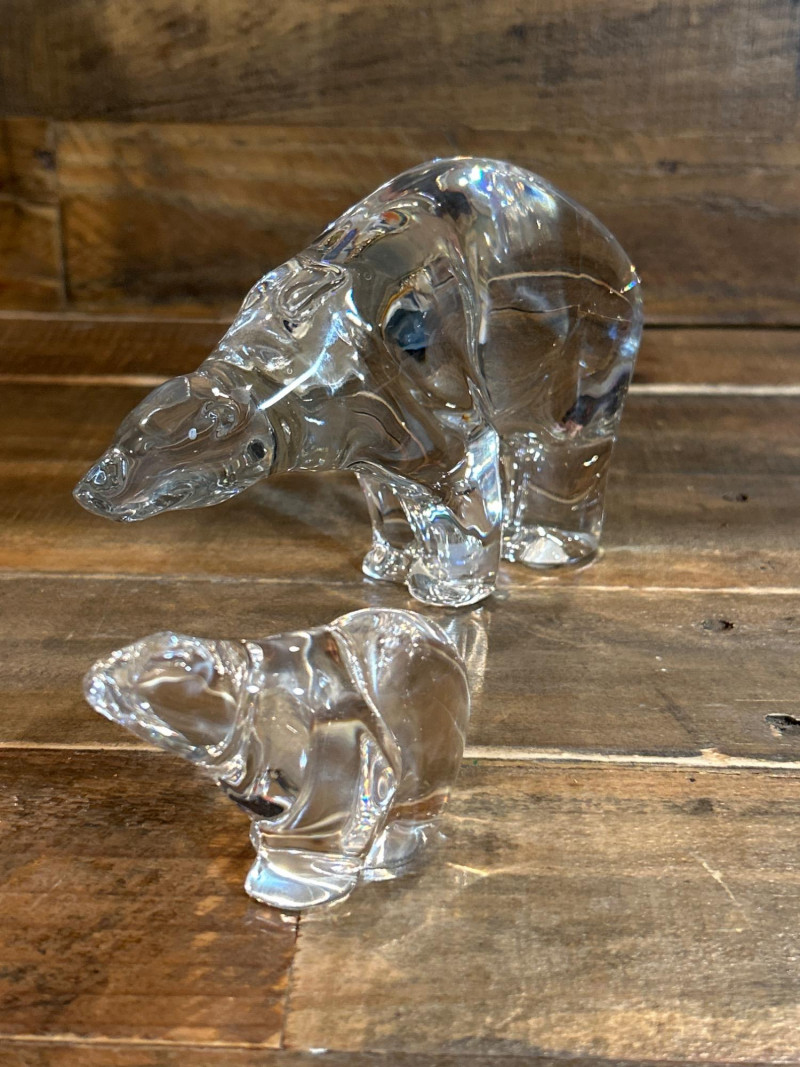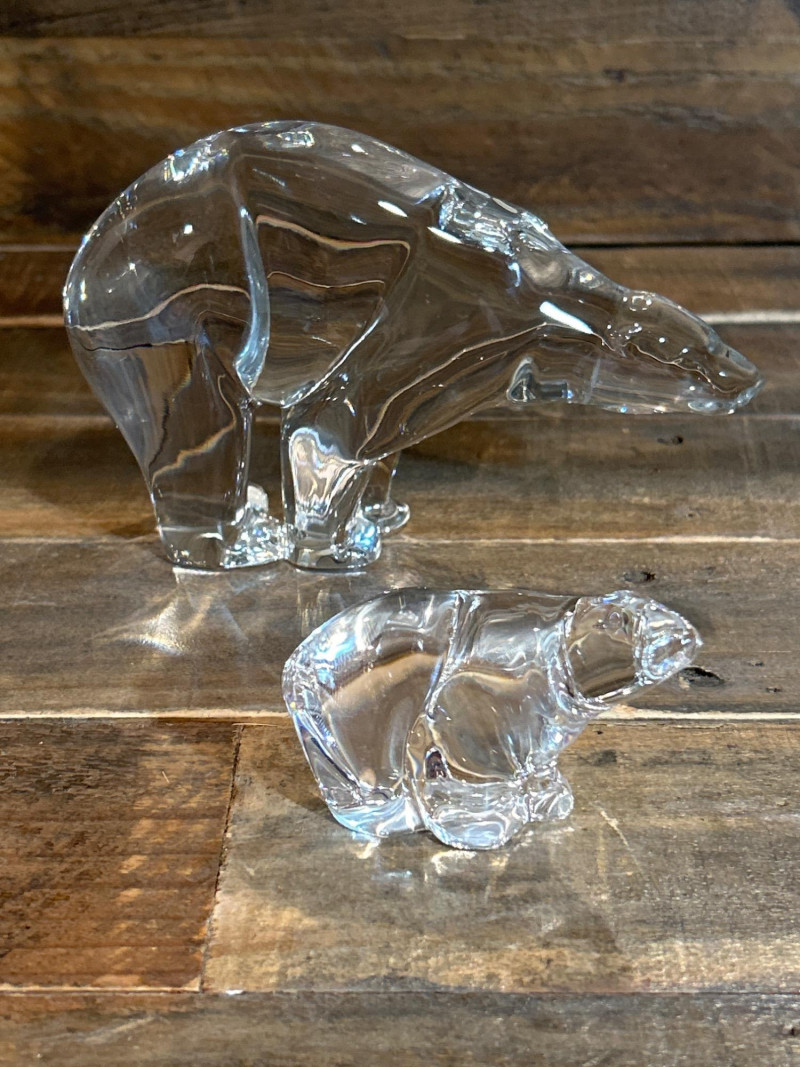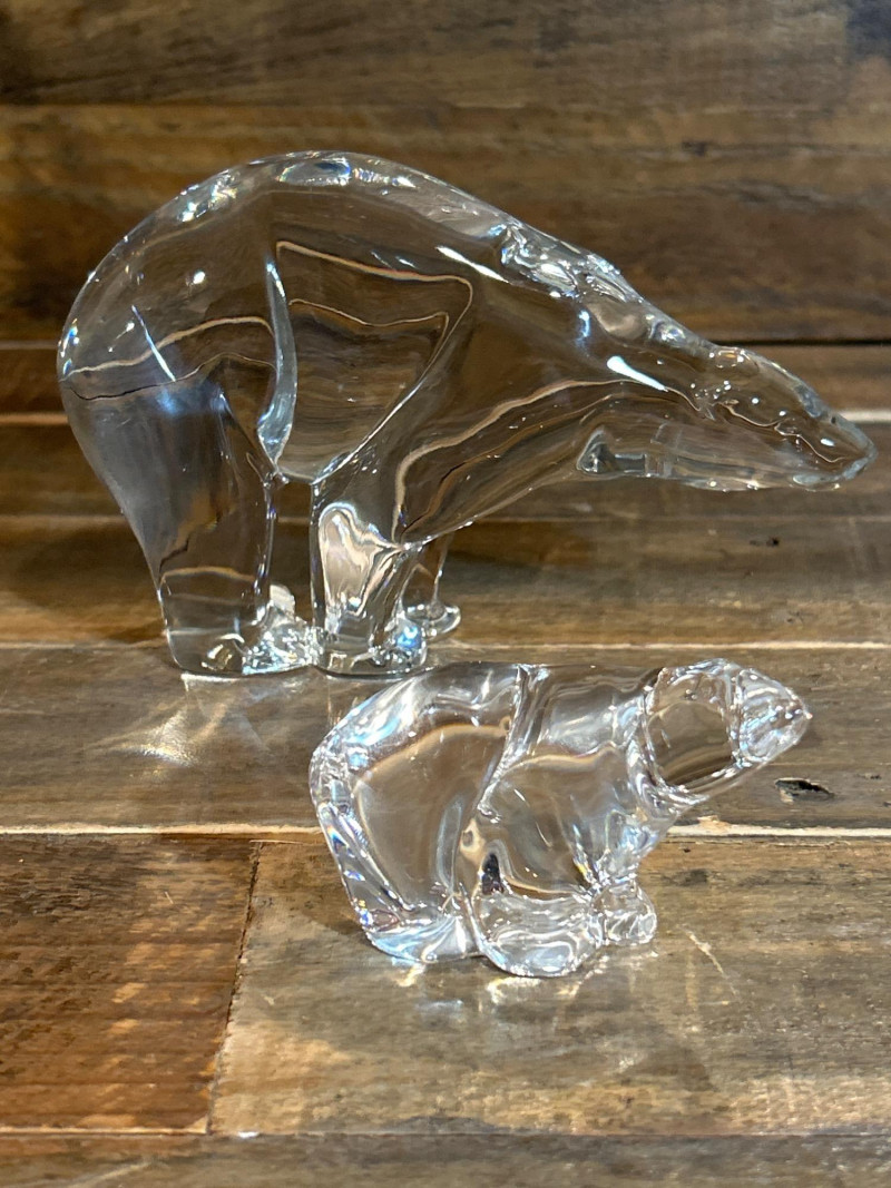 A – Baccarat Crystal France Polar Bear Figurine Dimensions: 4.75" tall × 6" long Material: Clear lead crystal Origin: Acid-etched “Baccarat France” hallmark on base Design: Elegant standing polar bear with stylized contours and a sense of motion. The form captures Baccarat’s signature brilliance and sculptural purity. Style Notes: A refined example of Baccarat’s animalier line—crystal clarity, weight, and light dispersion are all exceptional, showcasing the brand’s French artistry. B – Hadeland Norway Polar Bear Art Glass Figurine Dimensions: 2.75" tall × 4.25" long Material: Clear art crystal Origin: Etched “Hadeland” signature on underside Design: Seated polar bear form with gentle curvature and minimalist Scandinavian style. Smoothly rendered, emphasizing calm balance and light reflection. Style Notes: A charming counterpart to the Baccarat bear—its simplicity and rounded lines evoke classic Nordic modernism and quiet grace.