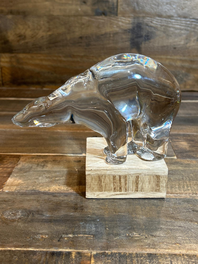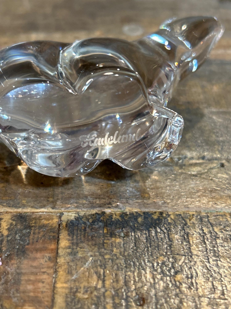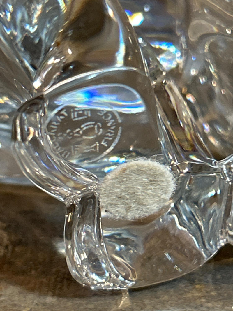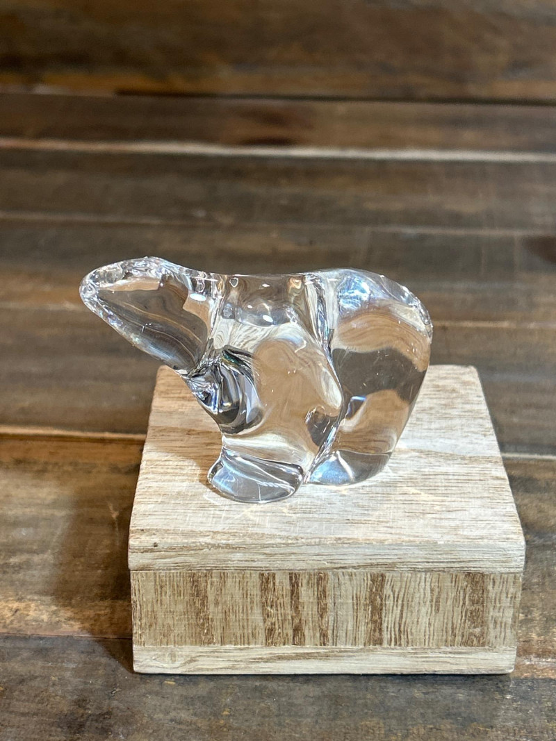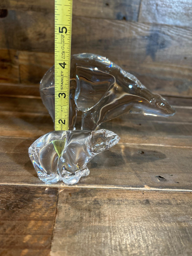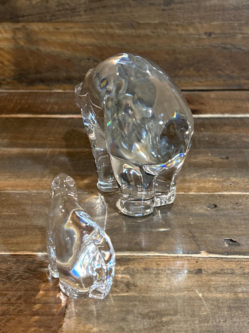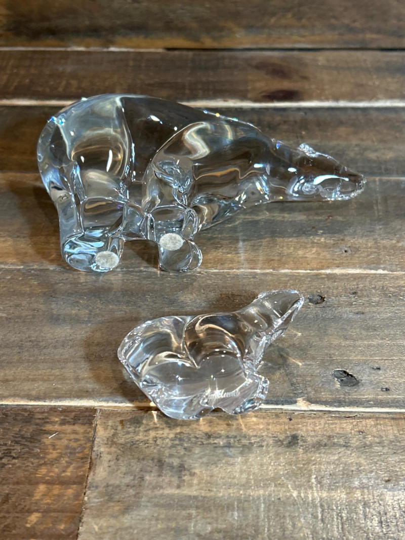 A – Baccarat Crystal France Polar Bear Figurine Dimensions: 4.75" tall × 6" long Material: Clear lead crystal Origin: Acid-etched “Baccarat France” hallmark on base Design: Elegant standing polar bear with stylized contours and a sense of motion. The form captures Baccarat’s signature brilliance and sculptural purity. Style Notes: A refined example of Baccarat’s animalier line—crystal clarity, weight, and light dispersion are all exceptional, showcasing the brand’s French artistry. B – Hadeland Norway Polar Bear Art Glass Figurine Dimensions: 2.75" tall × 4.25" long Material: Clear art crystal Origin: Etched “Hadeland” signature on underside Design: Seated polar bear form with gentle curvature and minimalist Scandinavian style. Smoothly rendered, emphasizing calm balance and light reflection. Style Notes: A charming counterpart to the Baccarat bear—its simplicity and rounded lines evoke classic Nordic modernism and quiet grace.