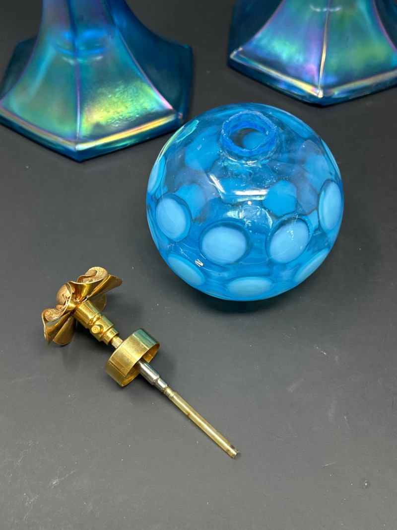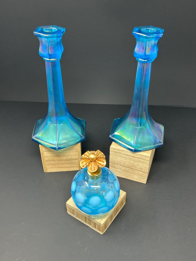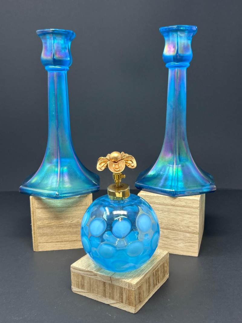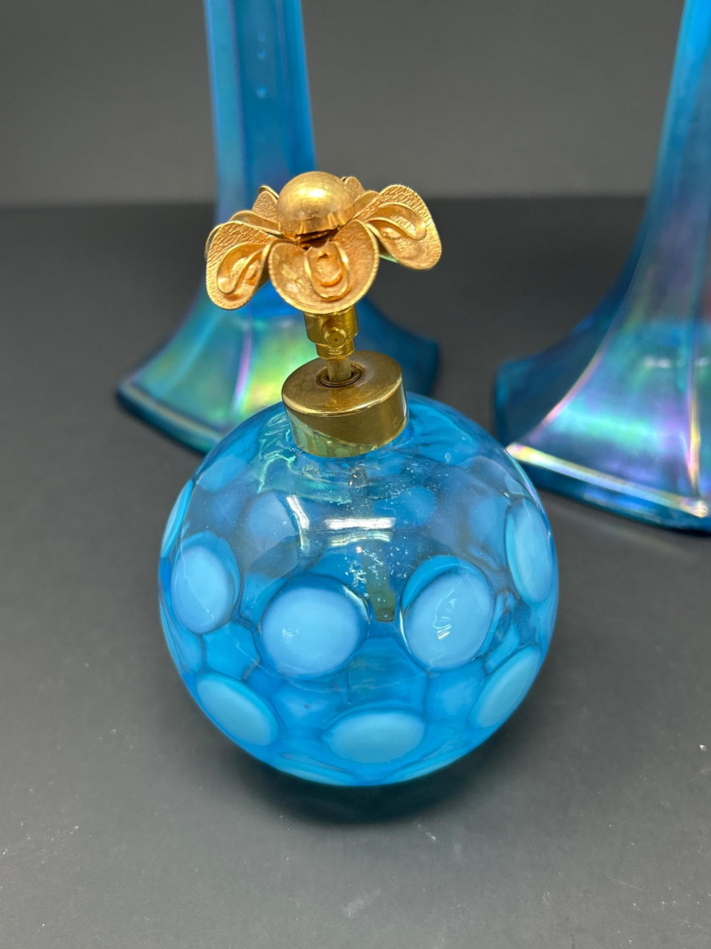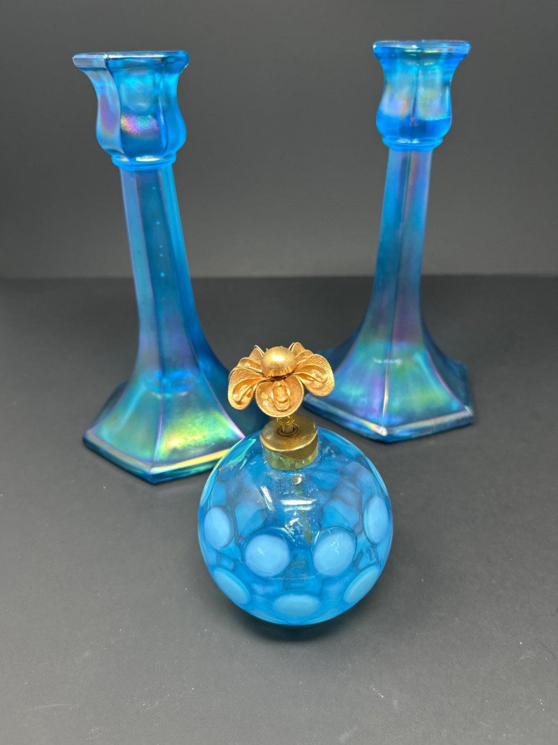 Candlestick Holders – Iridescent Blue Stretch Glass Dimensions: Approx. 8.5" tall Color: Deep iridescent blue with multicolor shimmer Design: Hexagonal base with flared top and slender neck Finish: Satin-like stretch glass surface with subtle striations Condition: One holder has a small chip on the underside of the base Style Notes: Likely American stretch glass, circa 1920s–1930s. Elegant symmetry and soft luster make these ideal for vintage table settings or vanity décor. Perfume Atomizer – Coin Dot Cased Glass Dimensions: Approx. 5" tall x 3" diameter Color: Powder blue with opalescent white coin dot pattern Design: Rounded body with raised circular motifs, topped with a gold-tone floral atomizer Glass Type: Cased glass with layered color and texture Style Notes: Attributed to Fenton for DeVilbiss, circa 1940s–1950s. A charming mid-century vanity piece with collectible appeal.