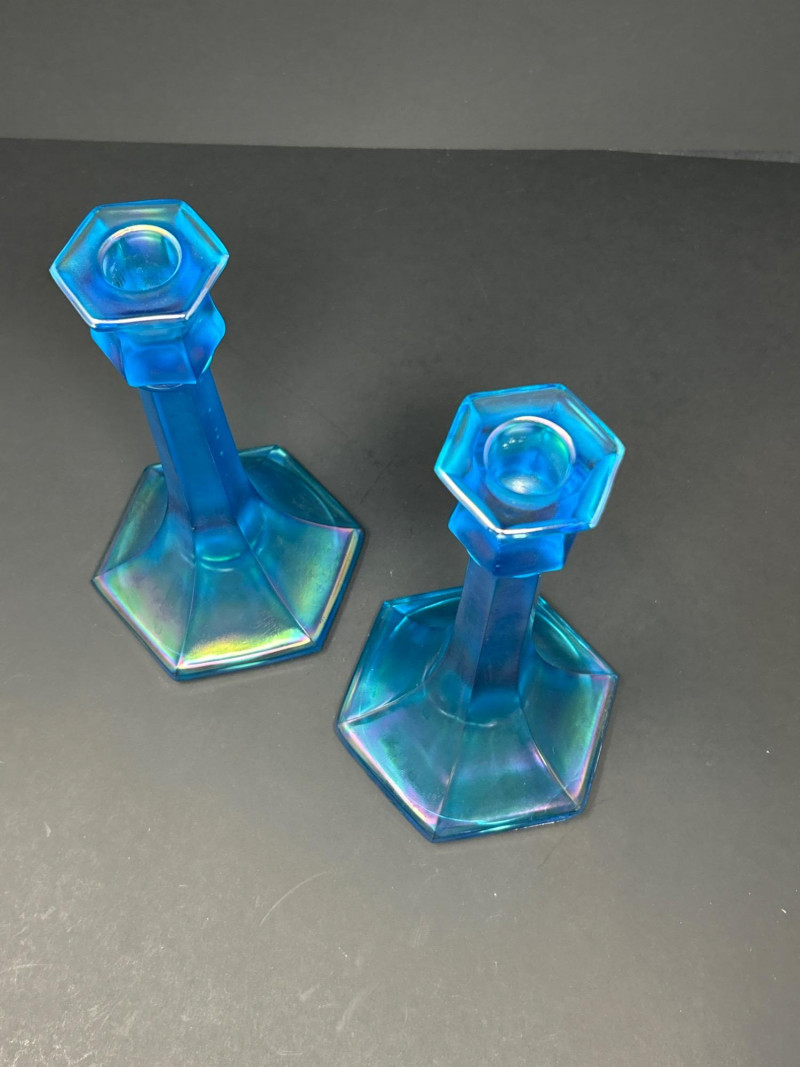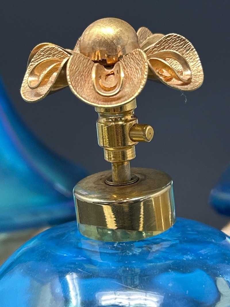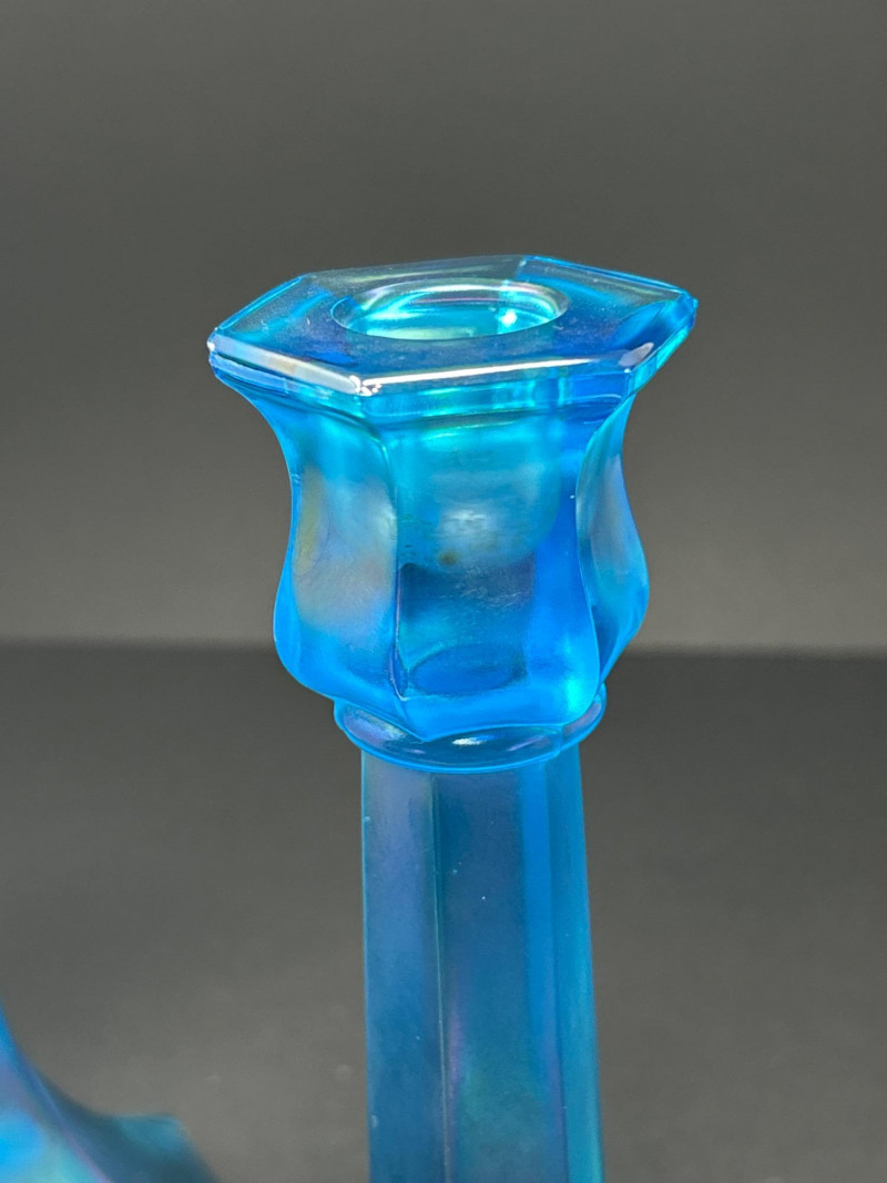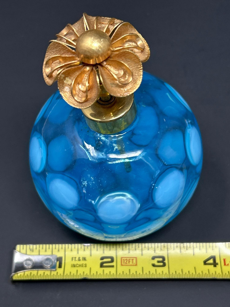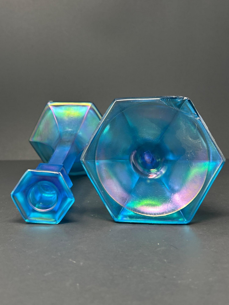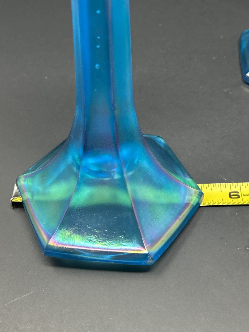 Candlestick Holders – Iridescent Blue Stretch Glass Dimensions: Approx. 8.5" tall Color: Deep iridescent blue with multicolor shimmer Design: Hexagonal base with flared top and slender neck Finish: Satin-like stretch glass surface with subtle striations Condition: One holder has a small chip on the underside of the base Style Notes: Likely American stretch glass, circa 1920s–1930s. Elegant symmetry and soft luster make these ideal for vintage table settings or vanity décor. Perfume Atomizer – Coin Dot Cased Glass Dimensions: Approx. 5" tall x 3" diameter Color: Powder blue with opalescent white coin dot pattern Design: Rounded body with raised circular motifs, topped with a gold-tone floral atomizer Glass Type: Cased glass with layered color and texture Style Notes: Attributed to Fenton for DeVilbiss, circa 1940s–1950s. A charming mid-century vanity piece with collectible appeal.