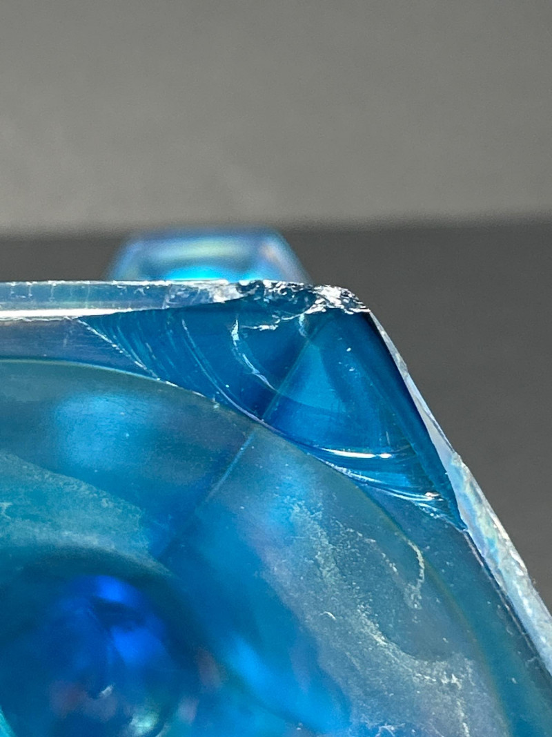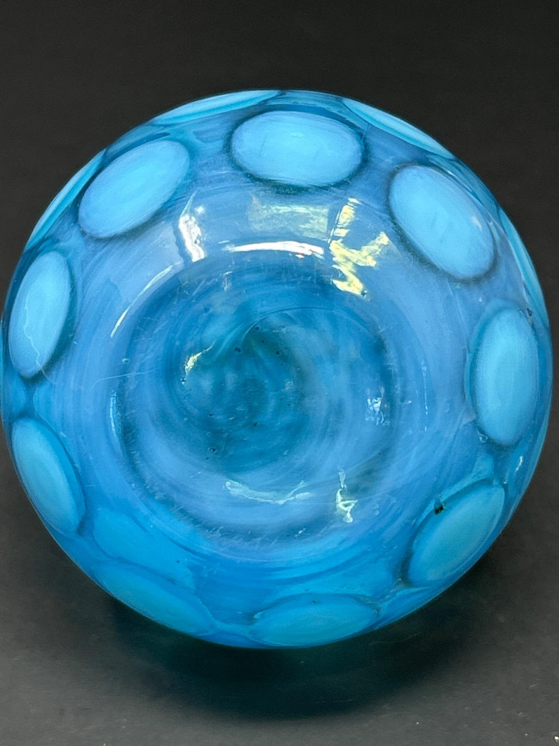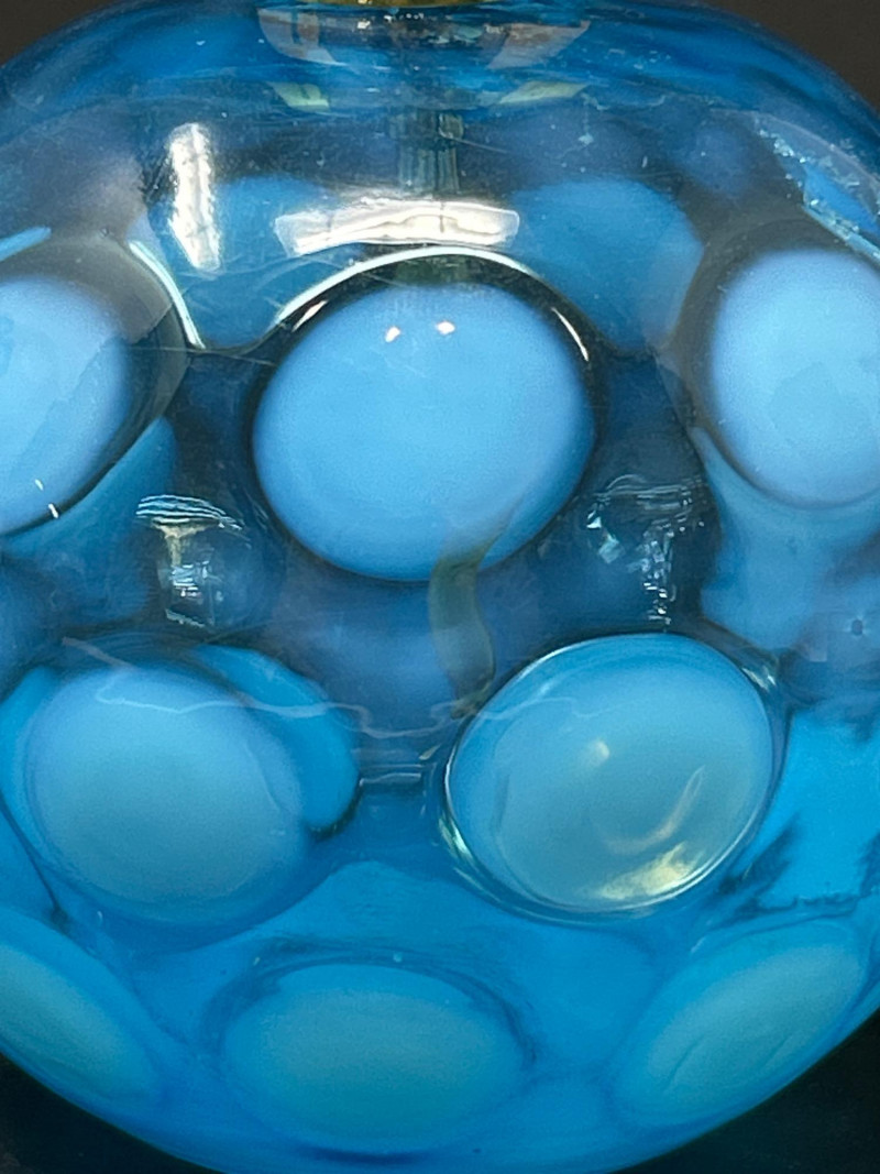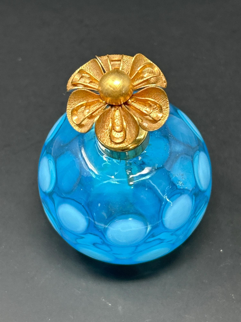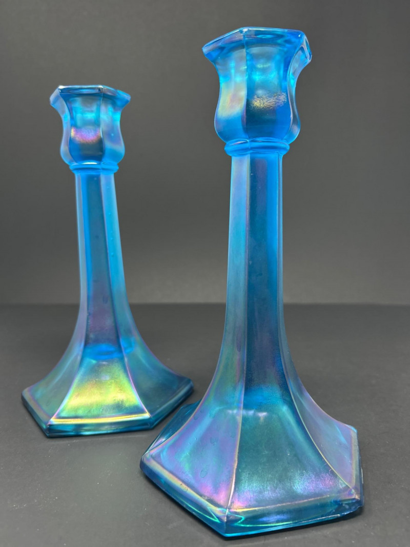 Candlestick Holders – Iridescent Blue Stretch Glass Dimensions: Approx. 8.5" tall Color: Deep iridescent blue with multicolor shimmer Design: Hexagonal base with flared top and slender neck Finish: Satin-like stretch glass surface with subtle striations Condition: One holder has a small chip on the underside of the base Style Notes: Likely American stretch glass, circa 1920s–1930s. Elegant symmetry and soft luster make these ideal for vintage table settings or vanity décor. Perfume Atomizer – Coin Dot Cased Glass Dimensions: Approx. 5" tall x 3" diameter Color: Powder blue with opalescent white coin dot pattern Design: Rounded body with raised circular motifs, topped with a gold-tone floral atomizer Glass Type: Cased glass with layered color and texture Style Notes: Attributed to Fenton for DeVilbiss, circa 1940s–1950s. A charming mid-century vanity piece with collectible appeal.