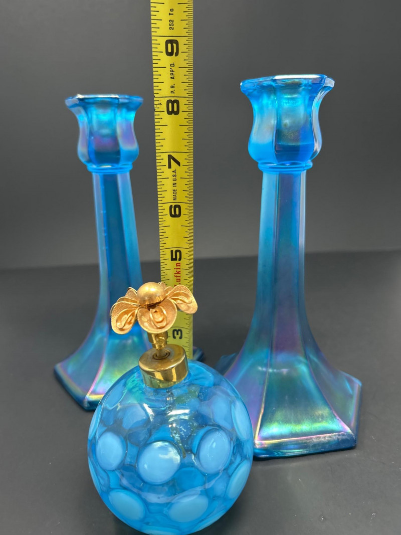 Lot # 81 - Blue Stretch Glass Candlesticks & Coin Dot Perfume Atomizer