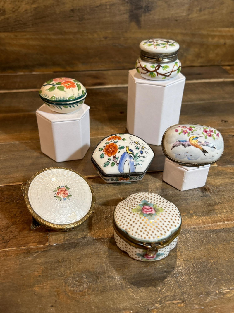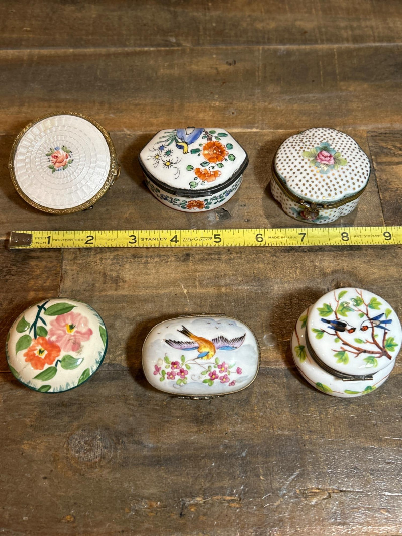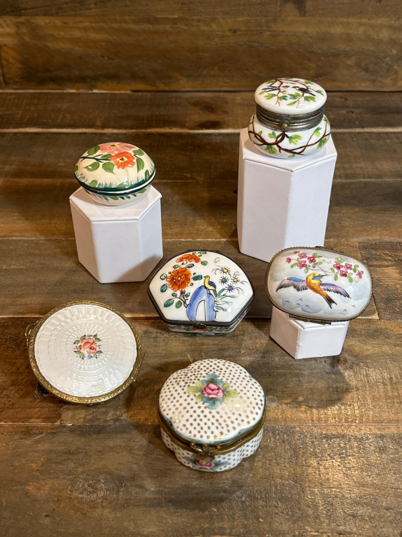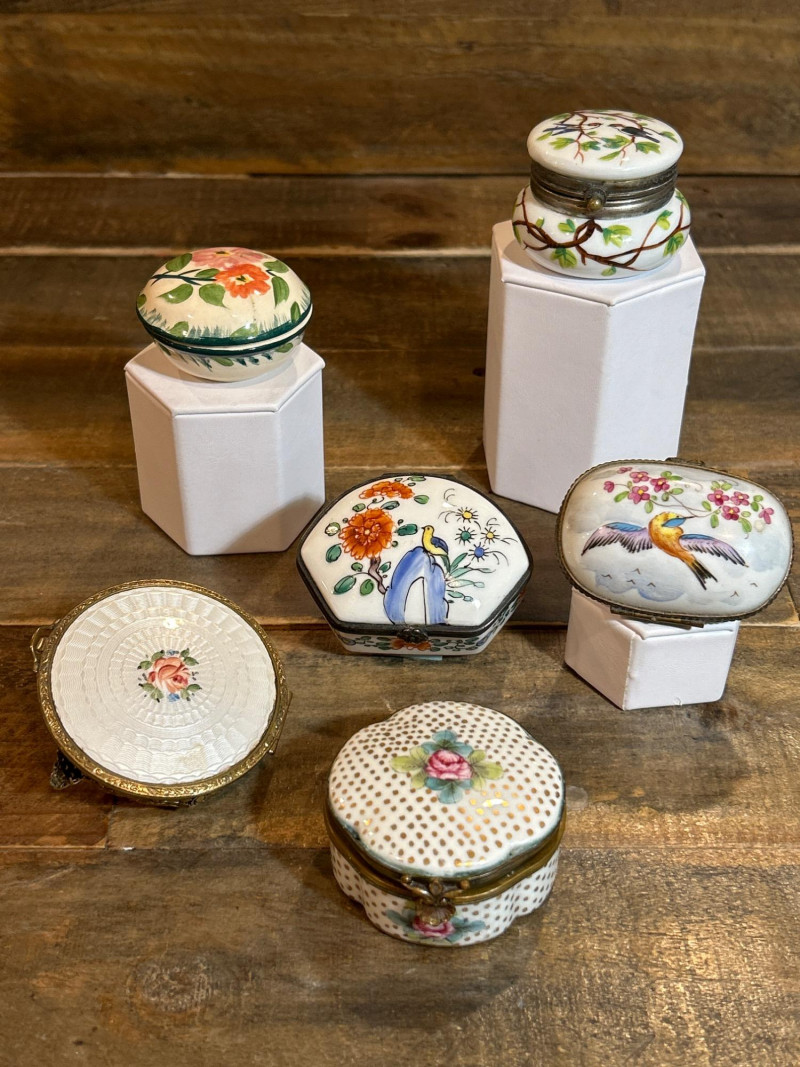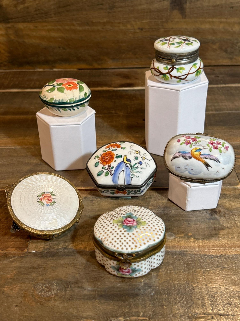A beautiful, assorted collection of six hand-painted porcelain and enamel trinket or patch boxes, each uniquely decorated with floral and bird designs and fitted with gilt or brass metal mounts. The group represents a range of mid-20th-century European and boutique studio craftsmanship, from Limoges-inspired florals to guilloché enamel artistry.