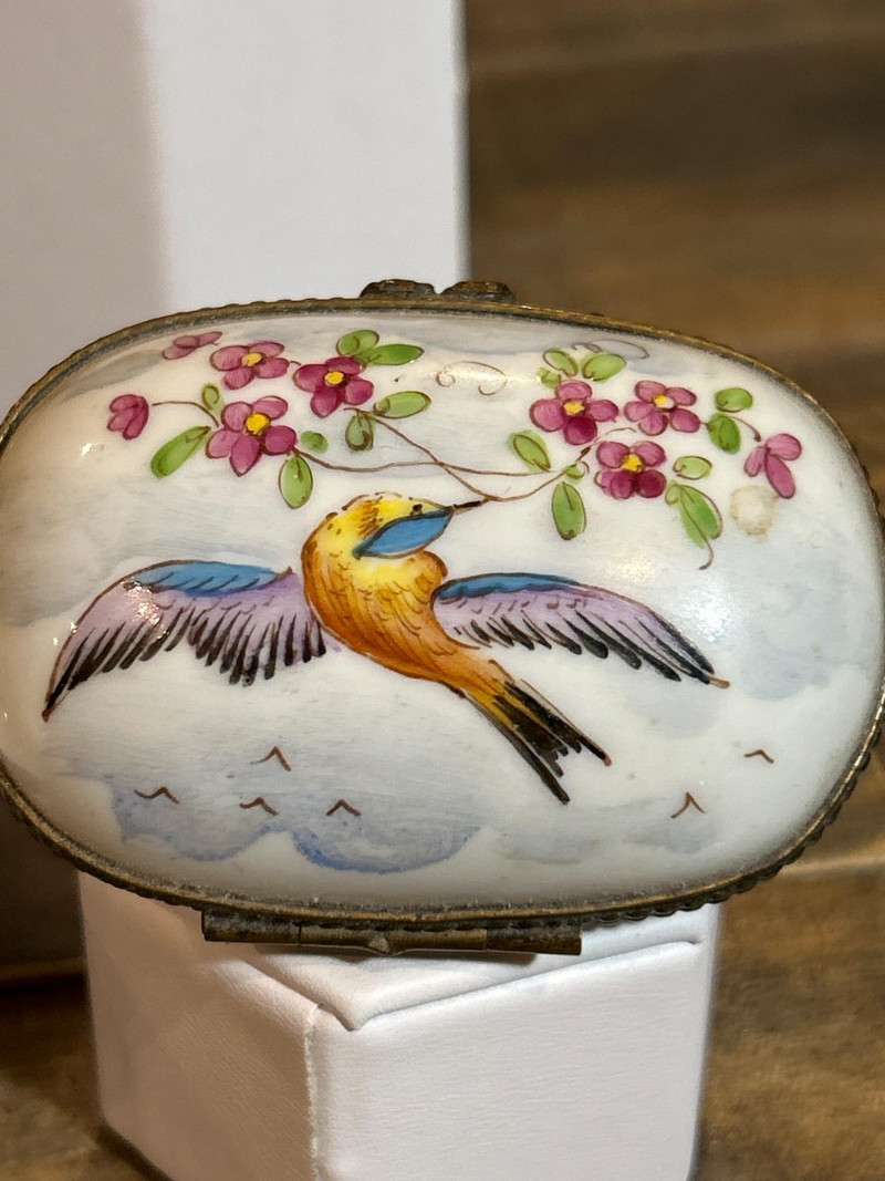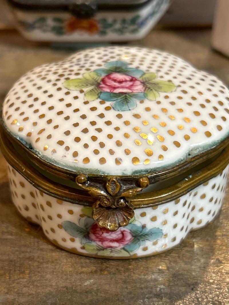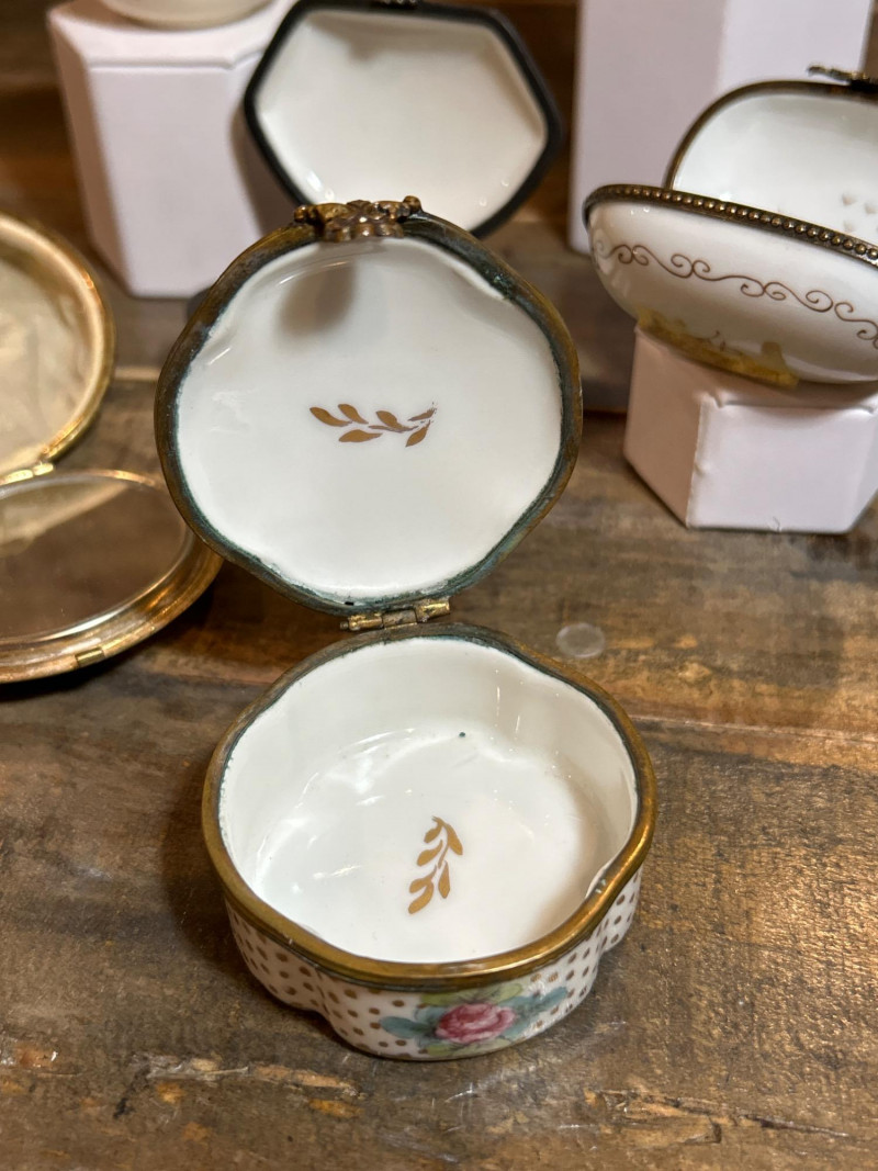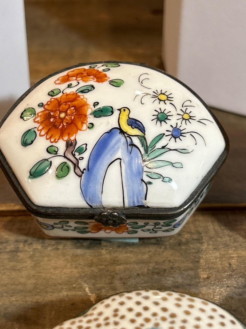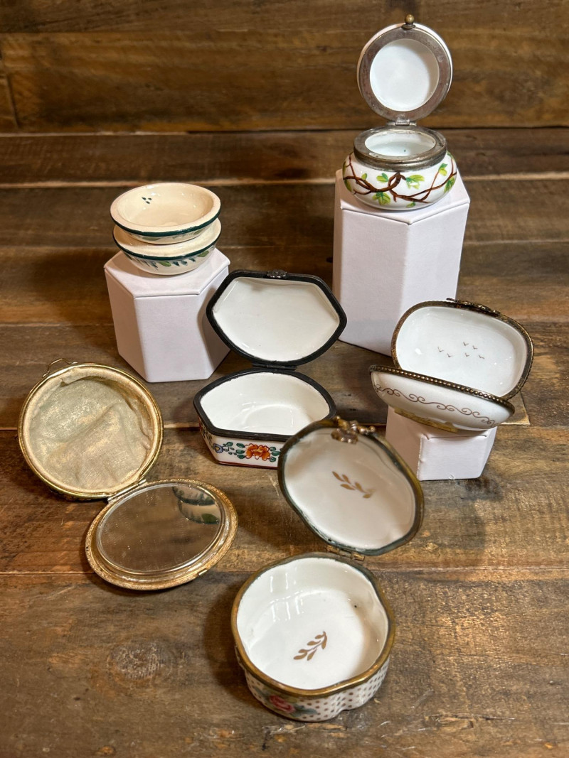 A beautiful, assorted collection of six hand-painted porcelain and enamel trinket or patch boxes, each uniquely decorated with floral and bird designs and fitted with gilt or brass metal mounts. The group represents a range of mid-20th-century European and boutique studio craftsmanship, from Limoges-inspired florals to guilloché enamel artistry.