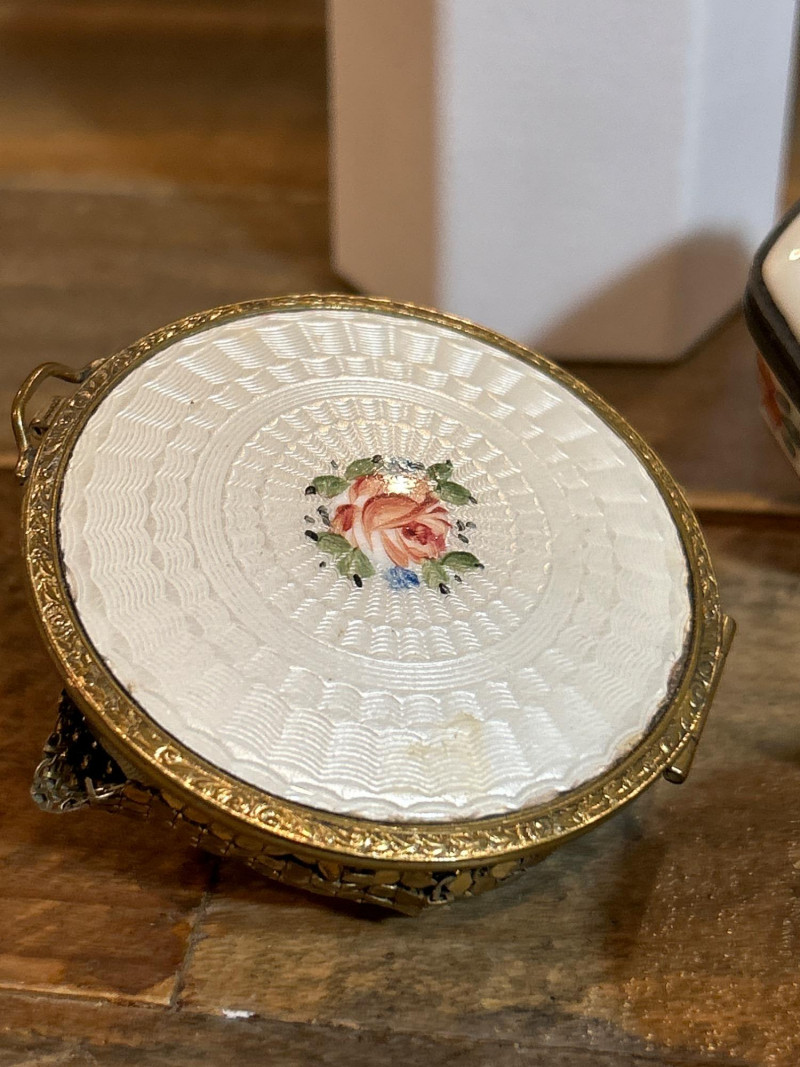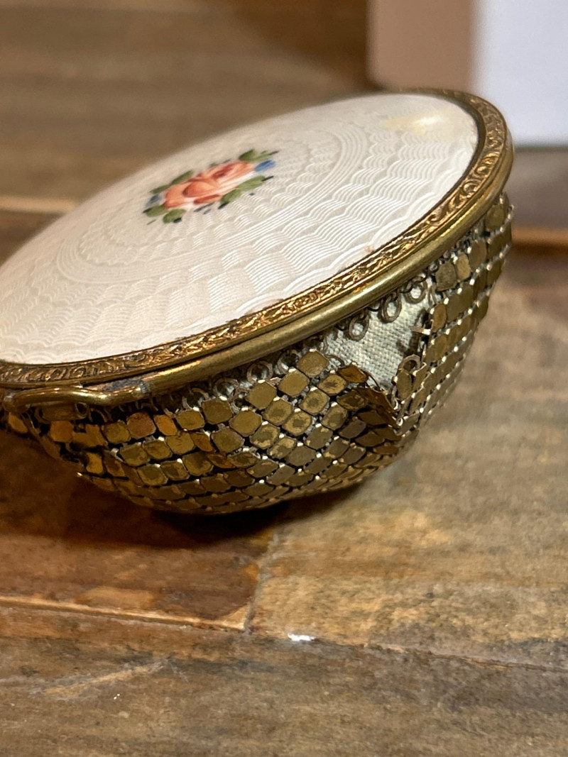 Together, these boxes form a charming ensemble — ideal for vanity display, collector showcases, or gifting — each with its own distinctive motif and color palette. Set Includes: Guilloché Enamel & Gold Mesh Compact (c.1940s)