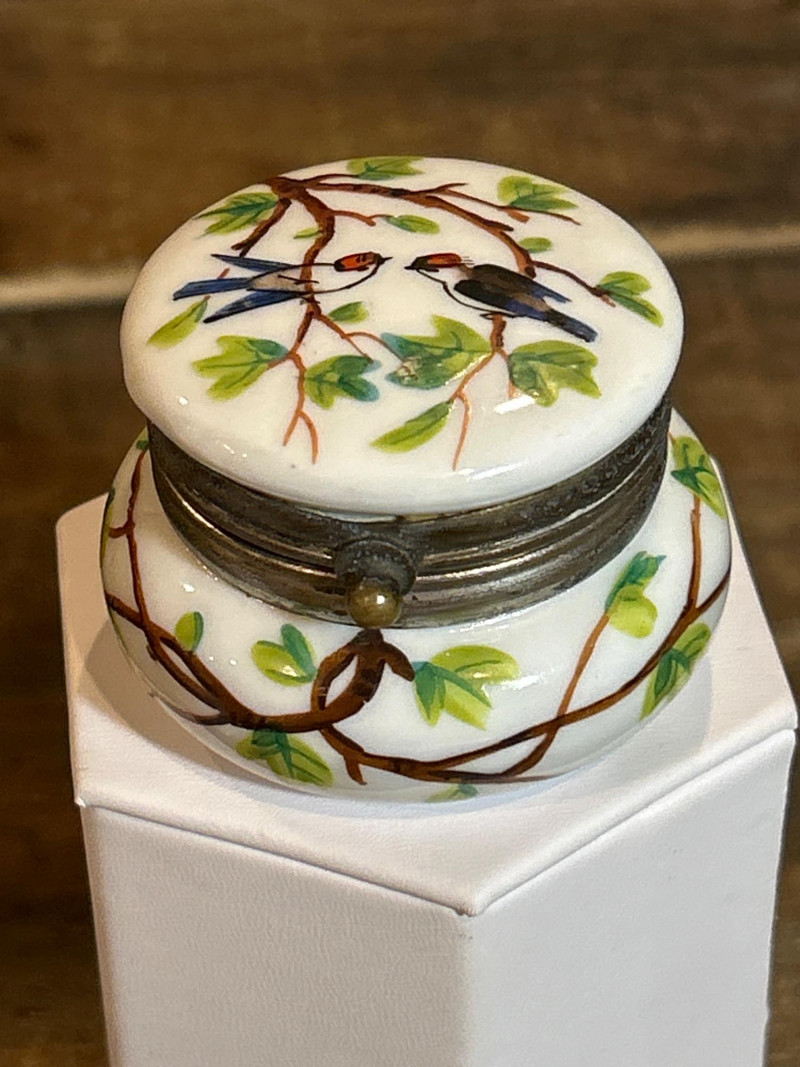 Charming small porcelain box hand-painted with two bluebirds perched on leafy branches, framed by trailing vines that continue around the lid and sides. Features a gilt-edged brass mount and clasp, clean interior and fine detailing.