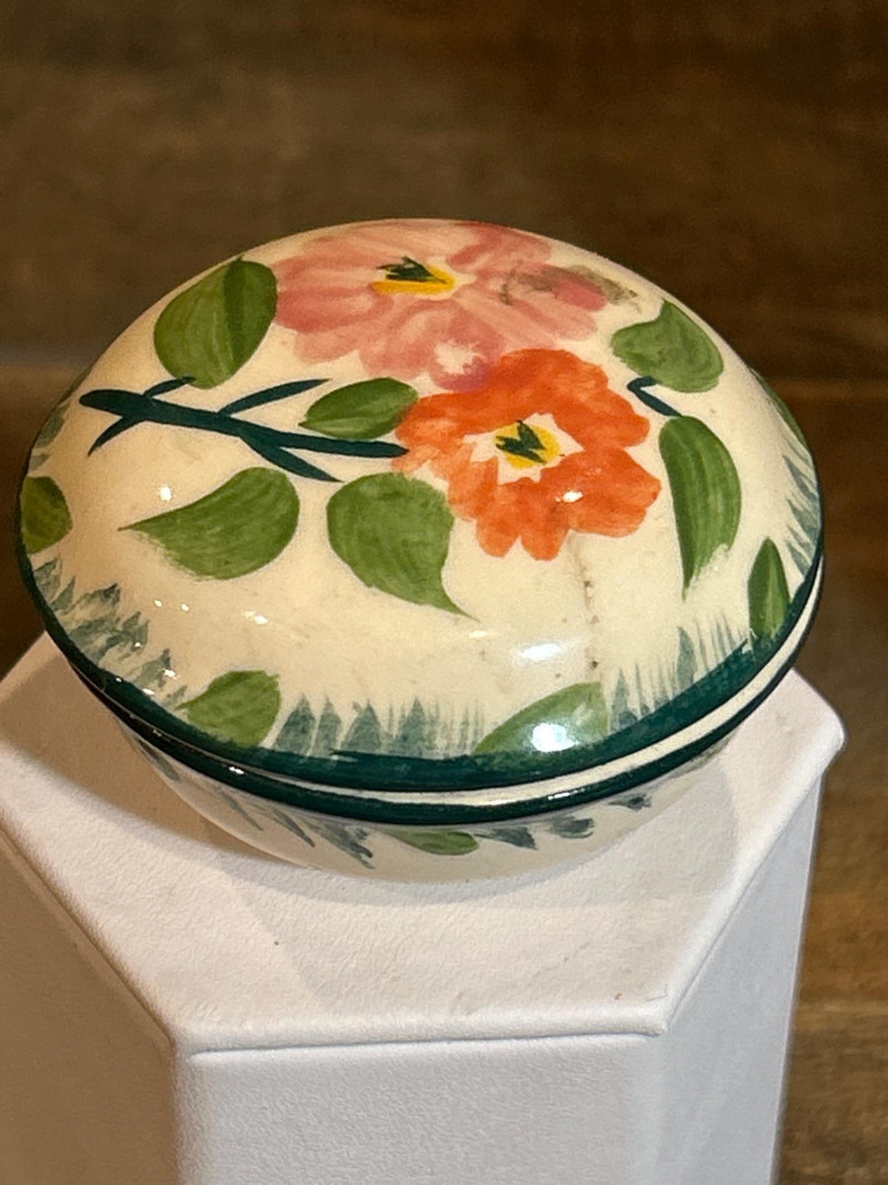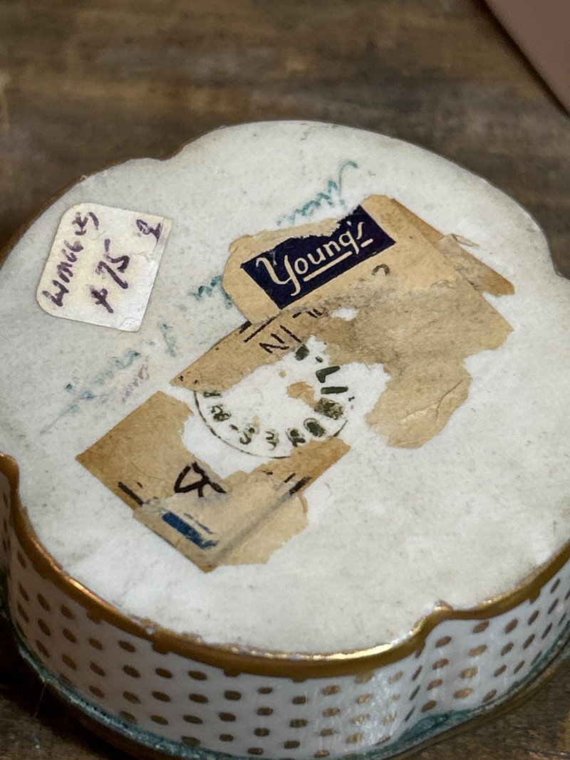 Dimensions: 2.75" diameter × 1.25" high “Young’s” Boutique Porcelain Box with Gilt Dot & Rose Pattern