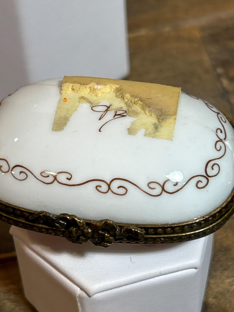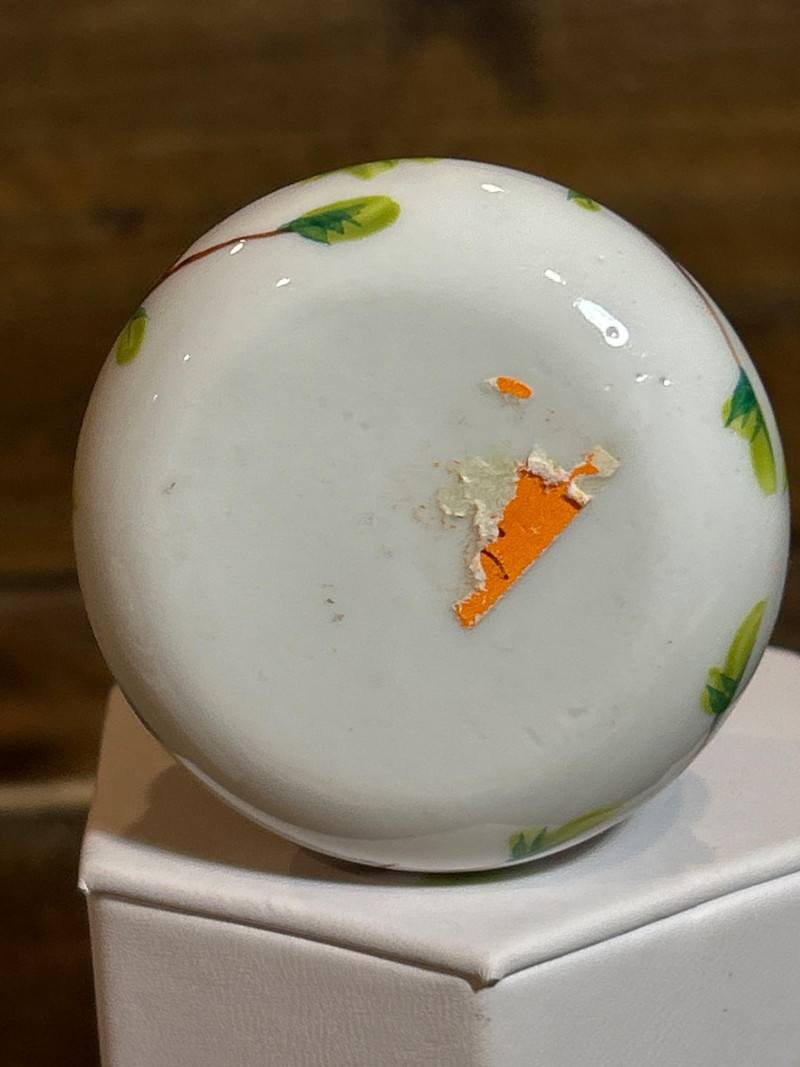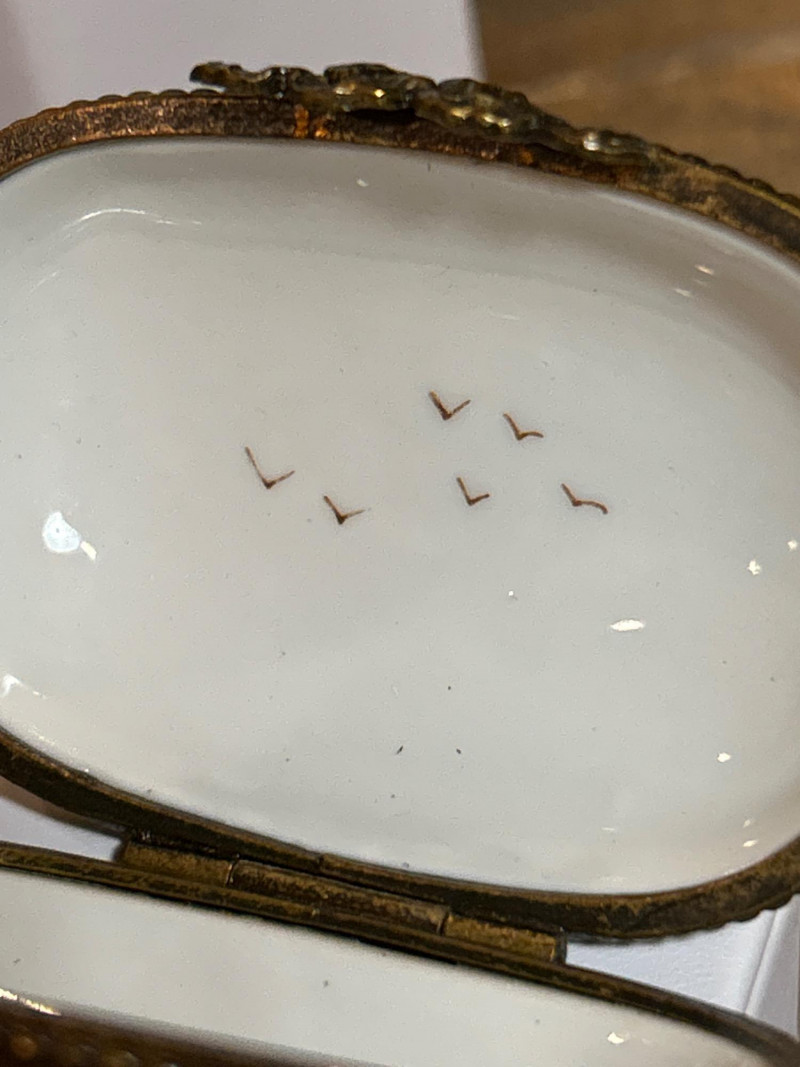 Scalloped round porcelain box hand-painted with pink roses and a lattice of gilded dots. Fitted with a brass butterfly clasp and marked with an original “Young’s” label and vintage pricing tags on the base. Dimensions: 2.25" diameter × 1.75" high Hexagonal Bird & Chrysanthemum Porcelain Box – Numbered “125”