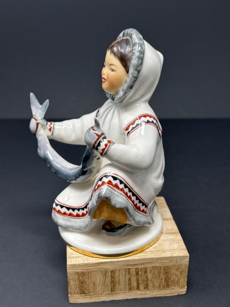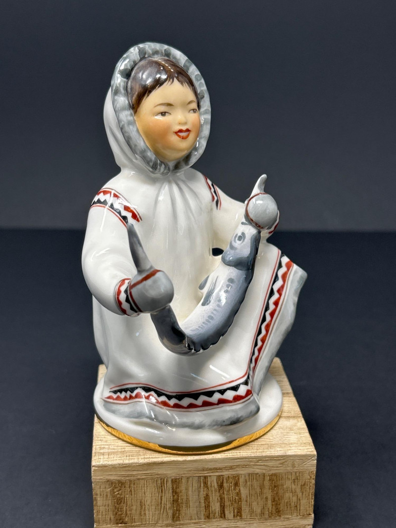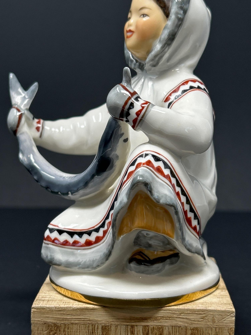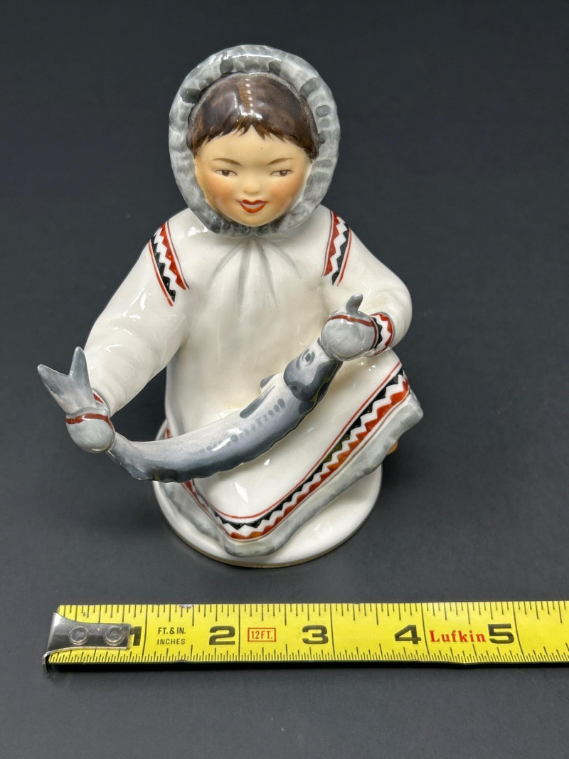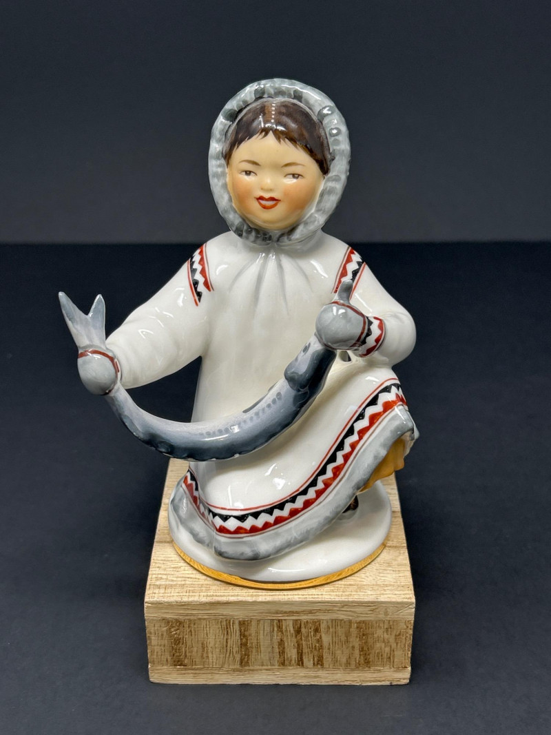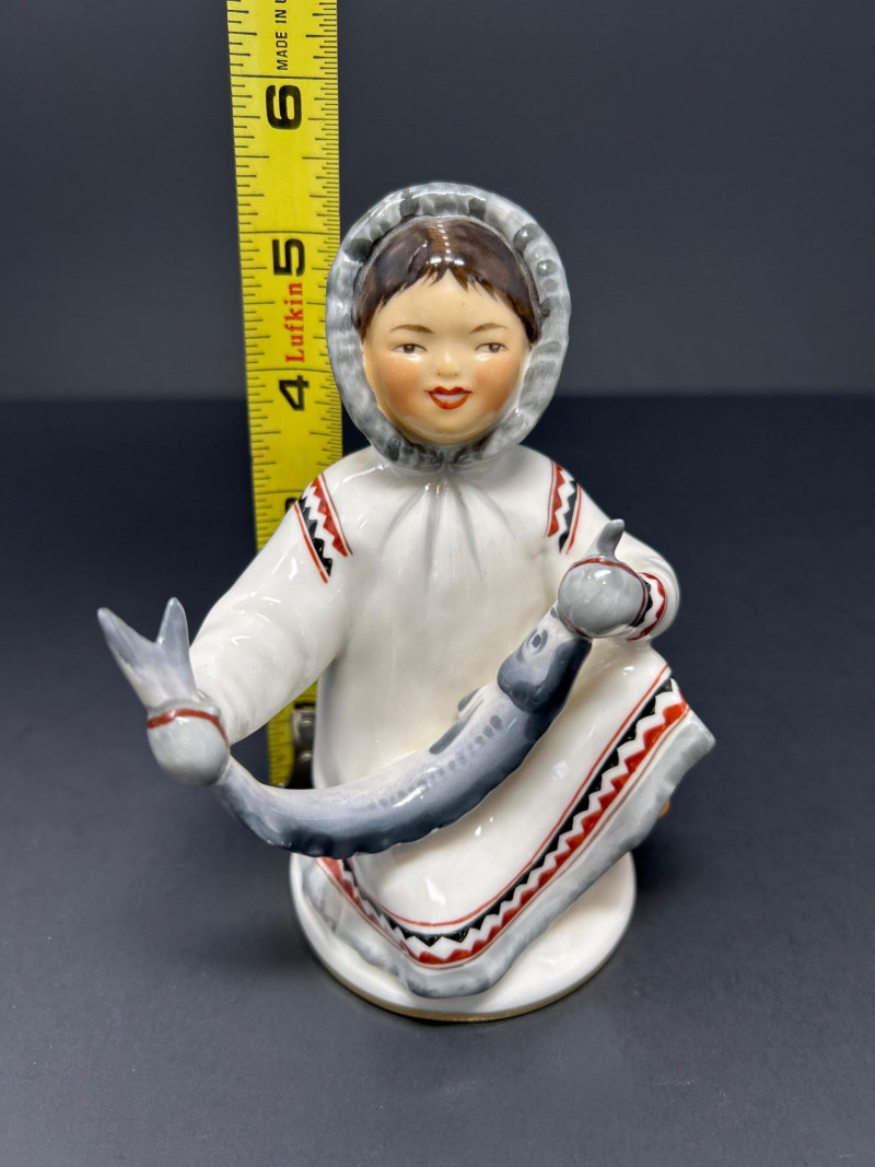 A rare mid-century porcelain figurine crafted by the Lomonosov Porcelain Factory (ЛФЗ), Saint Petersburg, USSR, depicting a seated Yakut (Sakha) girl in traditional winter attire, holding a fish—symbolizing subsistence and cultural heritage. Origin: Stamped “ЛФЗ” and “MADE IN USSR” on base; authentic Soviet-era production. Date: Circa 1950s. Material: Glazed porcelain with hand-painted polychrome accents. Design Details: White hooded parka with red and black geometric trim. Fur-textured hood lining and serene facial expression. Fish rendered in blue-gray tones, held in both hands. Mounted on a circular base; some variants include a wooden plinth. Dimensions: Approx. 5 inches (12.7 cm) tall. Provenance: Estate collection; matches known LFZ catalog examples. Collector Appeal: