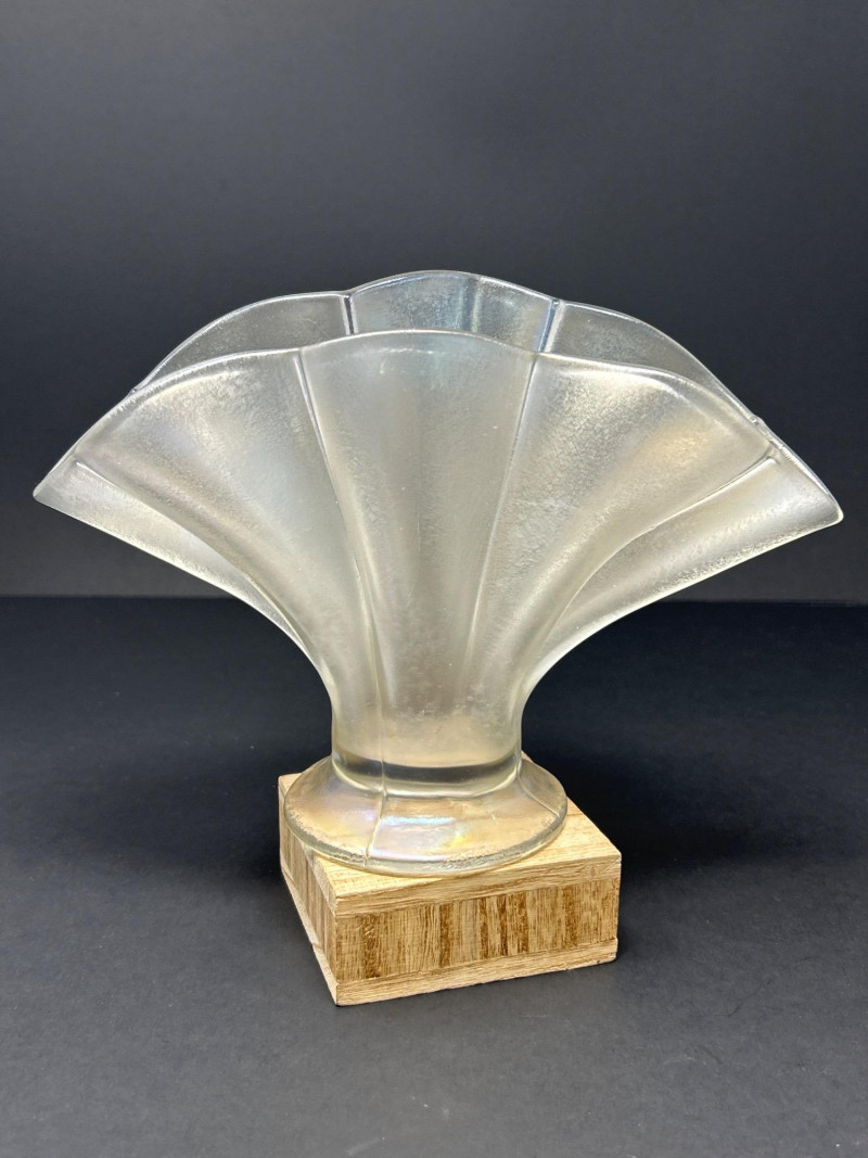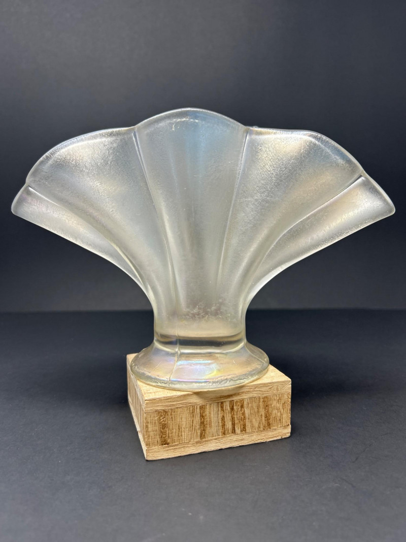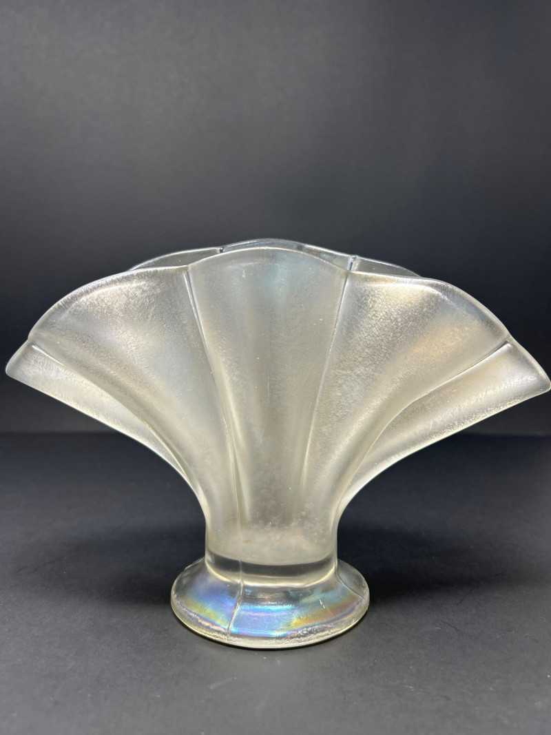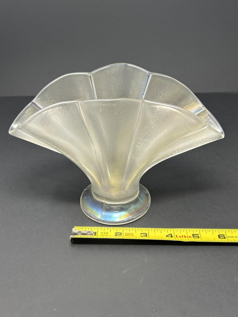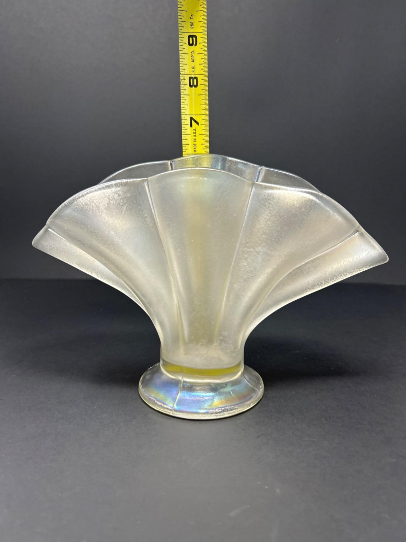 A luminous vintage Fenton fan vase crafted in frosted satin glass with a radiant opalescent sheen. This elegant piece features a flared, fan-shaped silhouette with scalloped edges and a soft iridescence that dances across its surface under light. Measuring approximately 7 inches tall and 8 inches wide, it captures the romantic charm and craftsmanship of mid-century Fenton glassware. The vase’s translucent body glows with pastel undertones—subtle hints of pink, blue, and gold shimmer through its pearlescent finish. Its molded glass form evokes stylized petals or shell motifs, making it a standout accent for vanity displays, vintage lighting setups, or curated glass collections. Height: approx. 7 inches Width (rim): approx. 8 inches Base diameter: approx. 3 inches Typical of certain Fenton production runs. Likely dates from the 1950s–1970s. May have originally served as a lamp shade or decorative vase. Ideal for collectors of Fenton, opalescent glass, or romantic vintage décor.Dimensions: