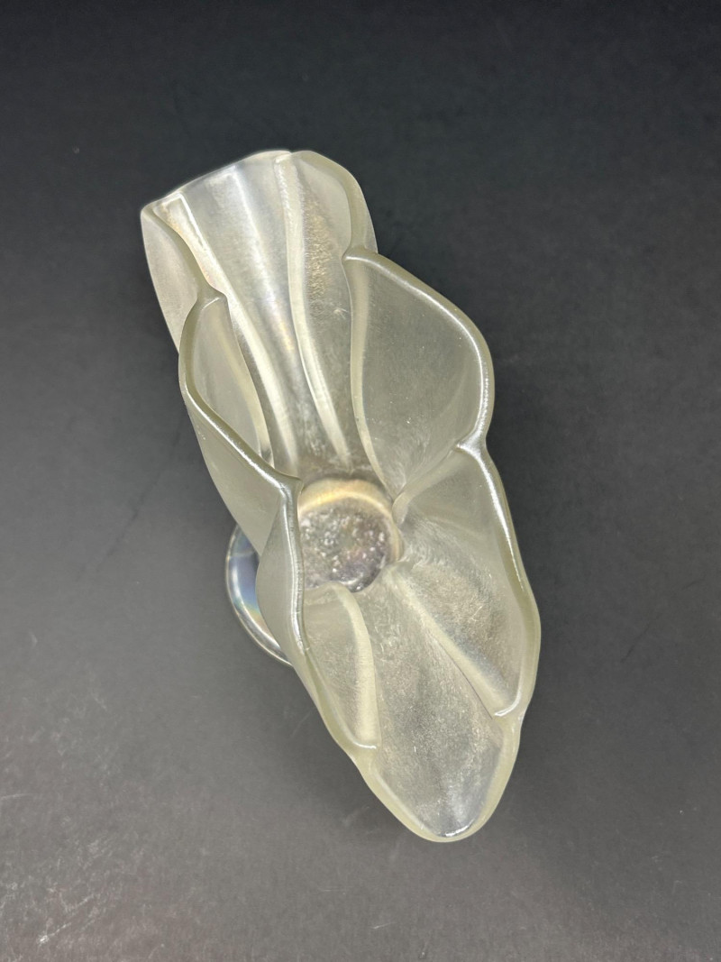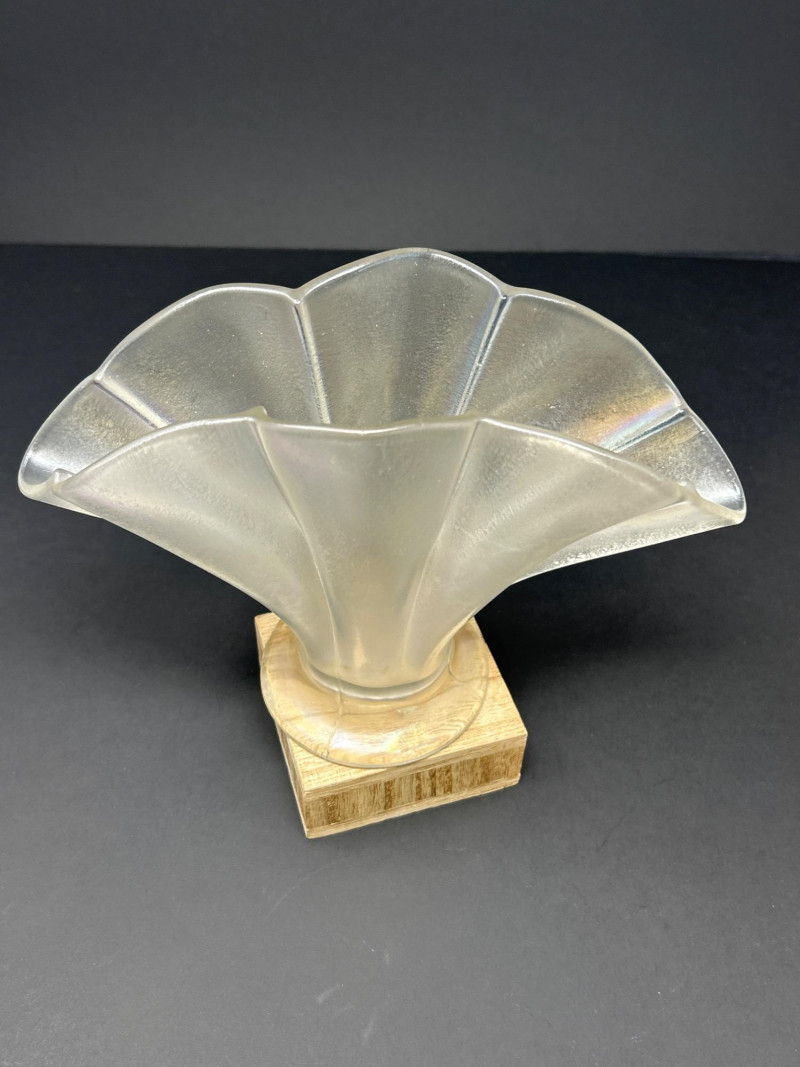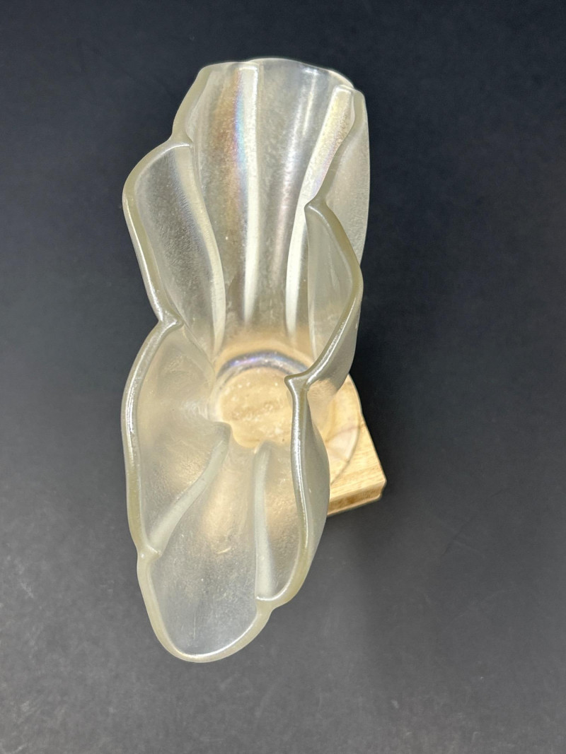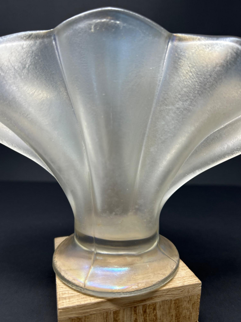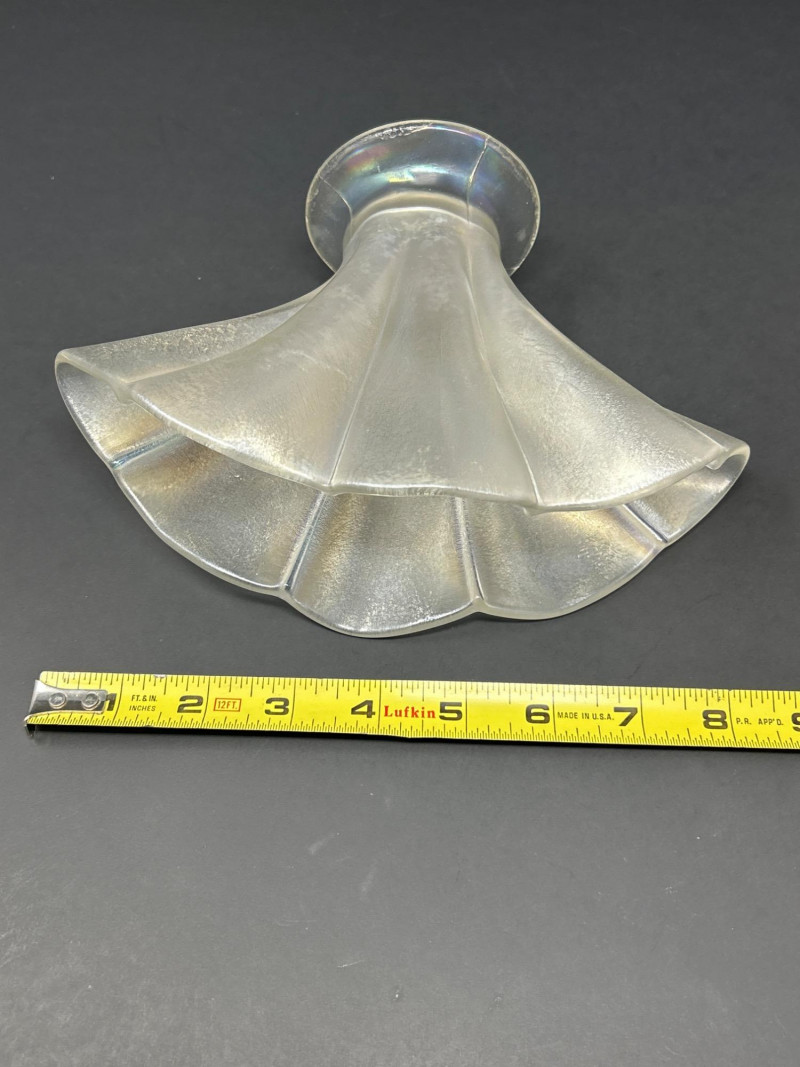 A luminous vintage Fenton fan vase crafted in frosted satin glass with a radiant opalescent sheen. This elegant piece features a flared, fan-shaped silhouette with scalloped edges and a soft iridescence that dances across its surface under light. Measuring approximately 7 inches tall and 8 inches wide, it captures the romantic charm and craftsmanship of mid-century Fenton glassware. The vase’s translucent body glows with pastel undertones—subtle hints of pink, blue, and gold shimmer through its pearlescent finish. Its molded glass form evokes stylized petals or shell motifs, making it a standout accent for vanity displays, vintage lighting setups, or curated glass collections. Height: approx. 7 inches Width (rim): approx. 8 inches Base diameter: approx. 3 inches Typical of certain Fenton production runs. Likely dates from the 1950s–1970s. May have originally served as a lamp shade or decorative vase. Ideal for collectors of Fenton, opalescent glass, or romantic vintage décor.Dimensions: