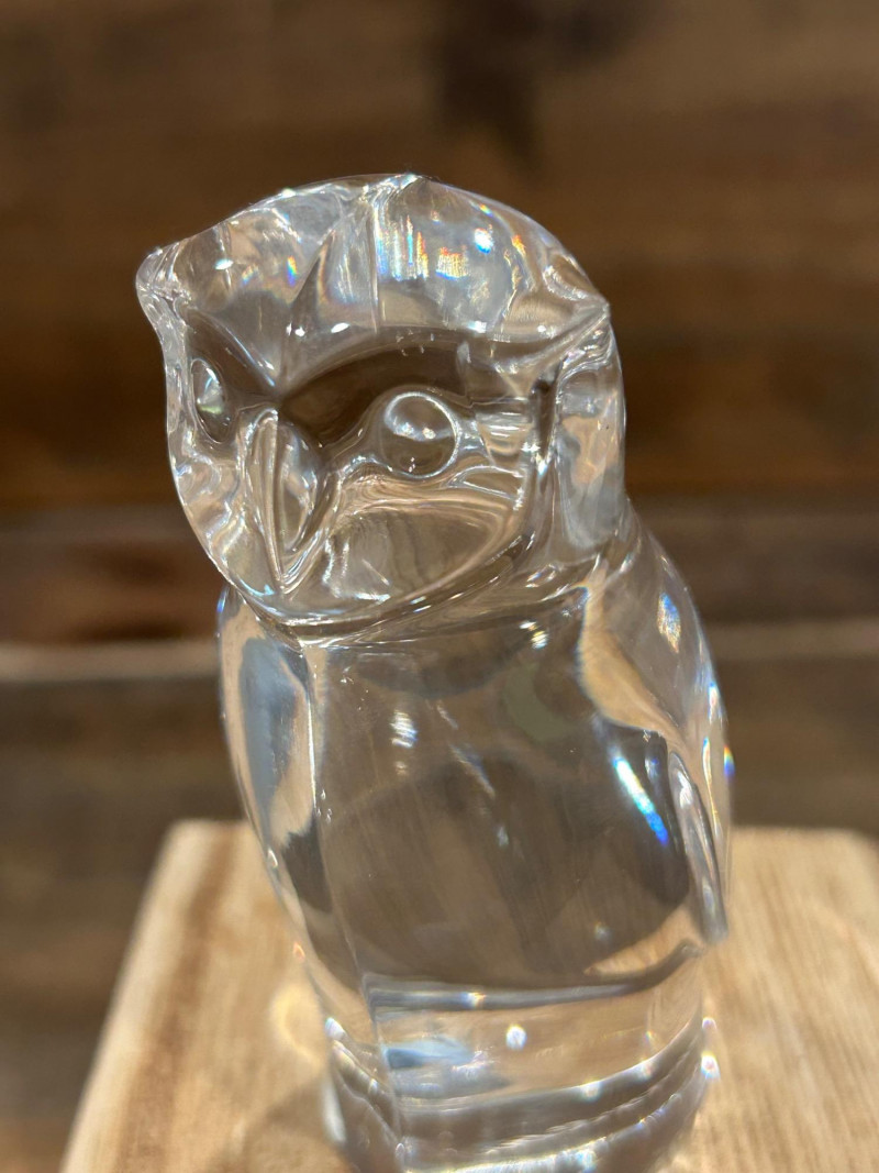 Design: Stylized owl form with sharply defined beak and wing contours, featuring smooth surfaces and geometric symmetry. The solid crystal body refracts light beautifully, emphasizing the precision of its craftsmanship.