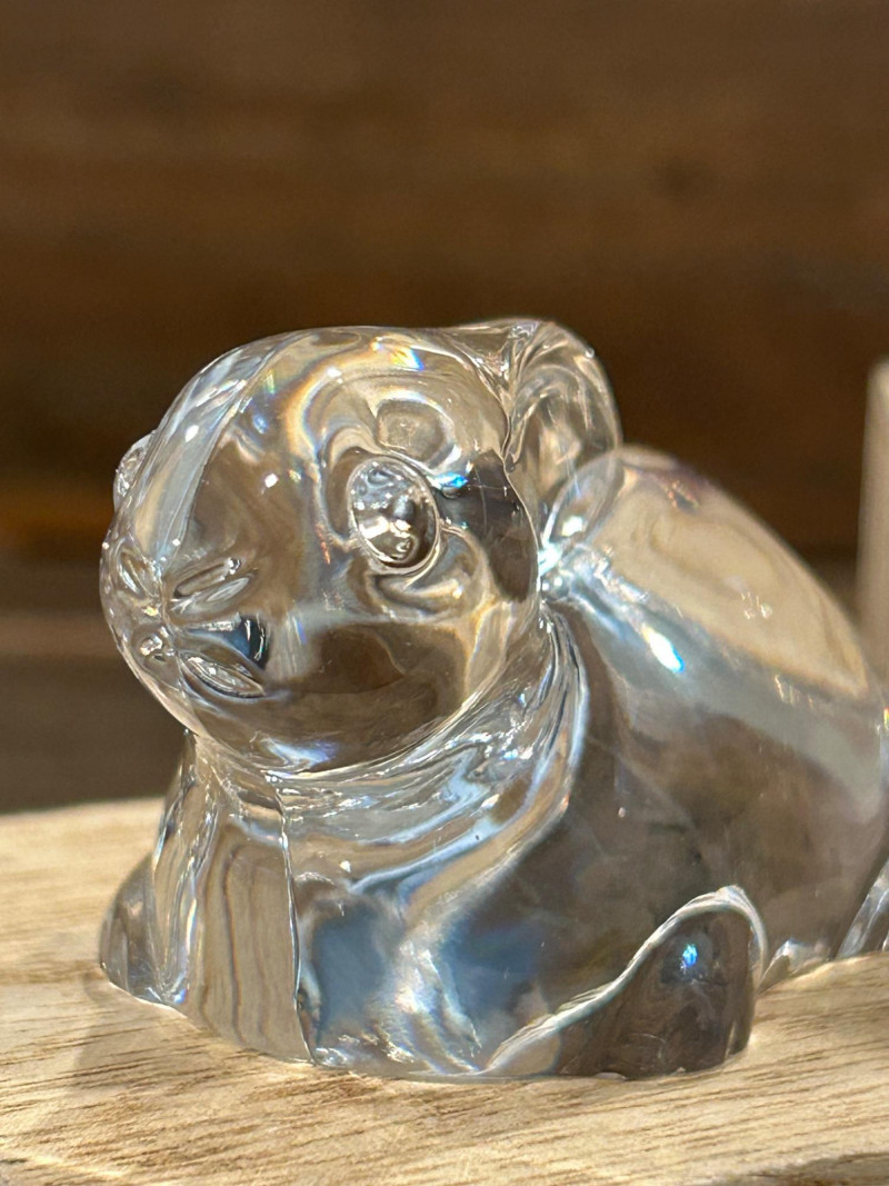 Design: Reclining rabbit with soft rounded lines and gently modeled ears, expertly shaped from solid clear crystal. The piece reflects light with a warm, fluid brilliance.