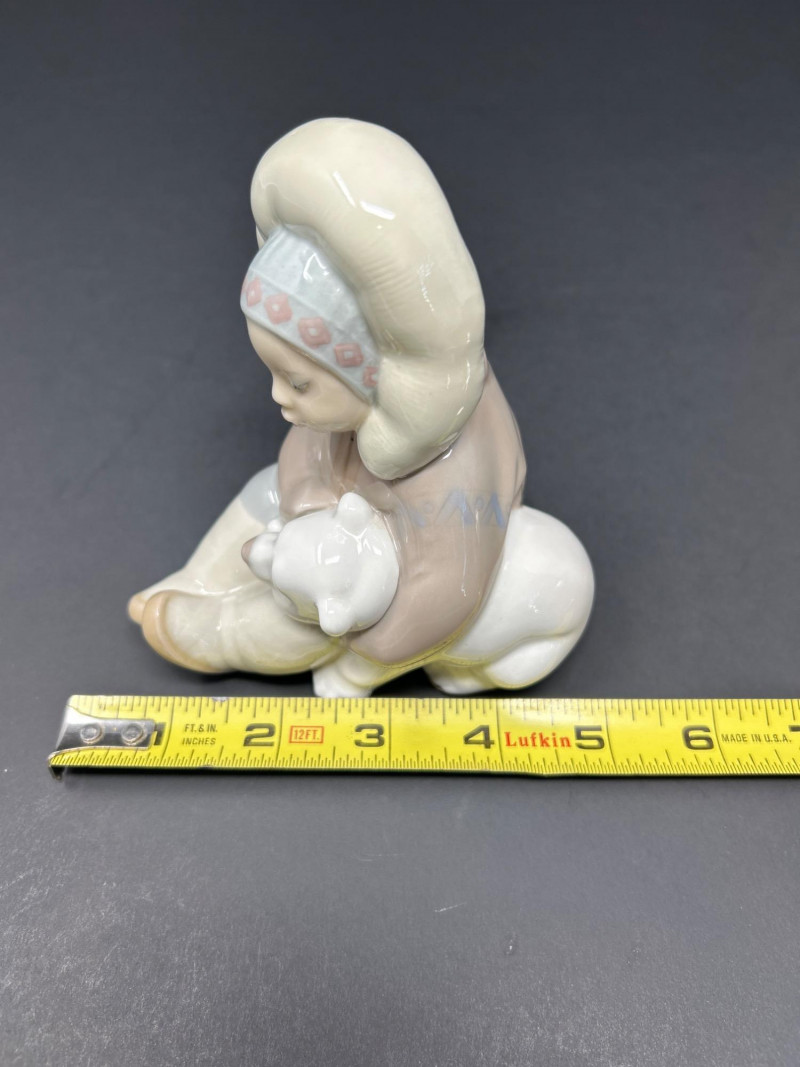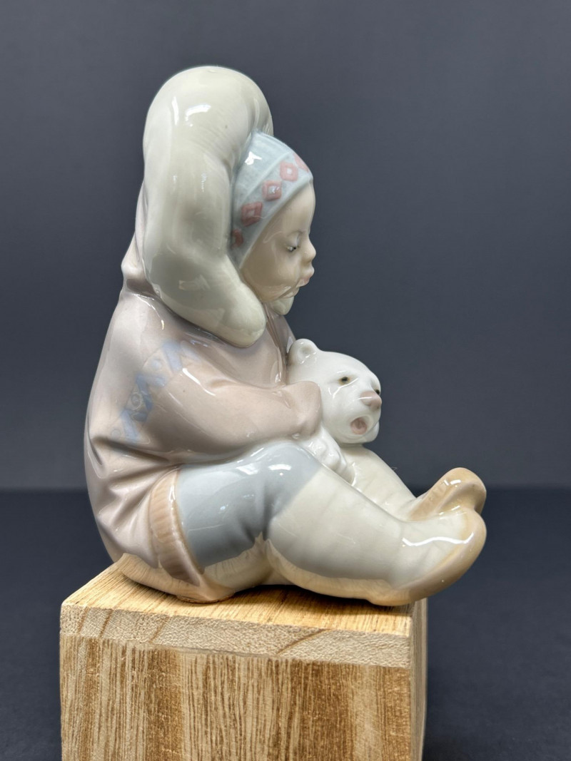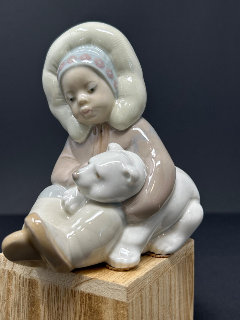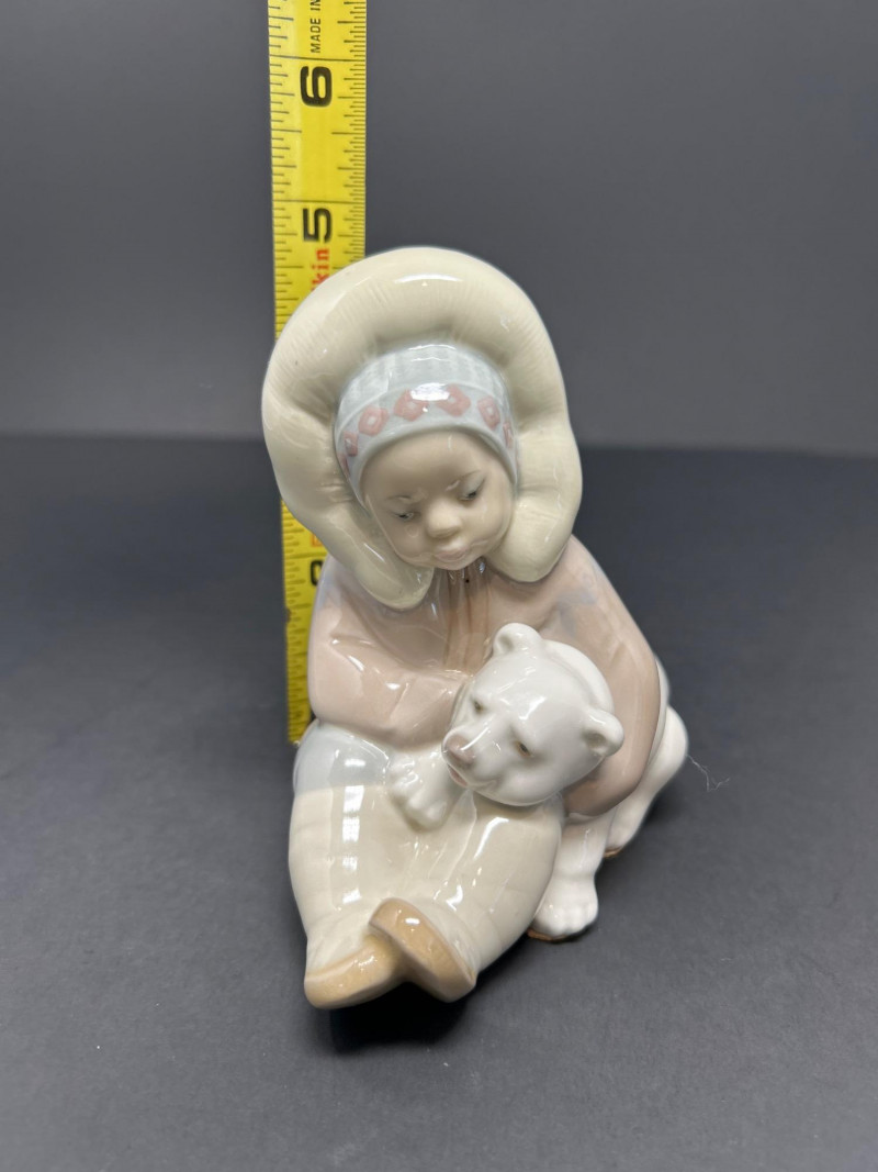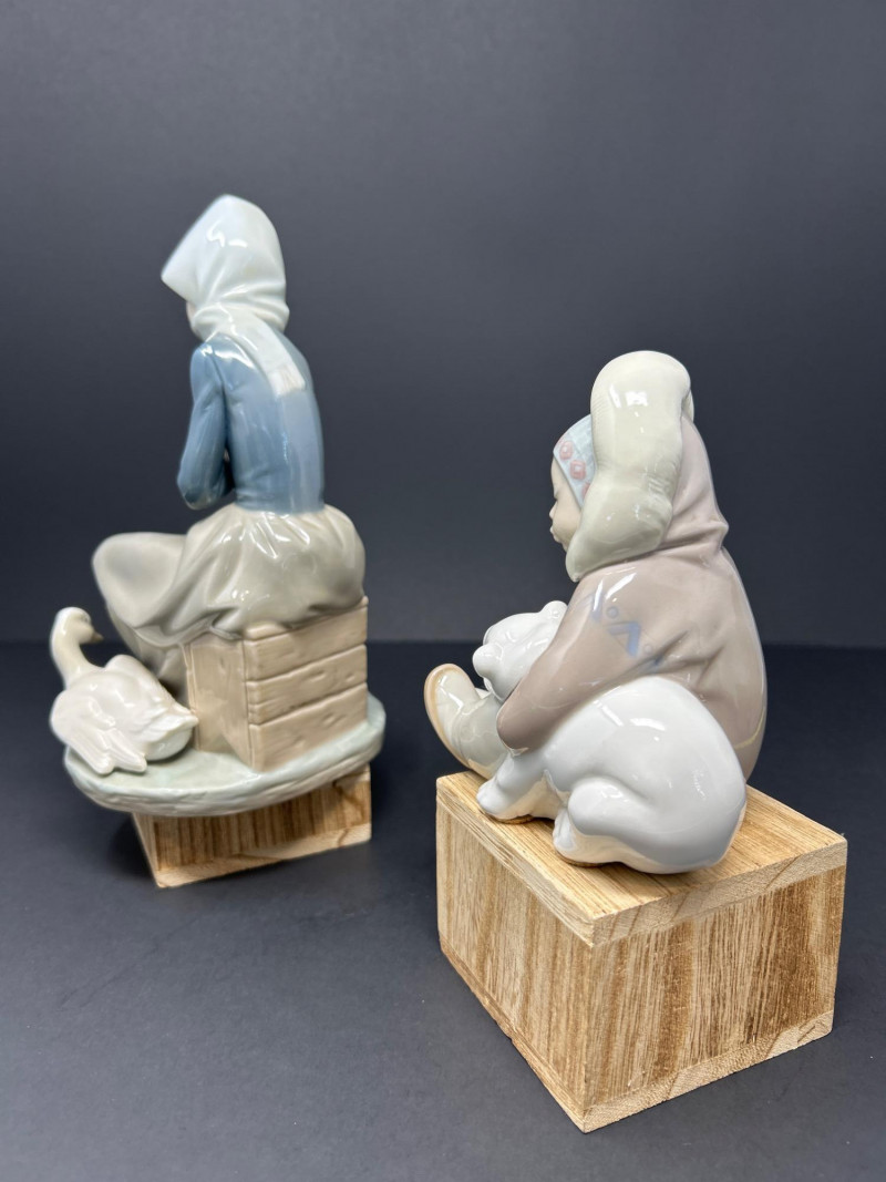 LLADRÓ “Duck Seller” Dimensions: Approx. 7" tall Color: Soft pastel palette – ivory, beige, and pale blue Origin: Handcrafted in Spain; marked “LLADRÓ” on underside Design: Seated woman in bonnet and apron, arms gently crossed. Accompanied by a white duck and a woven basket filled with ducklings. Glossy porcelain finish with delicate sculptural detail. Style Notes: A retired LLADRÓ classic evoking pastoral charm and maternal serenity. Highly collectible and ideal for rustic or vintage-themed displays. LLADRÓ “Eskimo Playing” #1195 Dimensions: Approx. 4¼" tall x 3¾" wide Color: Soft white, blush pink, and beige tones Origin: Issued 1972, retired 2007; marked “LLADRÓ” on underside Design: Child in traditional winter attire, seated and playfully interacting with a polar bear cub. Rounded forms and gentle expressions highlight LLADRÓ’s signature warmth and craftsmanship. Style Notes: A whimsical, heartwarming piece from LLADRÓ’s childhood series. Comes with original box. Perfect for collectors of retired European porcelain.